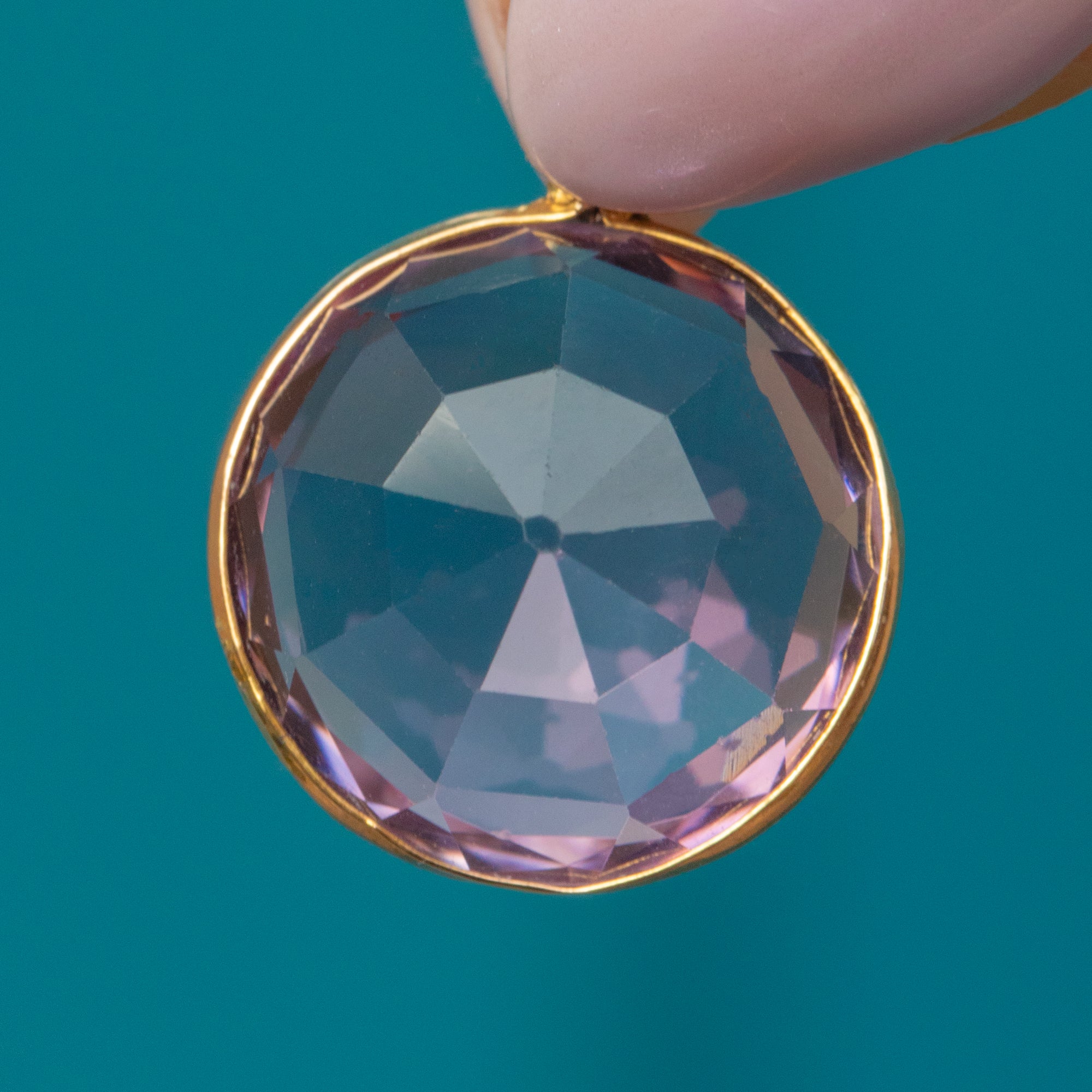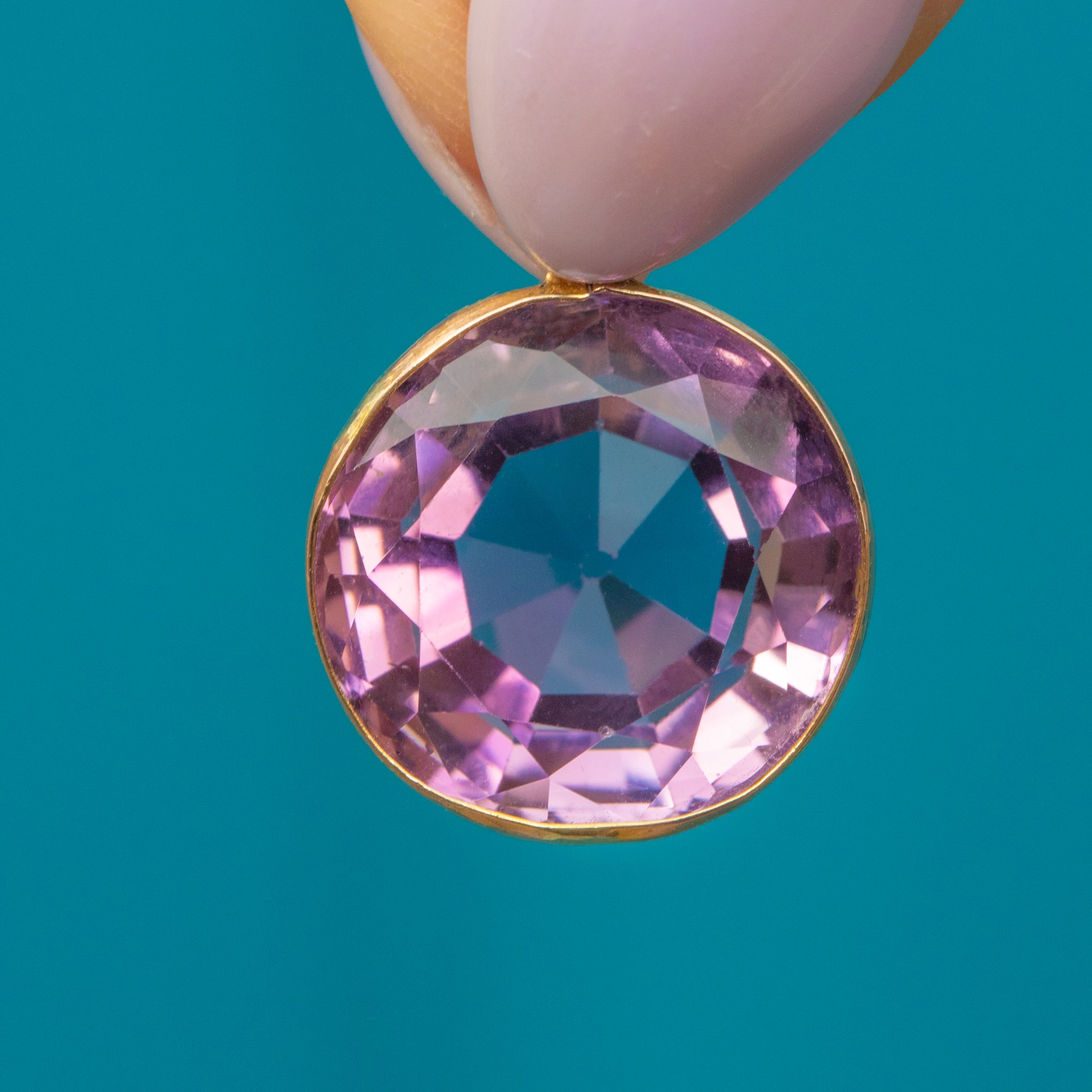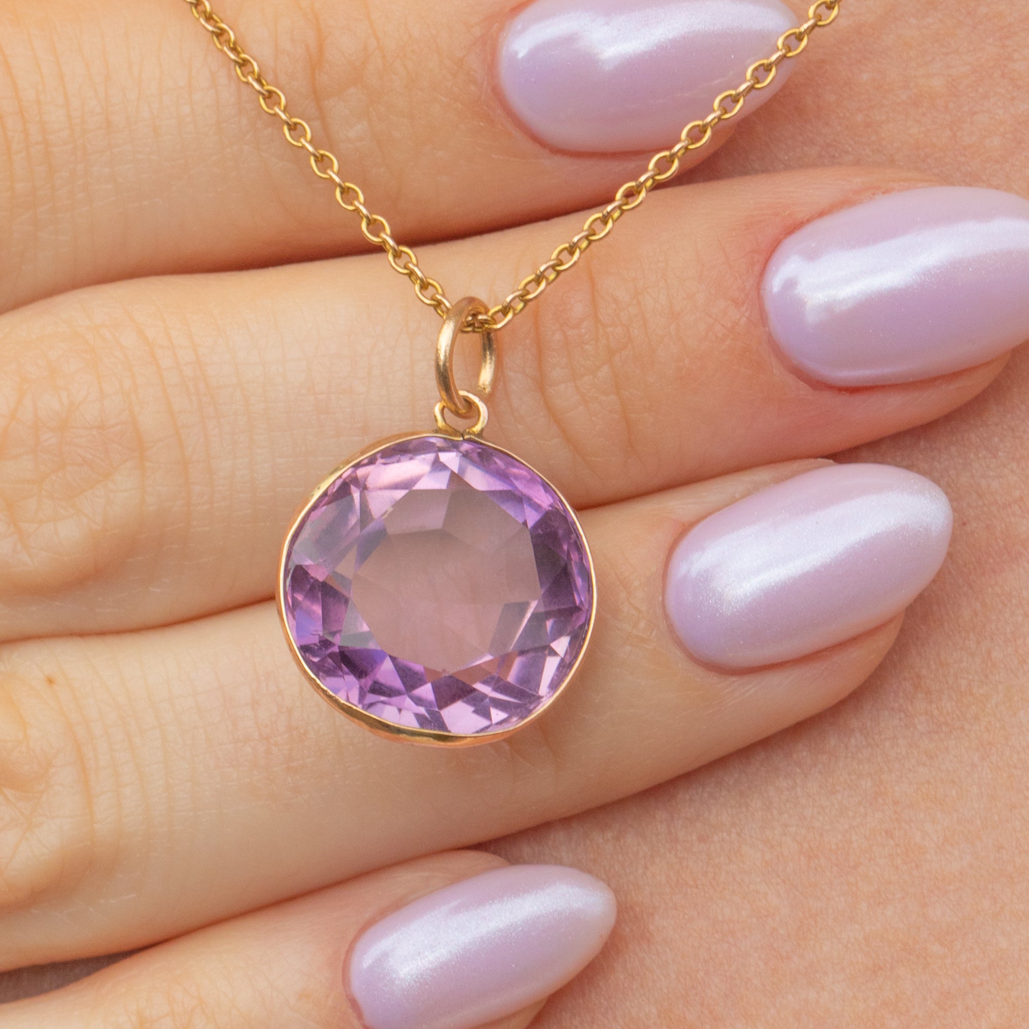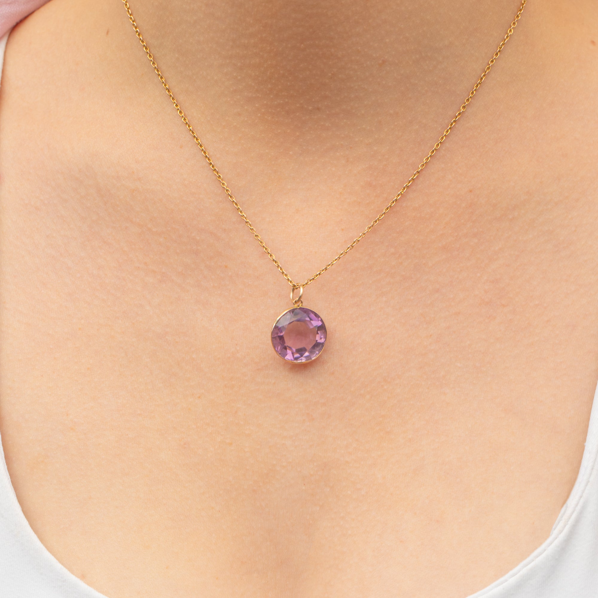 VERY GOOD. This antique 9ct Gold Rose De France Amethyst pendant is in very good condition. The Amethyst has a gorgeous lavender hue, and while she does have a few minor scuffs, it is not evident during wear. She also has a small inclusion, adding to her unique charm. The bezel is smooth and holds the Amethyst securely, fitted with a sturdy jump ring that suspends the pendant elegantly.