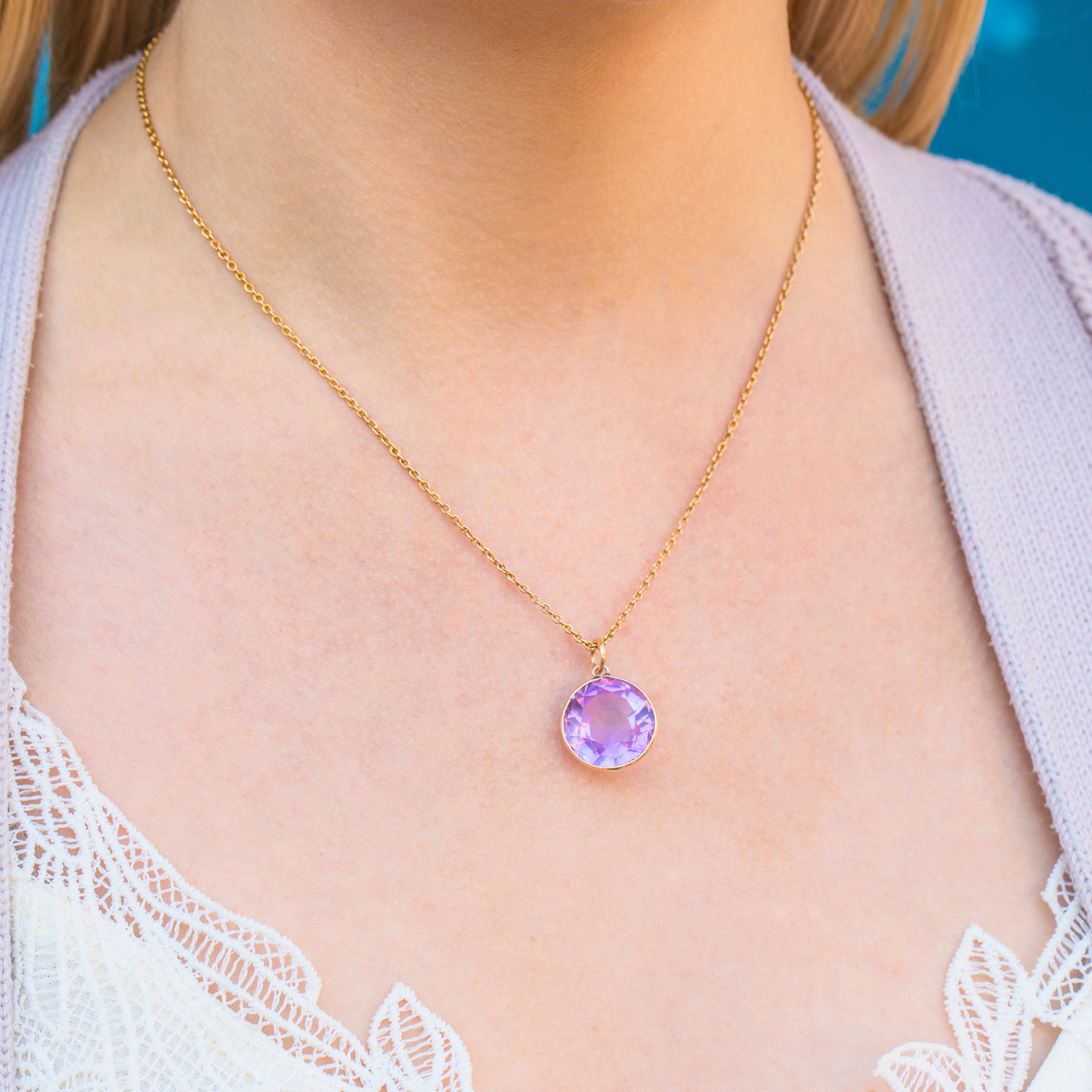 VERY GOOD. This antique 9ct Gold round Amethyst pendant is in a very good condition. The Amethyst has a gorgeous lilac hue and while she has one or two tiny fleabites on the back, this is not visible during wear. The Amethyst is securely set in her setting, allowing for confident and secure wear.