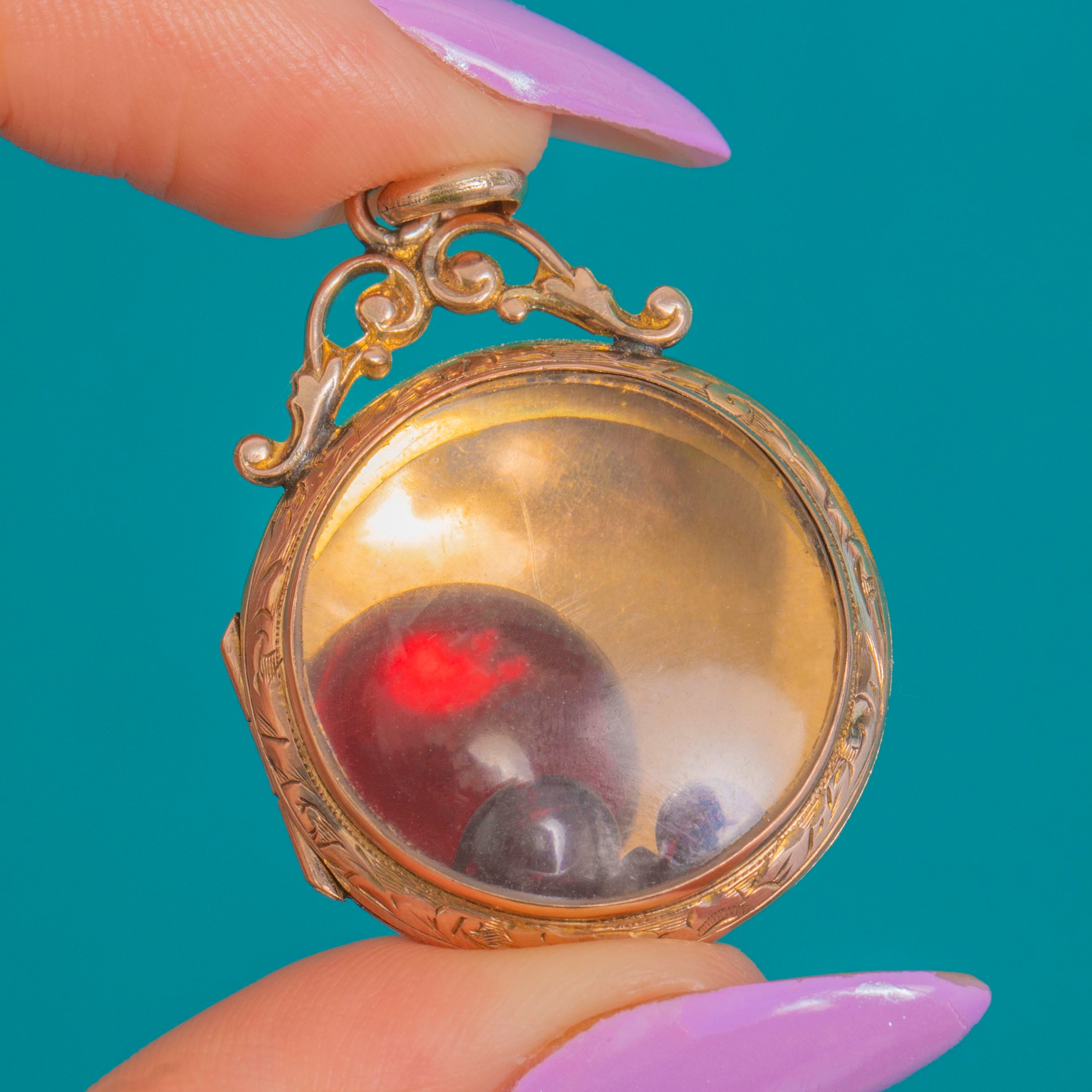 This Victorian shaker locket in 9ct Gold is an enchanting keepsake, showcasing a clear domed glass front within an engraved foliate bezel and an ornate scroll bail. Romantic and refined, the loose Garnet cabochons dance within the chamber, catching the light with every movement for a playful yet elegant sparkle.