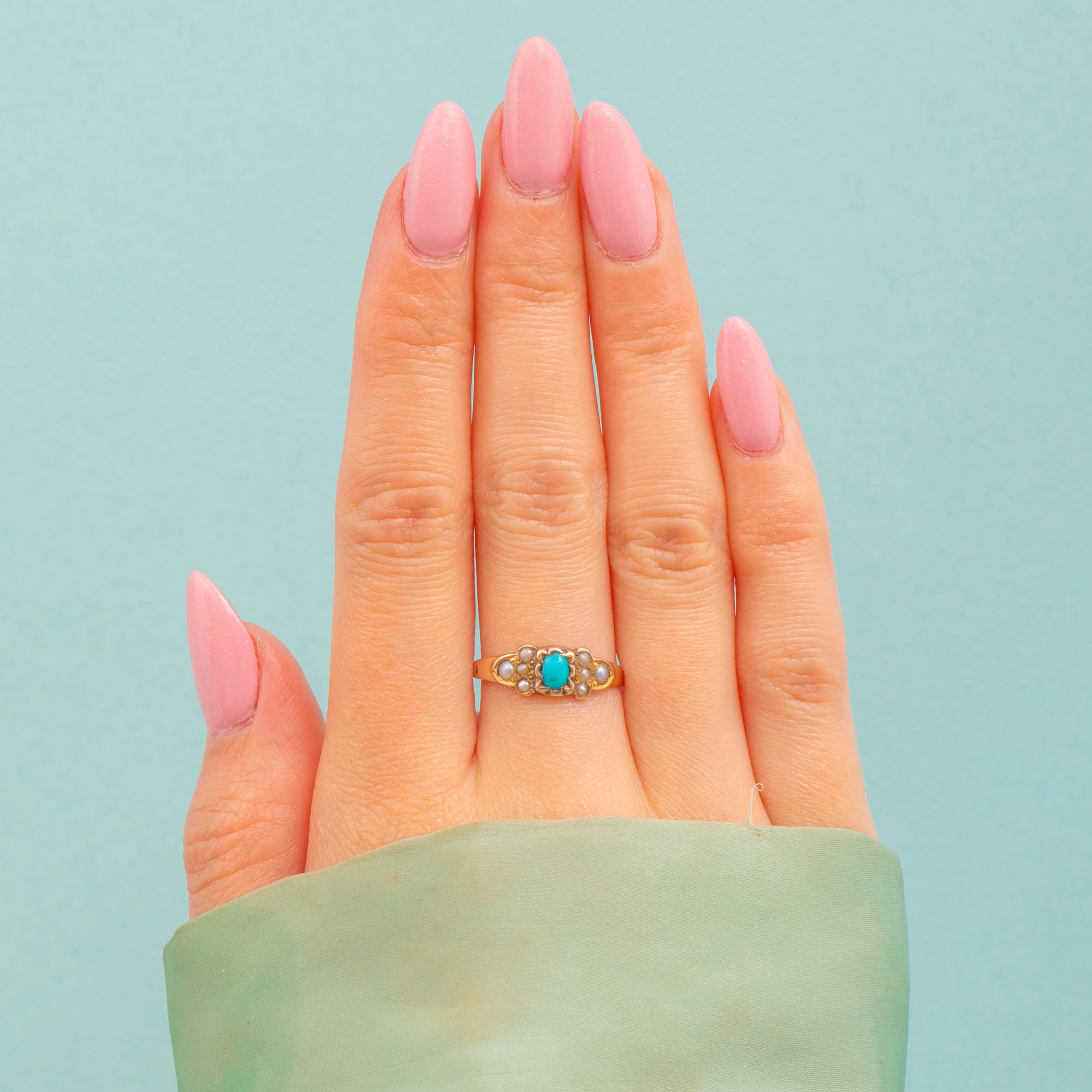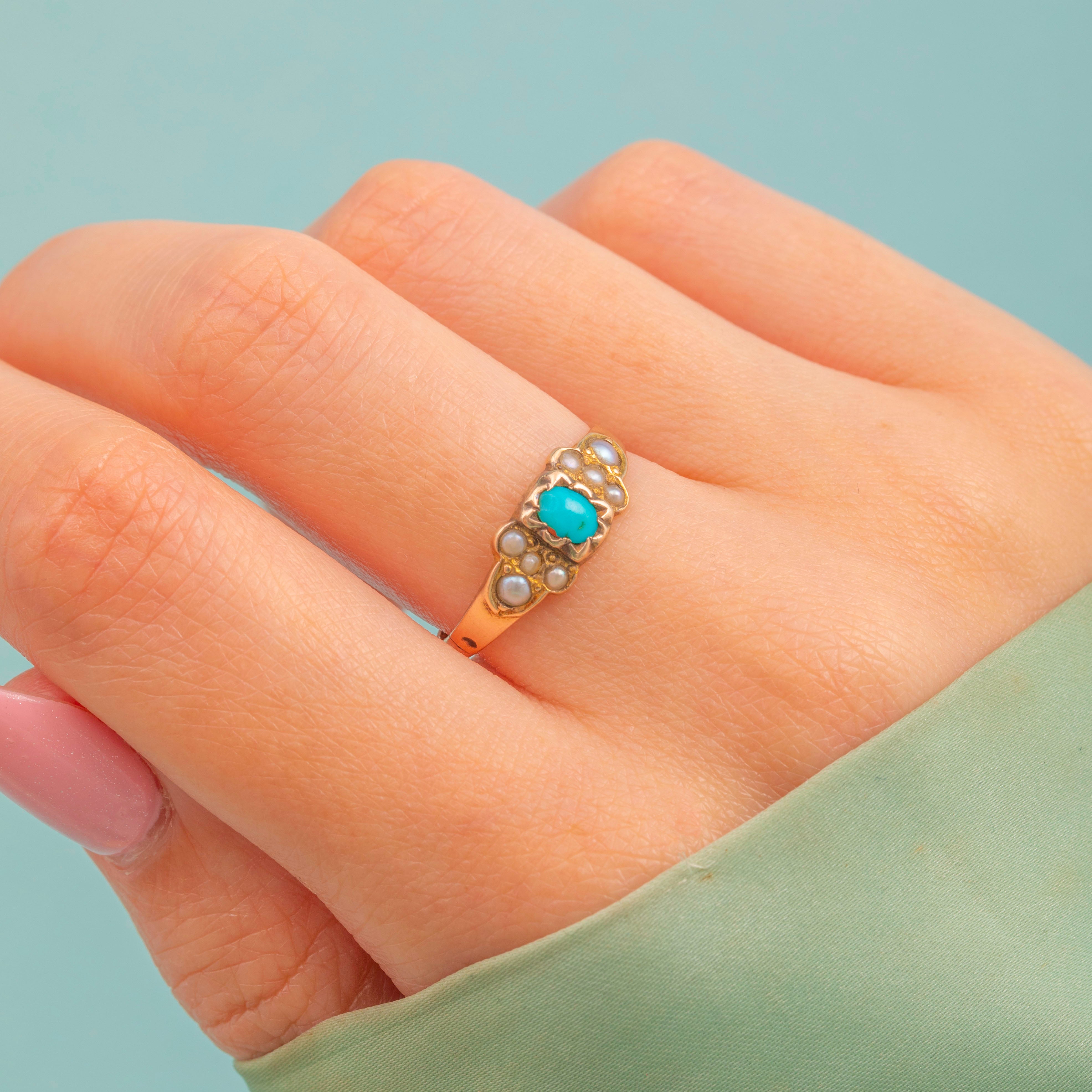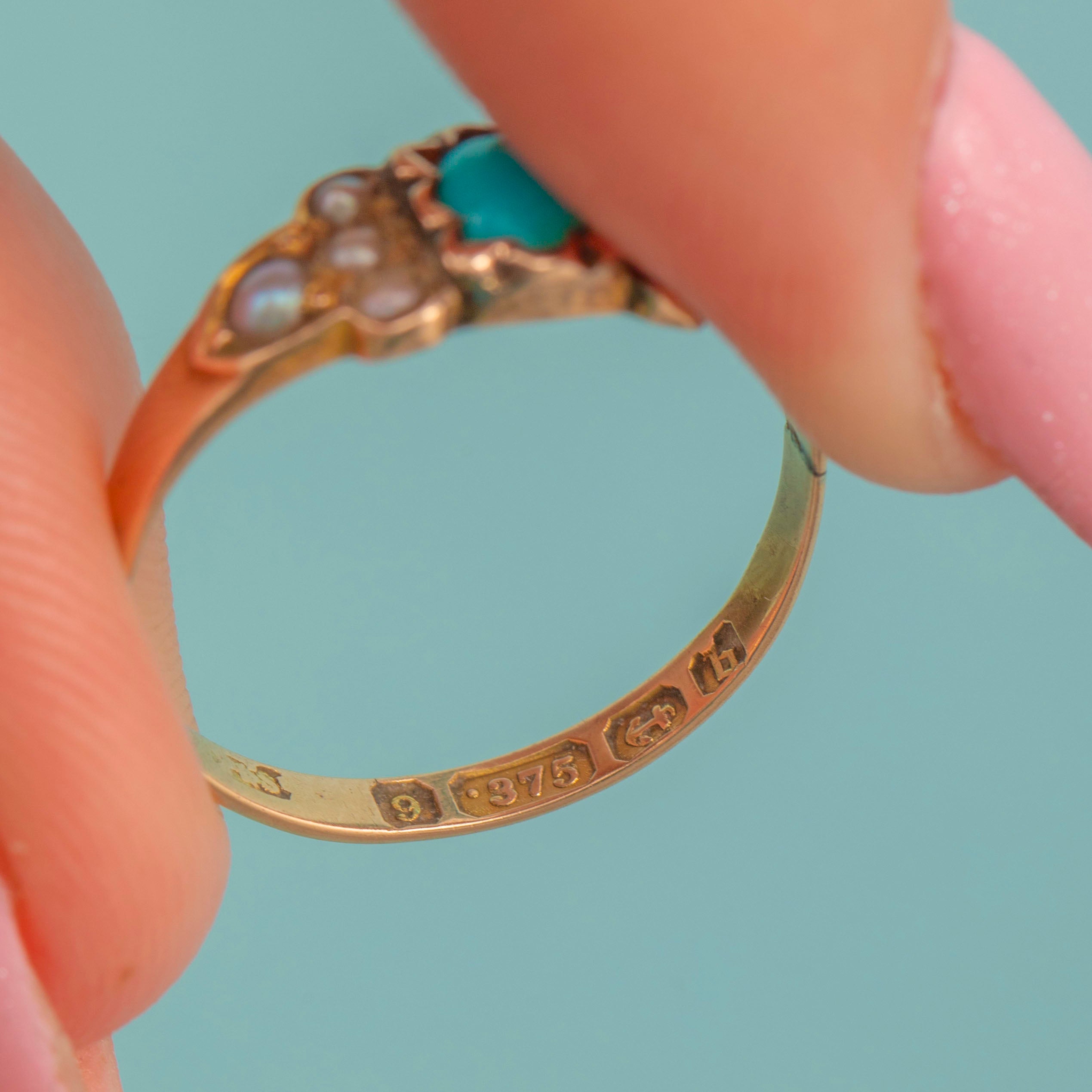 This antique 9ct Gold Turquoise Pearl ring is a lovely little treasure! Finely crafted from buttery 9ct Gold and displaying a lovely selection of gemstones, this Victorian ring comes complete with a full set of hallmarks dating to 1876.