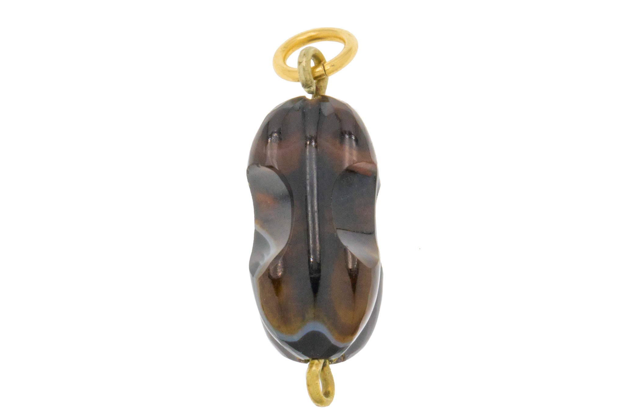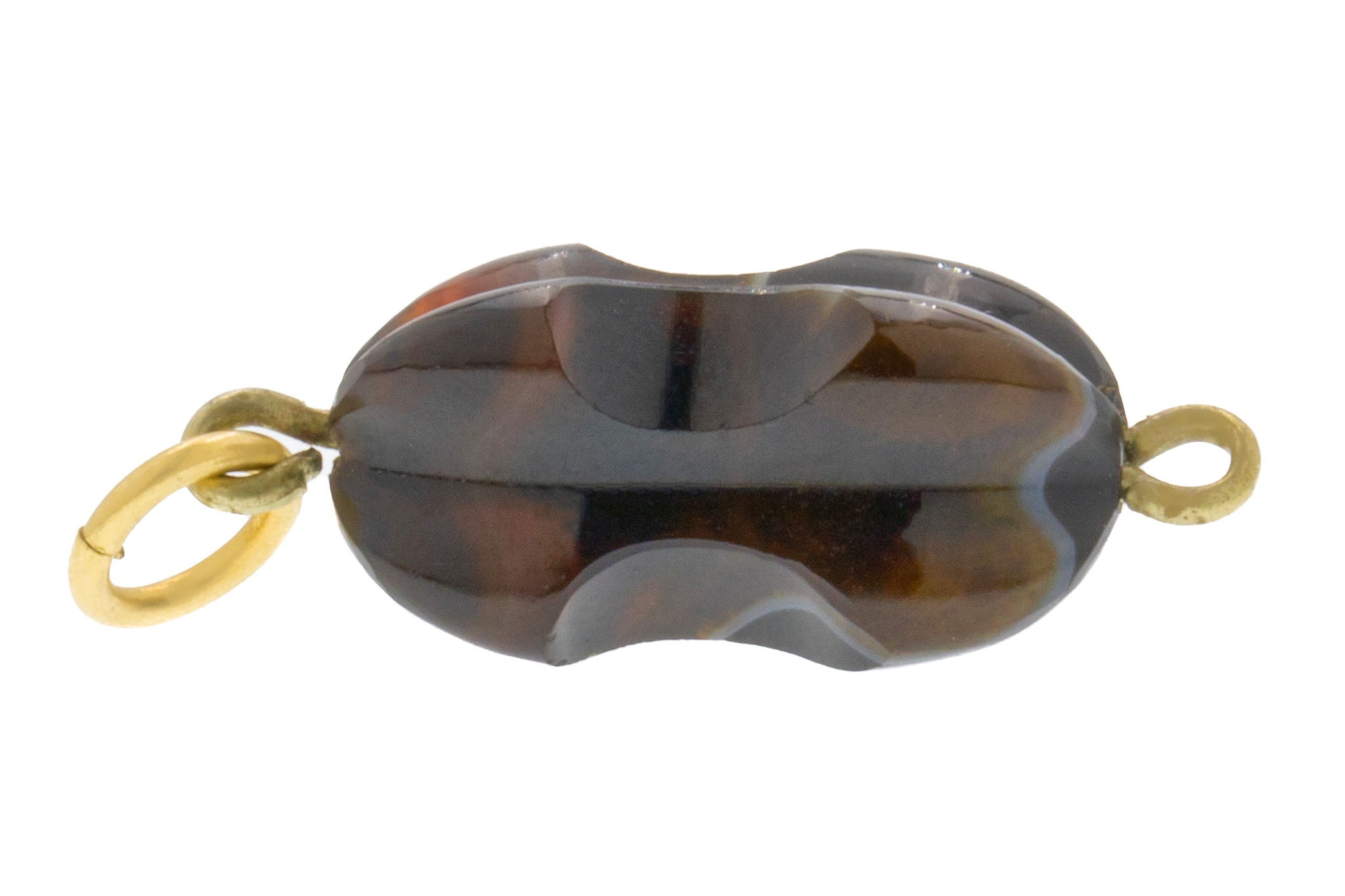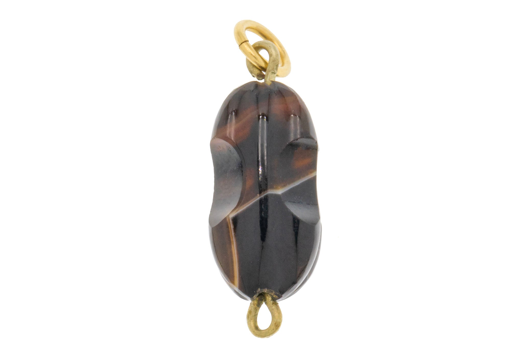 VERY GOOD. This antique carved Agate charm is in very good condition. The Agate is smooth with only some minor scratches, but her deep chocolate tones mask this well. The jump-ring is sturdy allowing you to securely suspend her from a chain of your choice. She will make a fantastic addition to any jewellery collection!