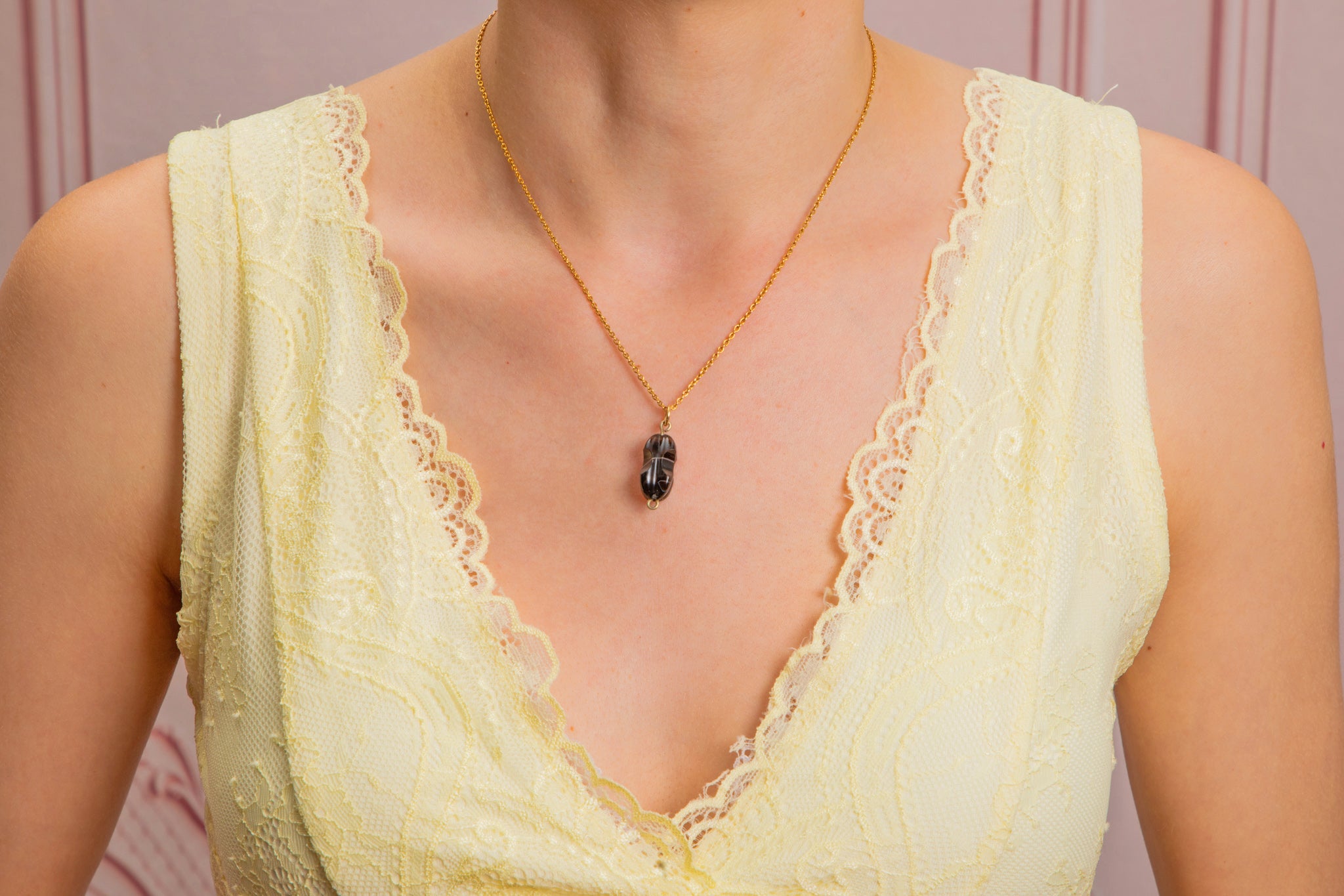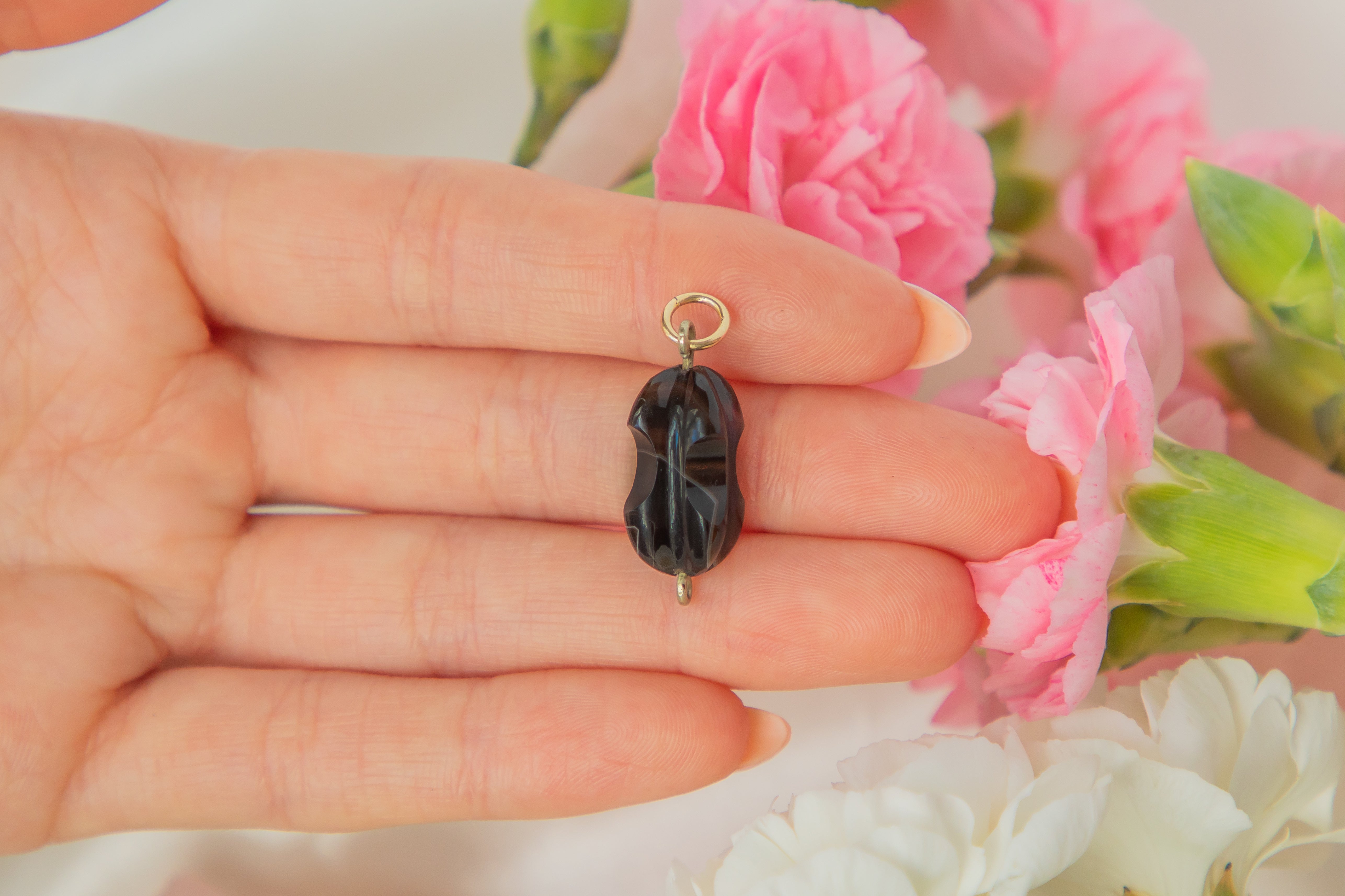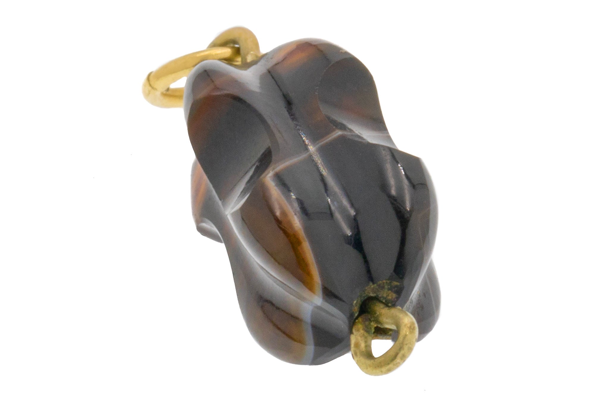 VERY GOOD. This antique carved Agate charm is in very good condition. The Agate is smooth with only some minor scratches, but her deep chocolate tones mask this well. The jump-ring is sturdy allowing you to securely suspend her from a chain of your choice. She will make a fantastic addition to any jewellery collection!