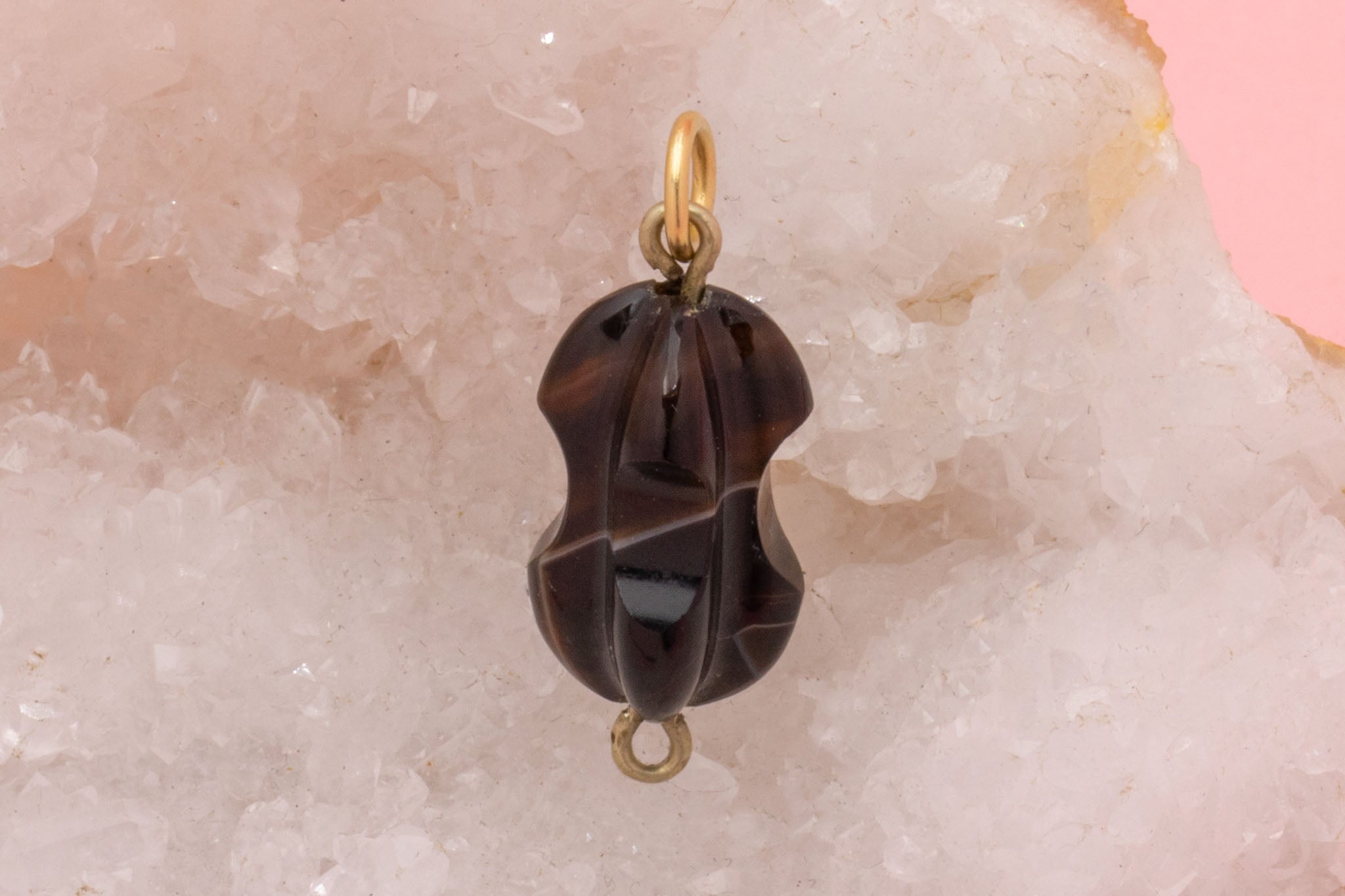 We are stunned by the craftsmanship of this antique carved Agate charm! Carved with precision, her Agate is formed into an intricately geometric shape, with satisfying symmetry throughout. Boasting a deep mocha hue, creamy lines of marble dance across her smooth surface, making her look delicious enough to eat!