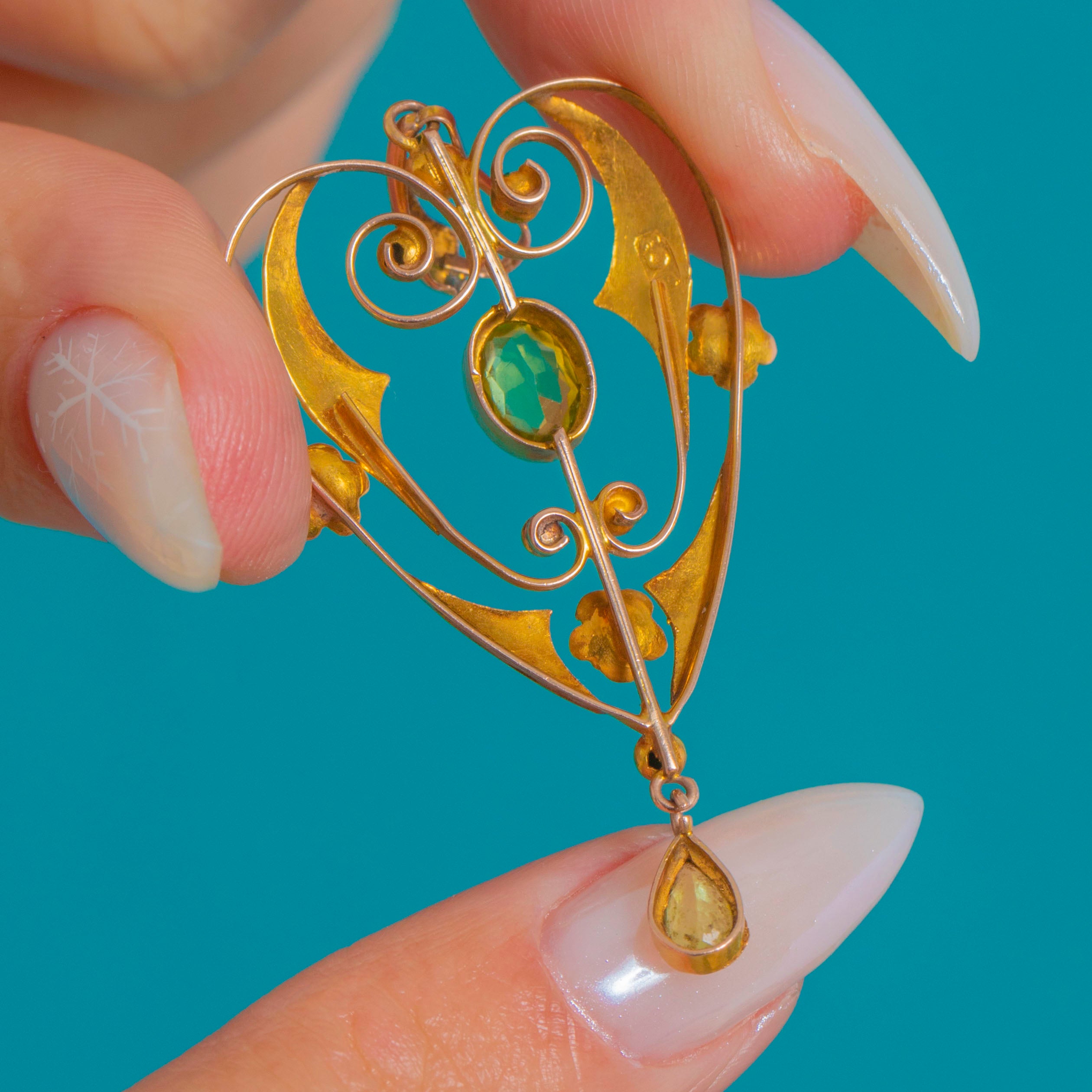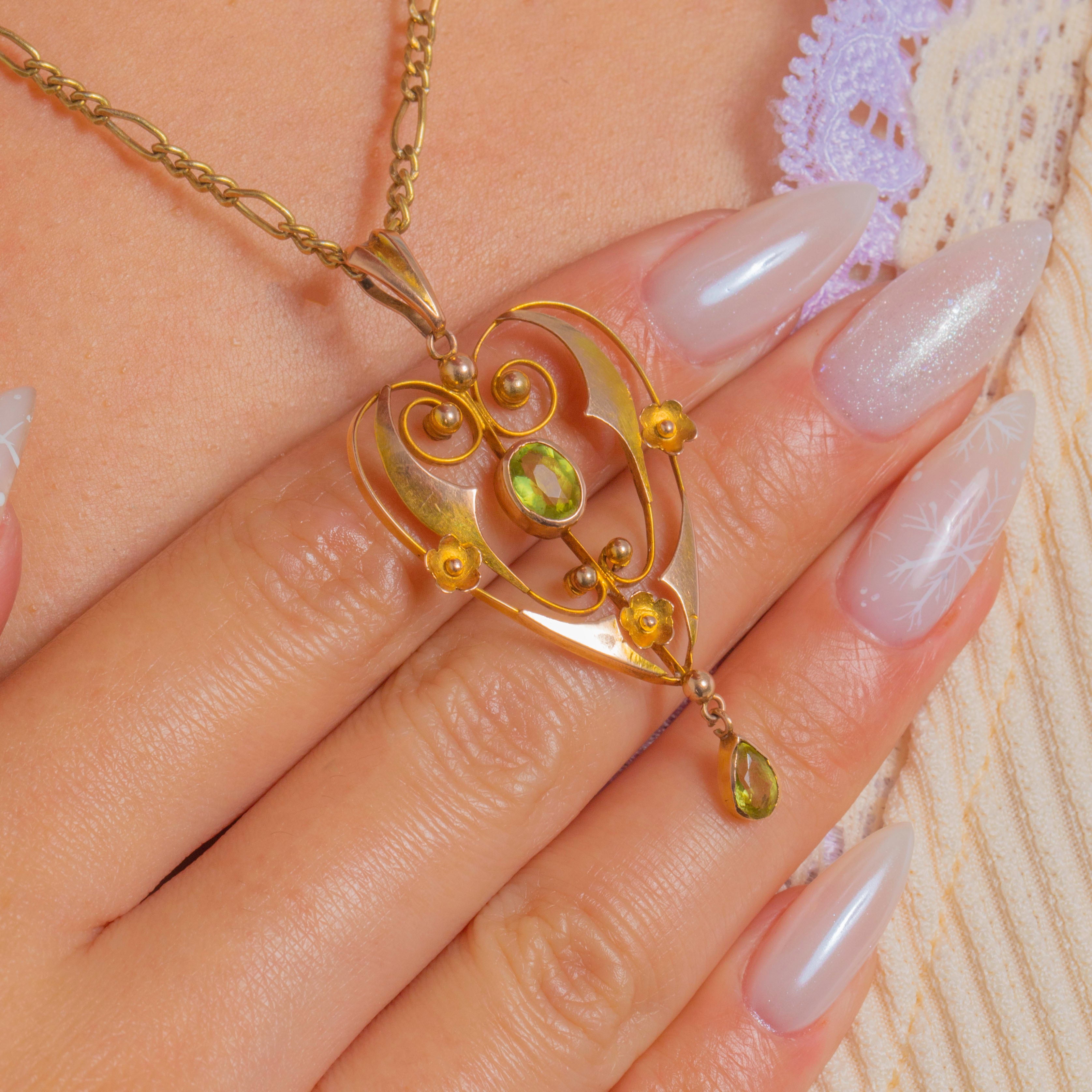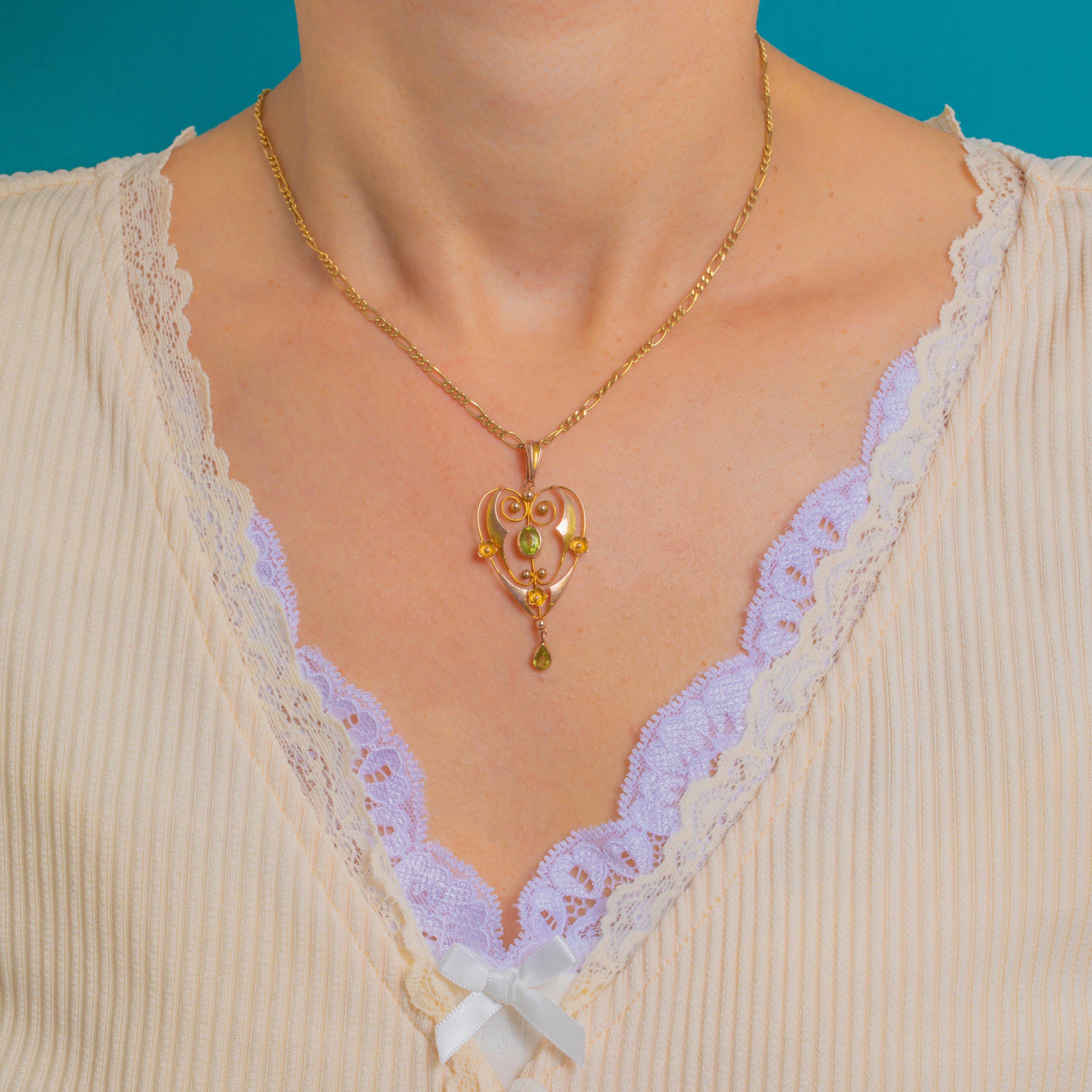 An antique Edwardian lavalier pendant in 9ct Gold, with sinuous whiplash scrolls that trace a graceful heart‑lyre silhouette, punctuated by petite rosettes and granule accents. At the centre glows an oval Peridot, with a matching pear‑shaped drop that sways delicately below; together the vivid apple‑green gems total approximately 1.00ct.