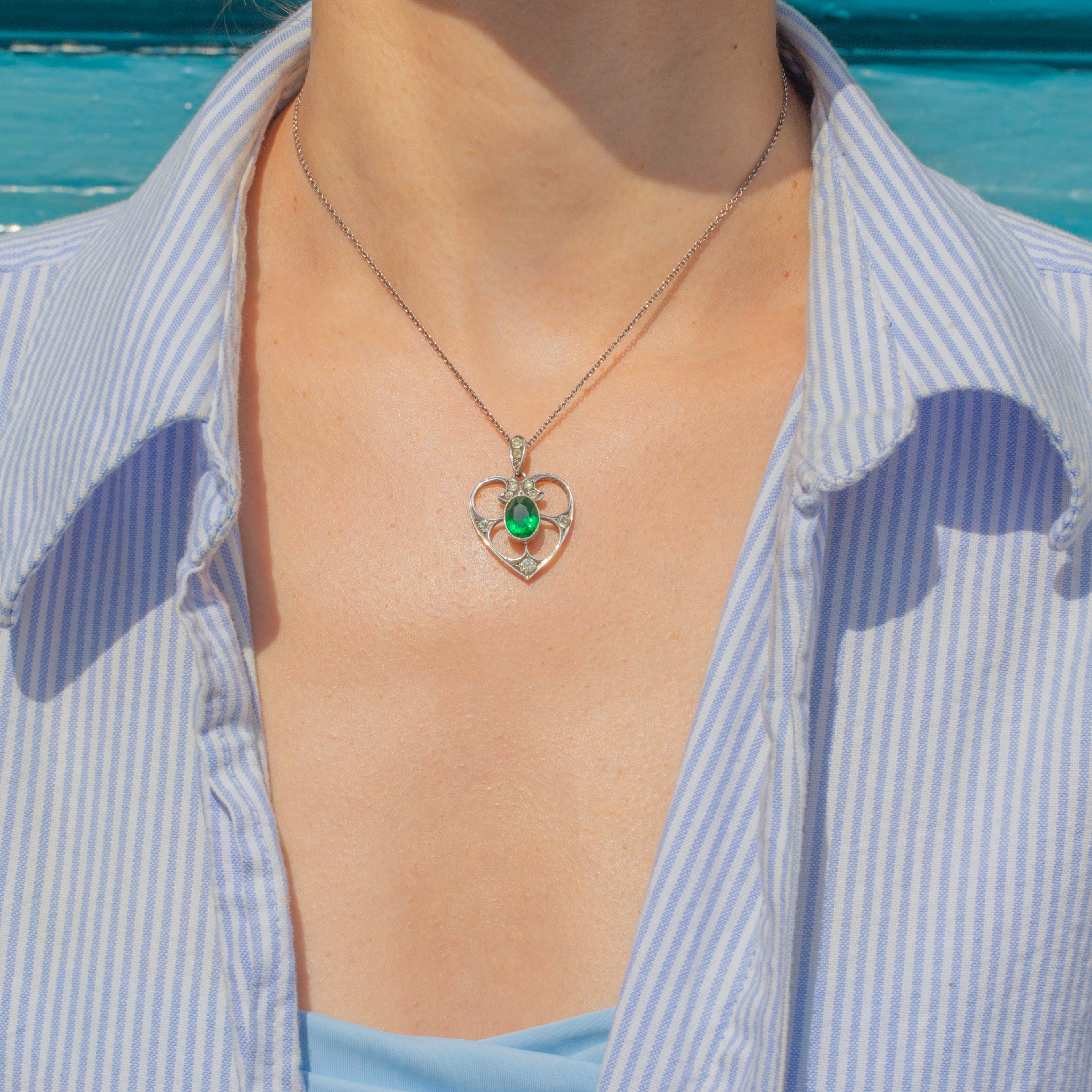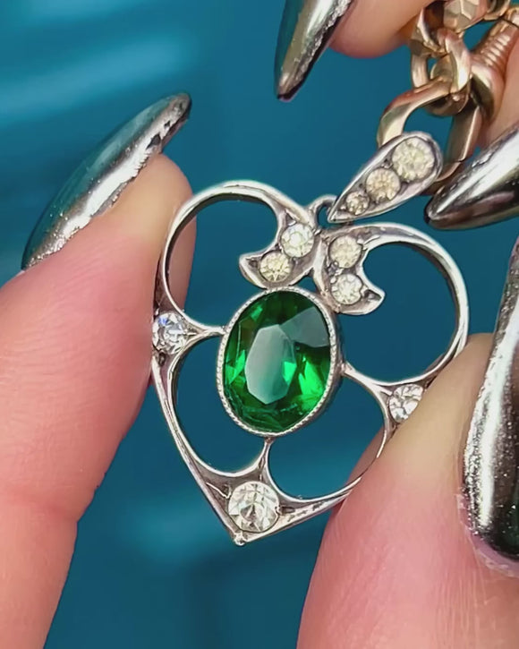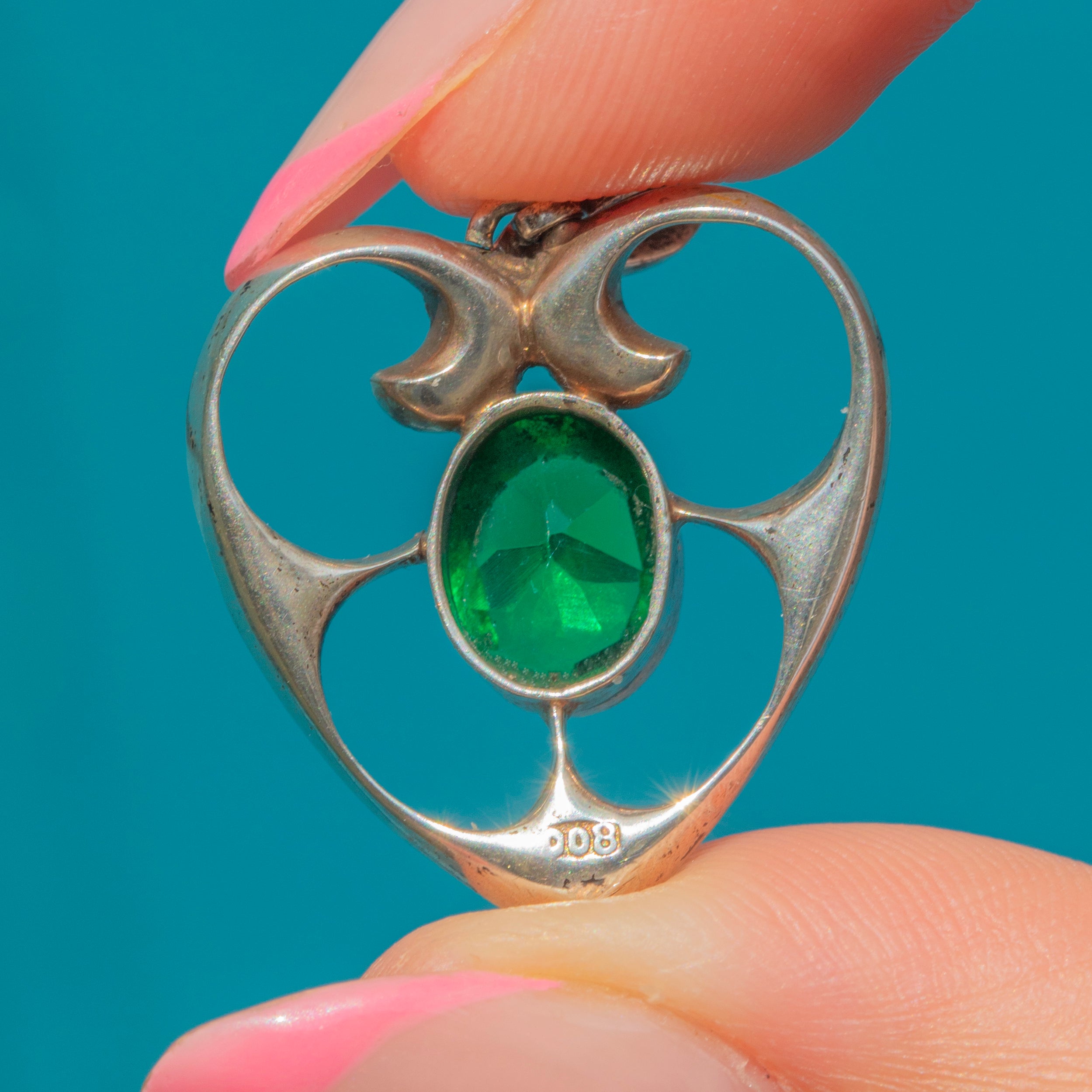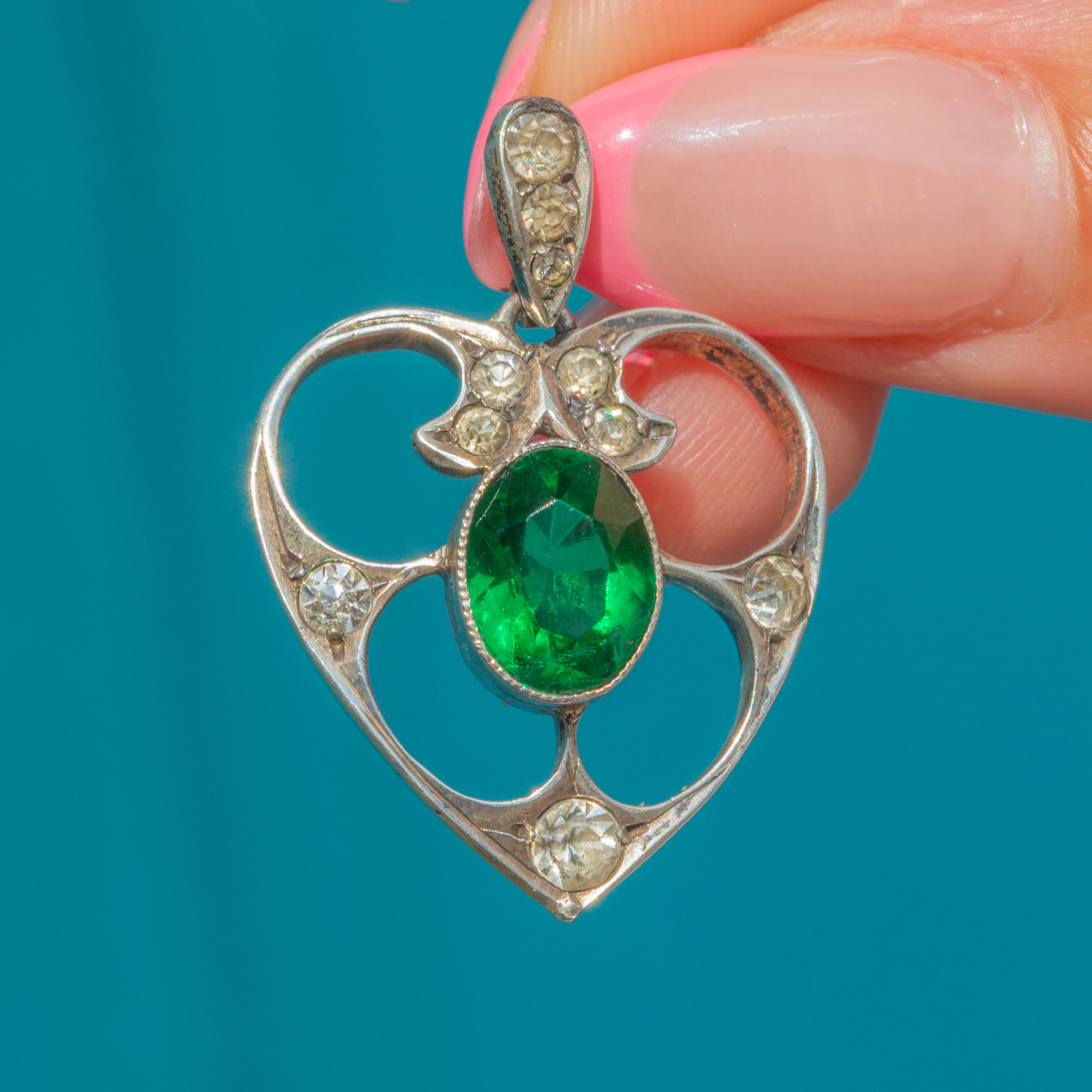 Fall in love with this antique European Silver green Paste heart pendant! This bewitching piece boasts a vivid green Paste, making a striking focal point, framed by curvaceous Silver details enhanced by bright white Paste.