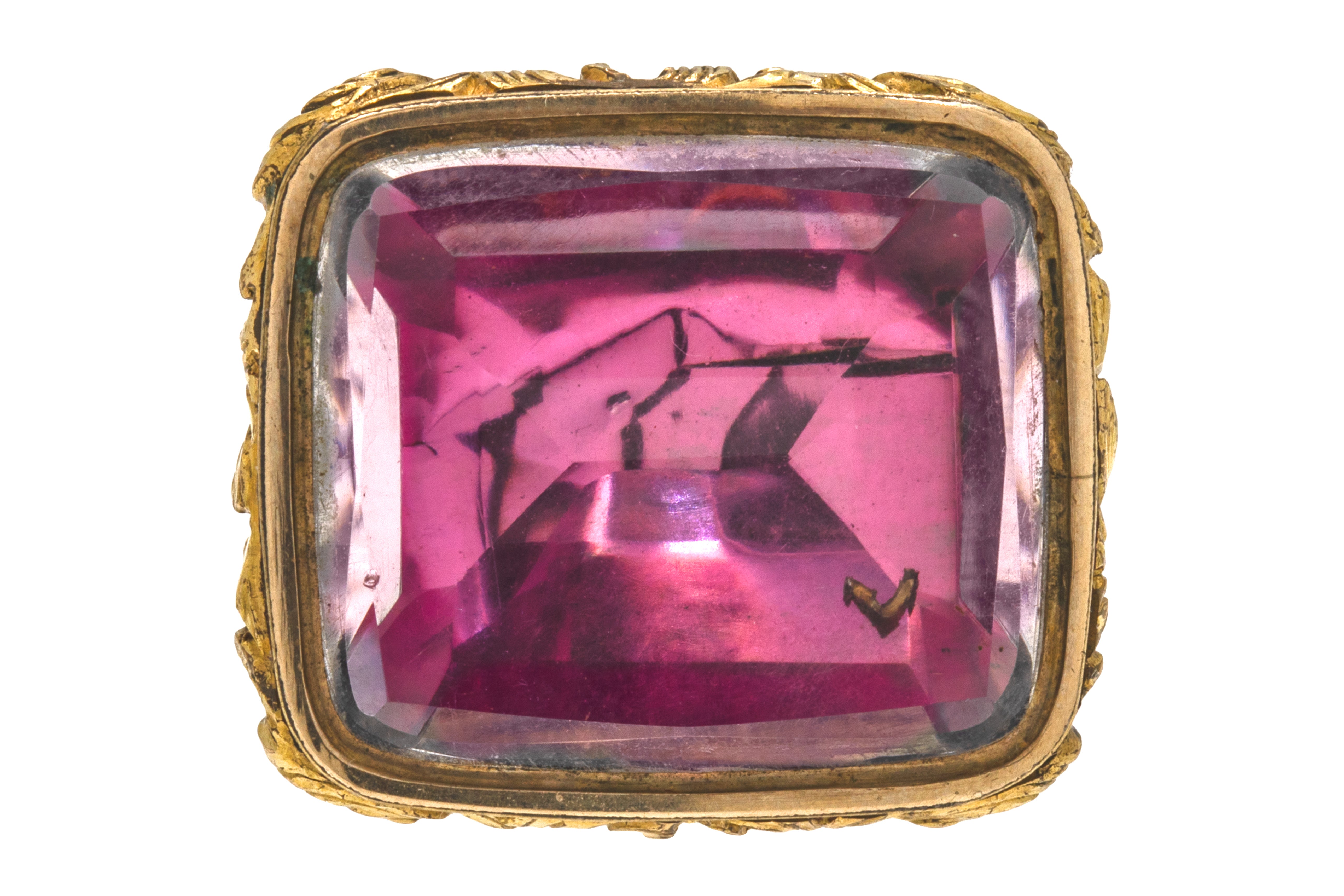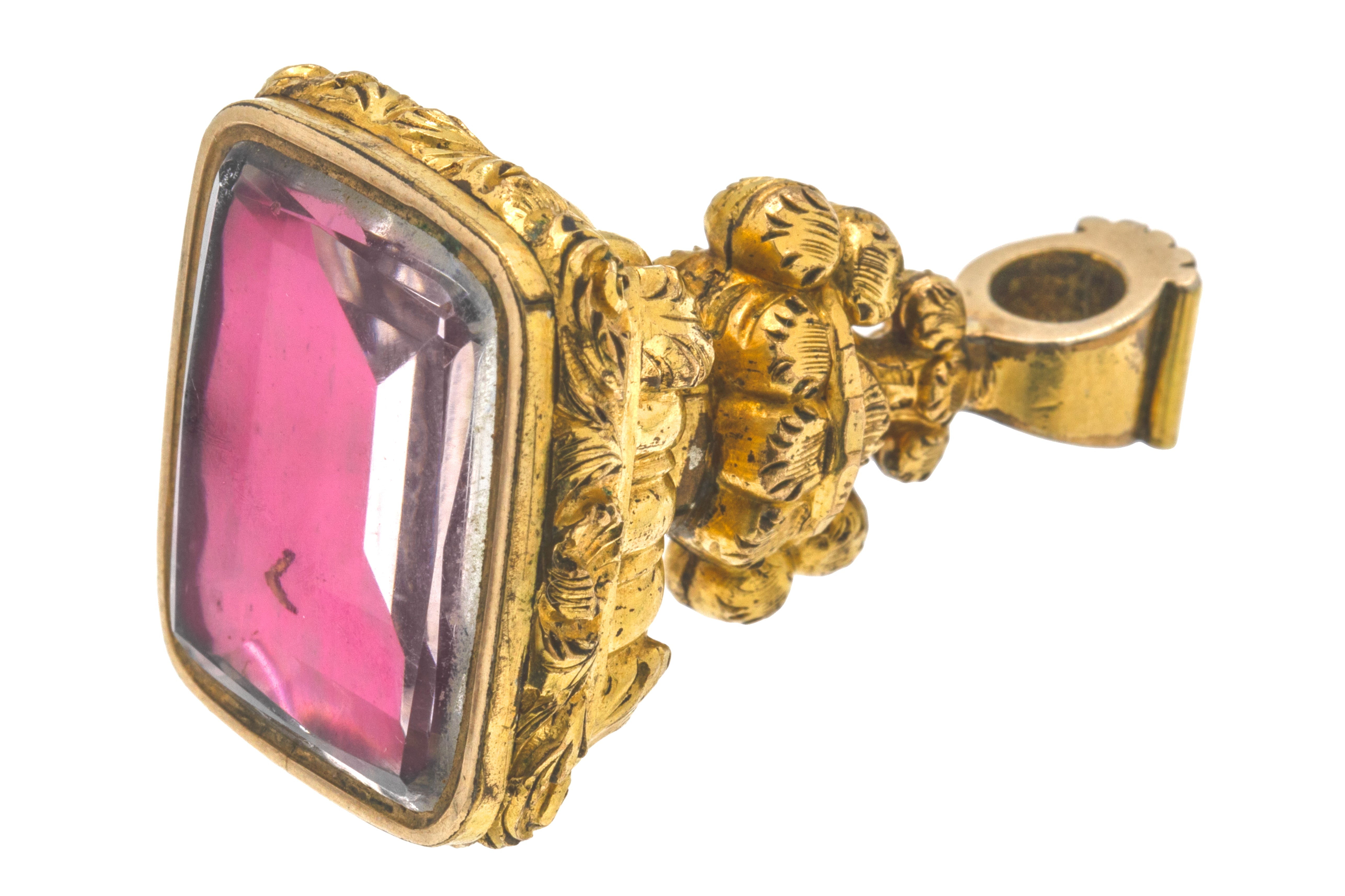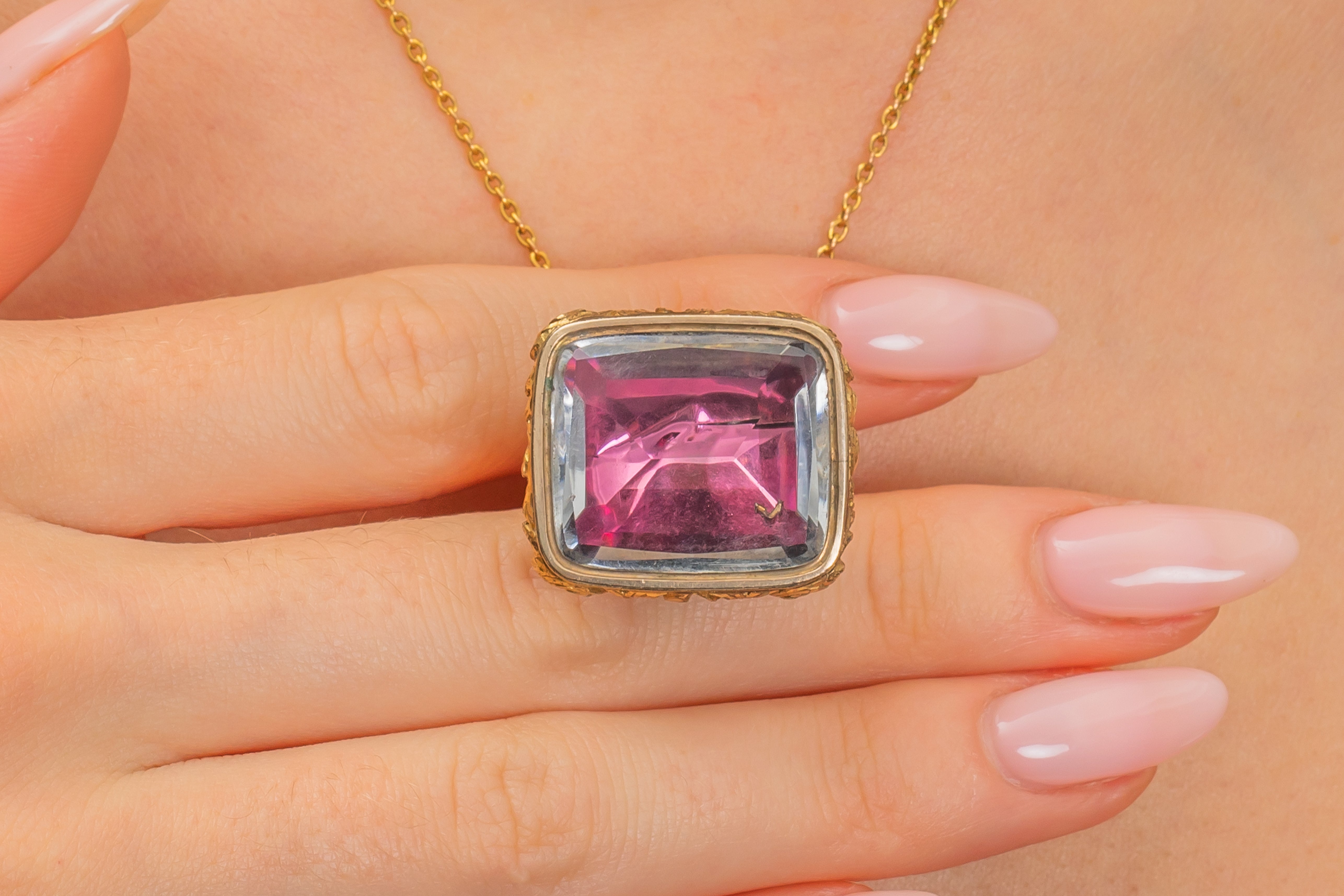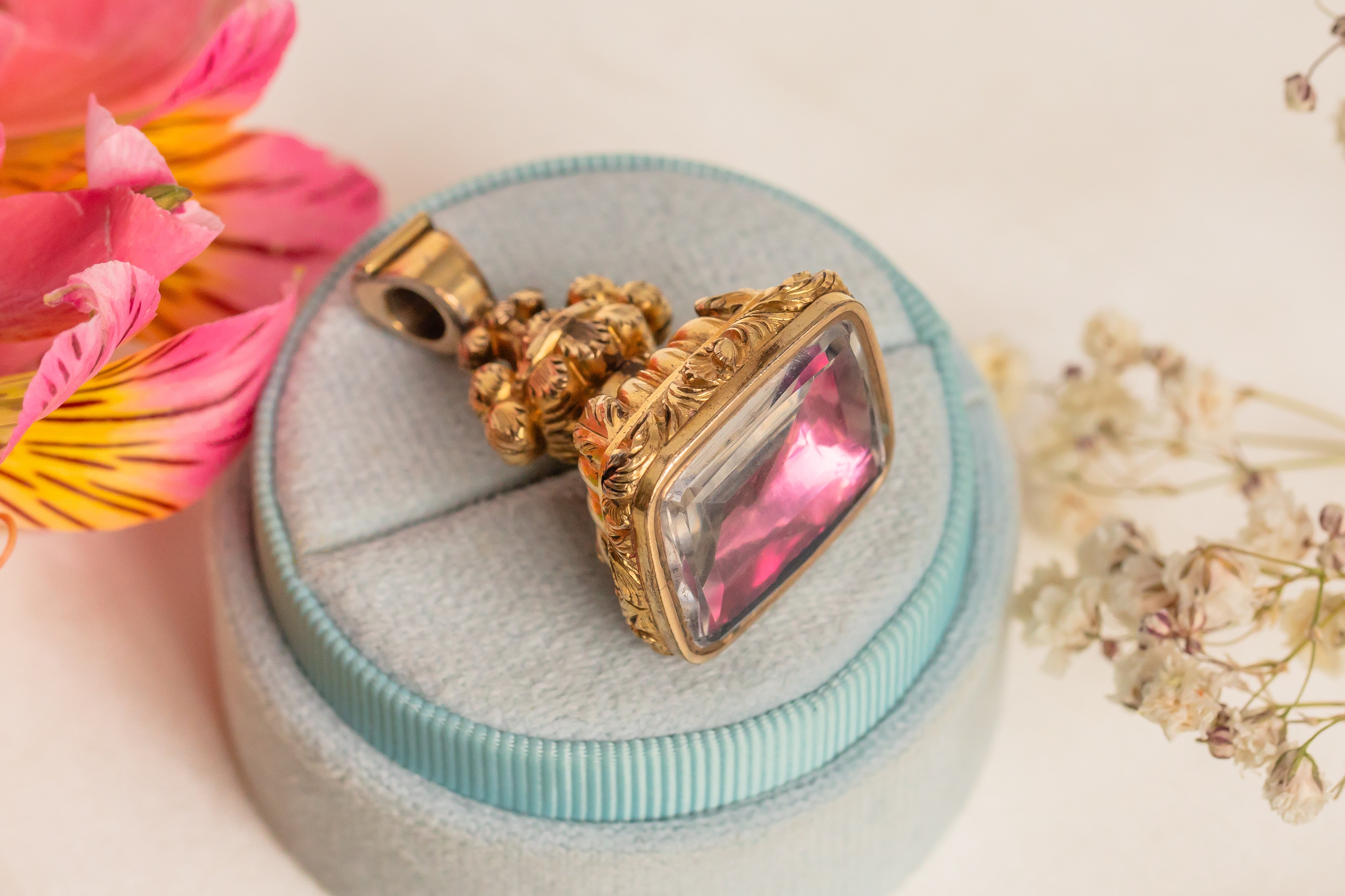 VERY GOOD: This antique foiled Rock Crystal fob pendant is in great condition. Parts of the pillar have worn a little, but overall it still possesses great shine and colour. The Rock Crystal is secure in its settings, free from chips or scratches, and the foiling is completely intact - giving you a bold berry-hued flash when the light hits!