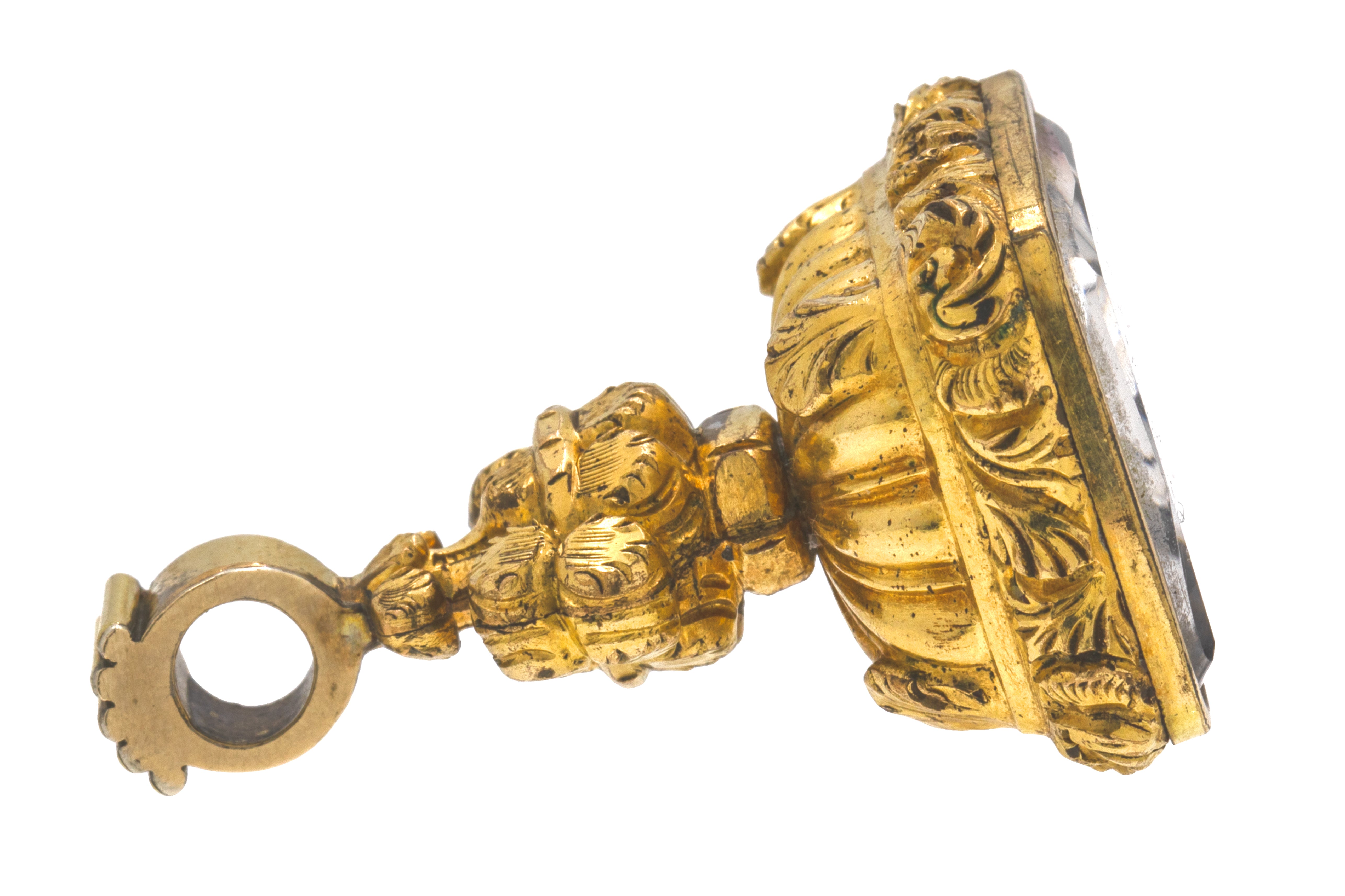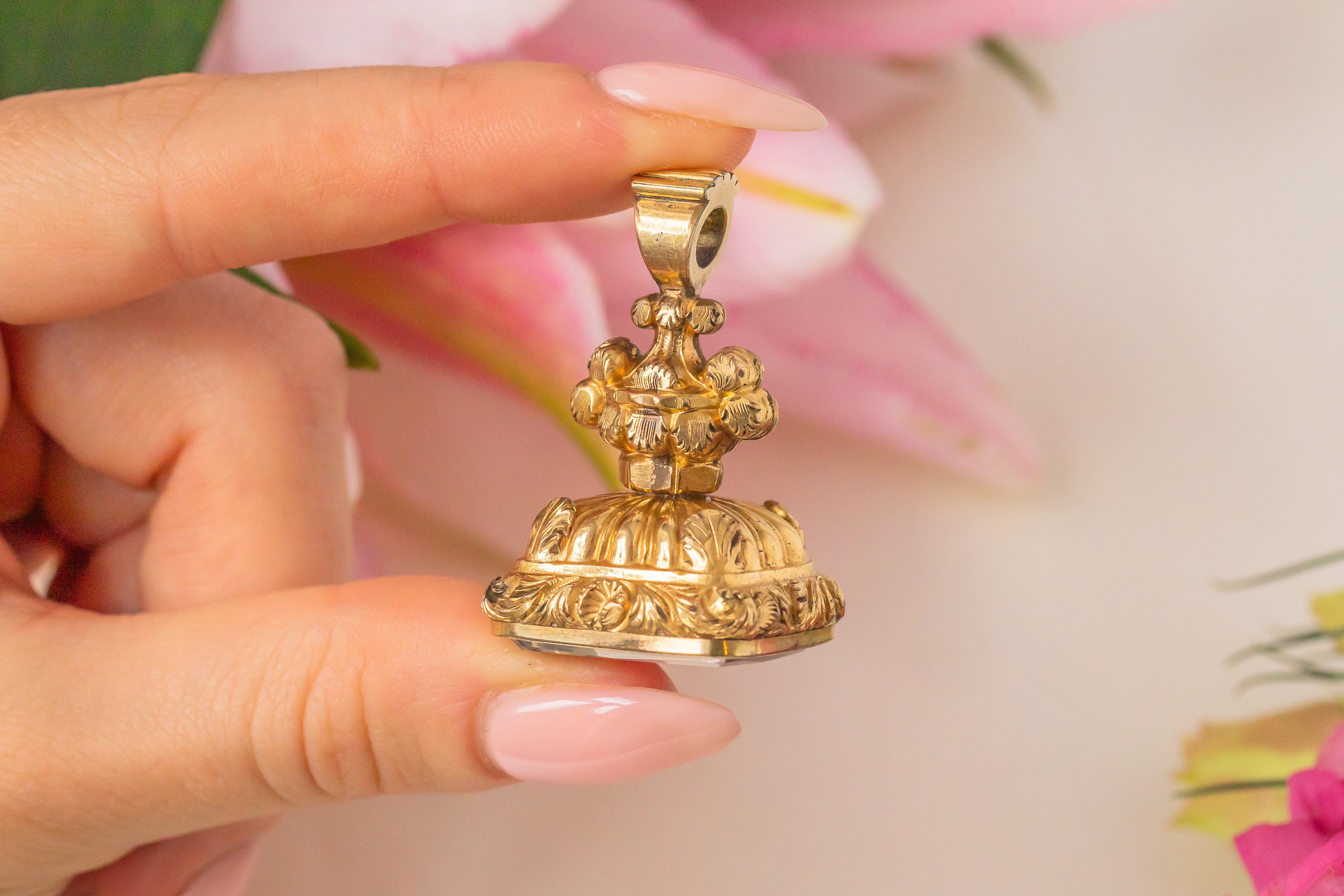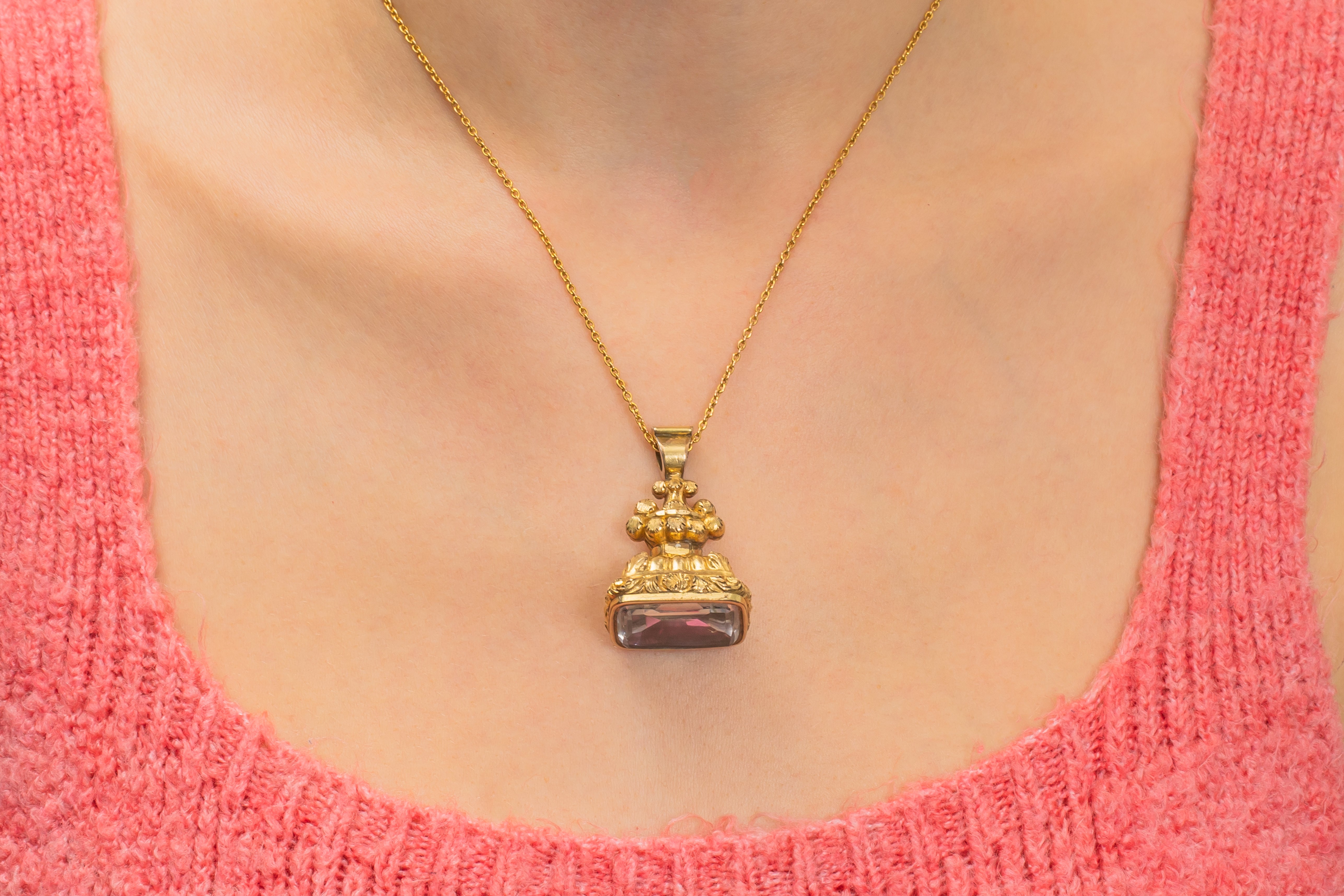 Every millimetre of this antique fob pendant has been well-thought-out, from the elaborate pillar to the repoussé acanthus leaves. Her 19.80ct Rock Crystal centre has a distinctive magenta foiled back, showcasing her incredible clarity and giving this fine fob further depth. Steeped in Victorian charm, she would make a striking statement suspended from an antique Gold chain!