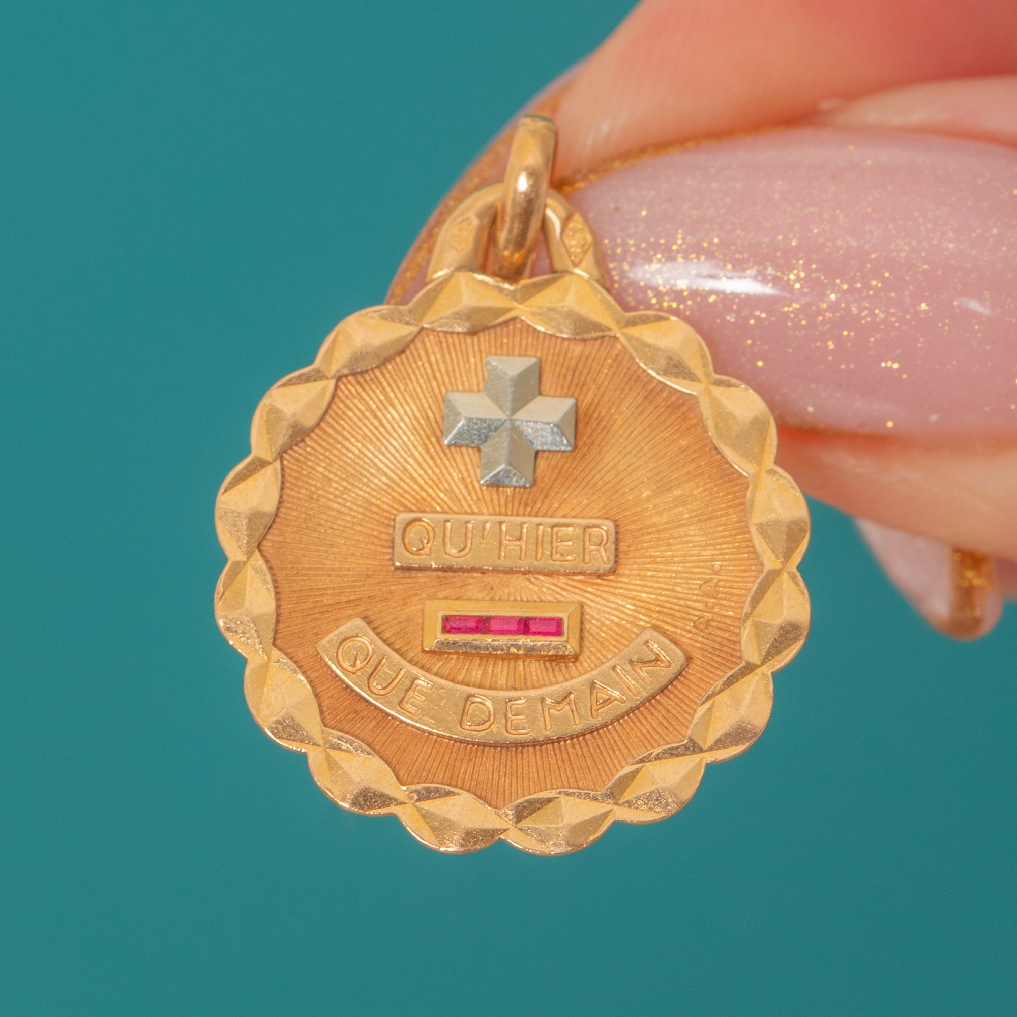 EXCELLENT: The medal is beautifully preserved with crisp French hallmarks and a smooth, glossy surface. All three Rubies are secure and bright. Minimal wear and superb craftsmanship throughout.