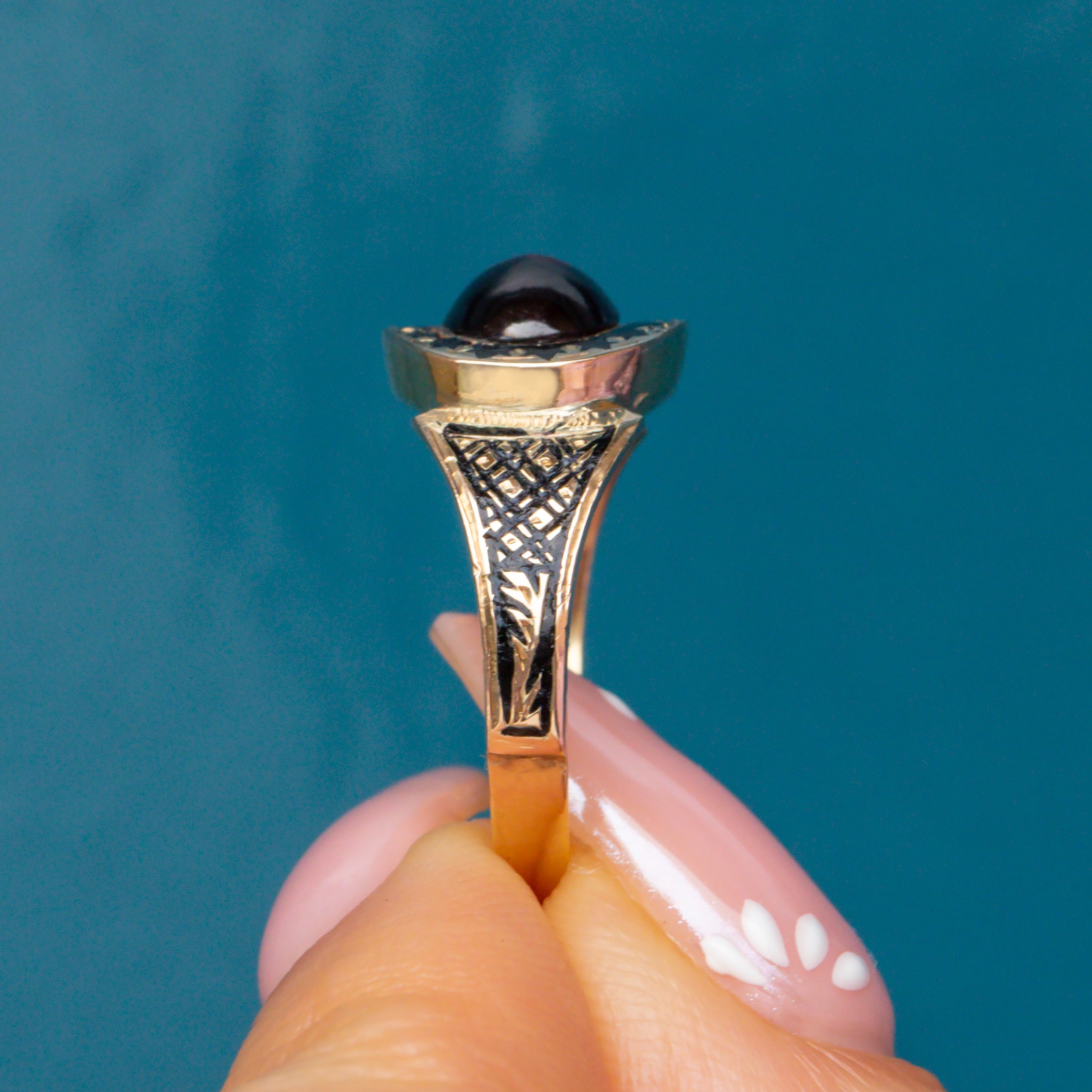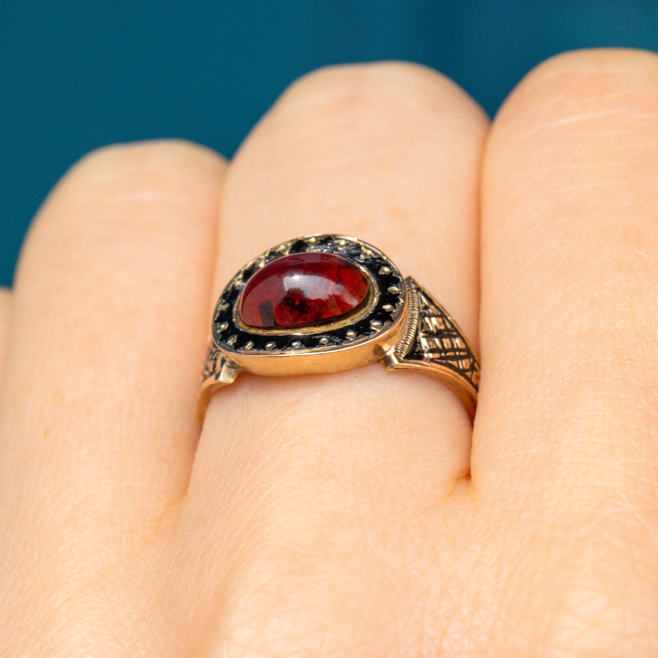 Antique 10ct Gold Garnet Cabochon Black Enamel Ring, 1.65ct