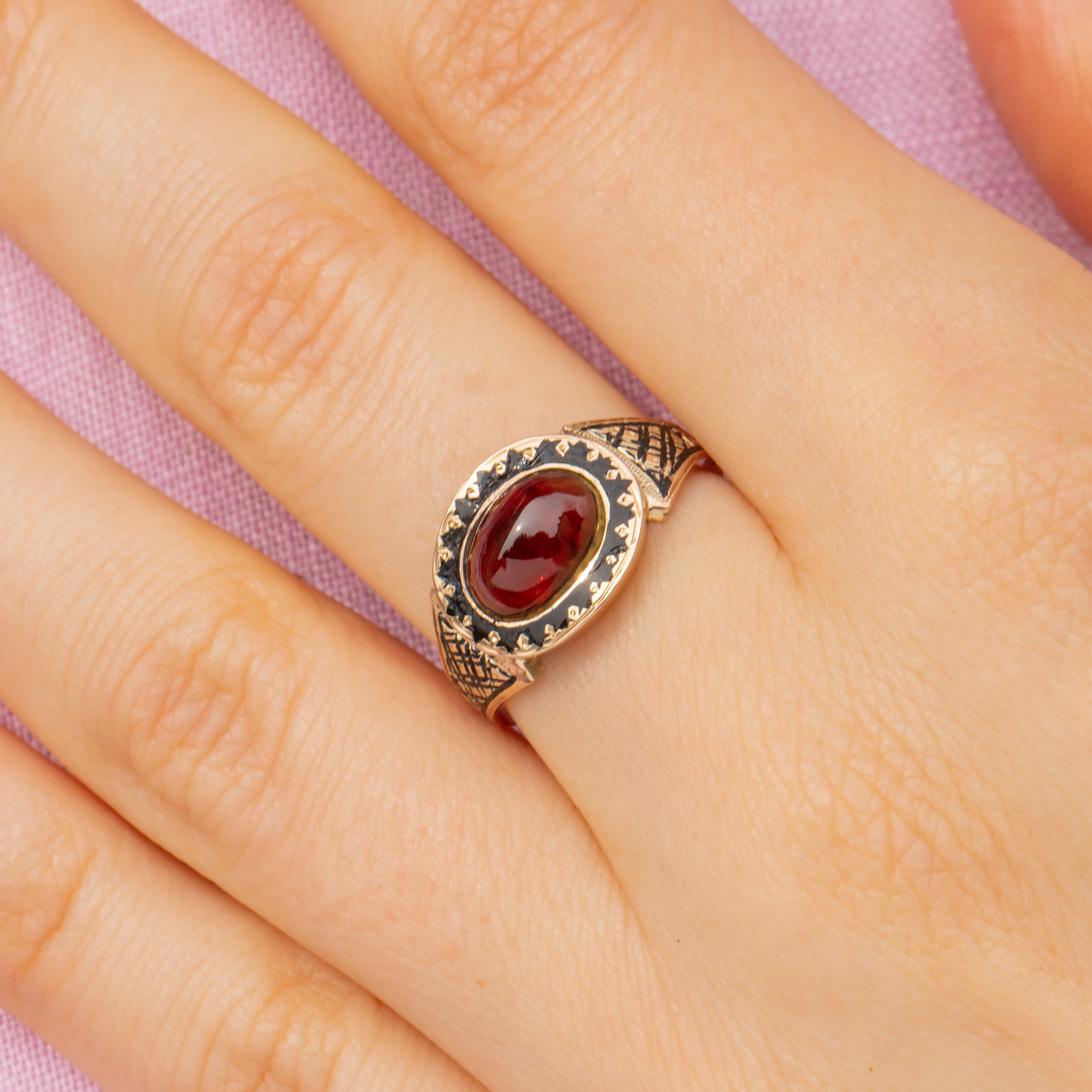 EXCELLENT. This antique 10ct Gold Garnet cabochon & black Enamel ring is in excellent condition! The Gold is buttery throughout and the band has retained its rounded form well, with nice clear stamps on the inside. The Garnet is smoothly domed and securely set, free from chips or abrasions and the Enamel is pristine with no wear to note. This superb piece of Victorian will make a fine addition to any antique jewellery collection!