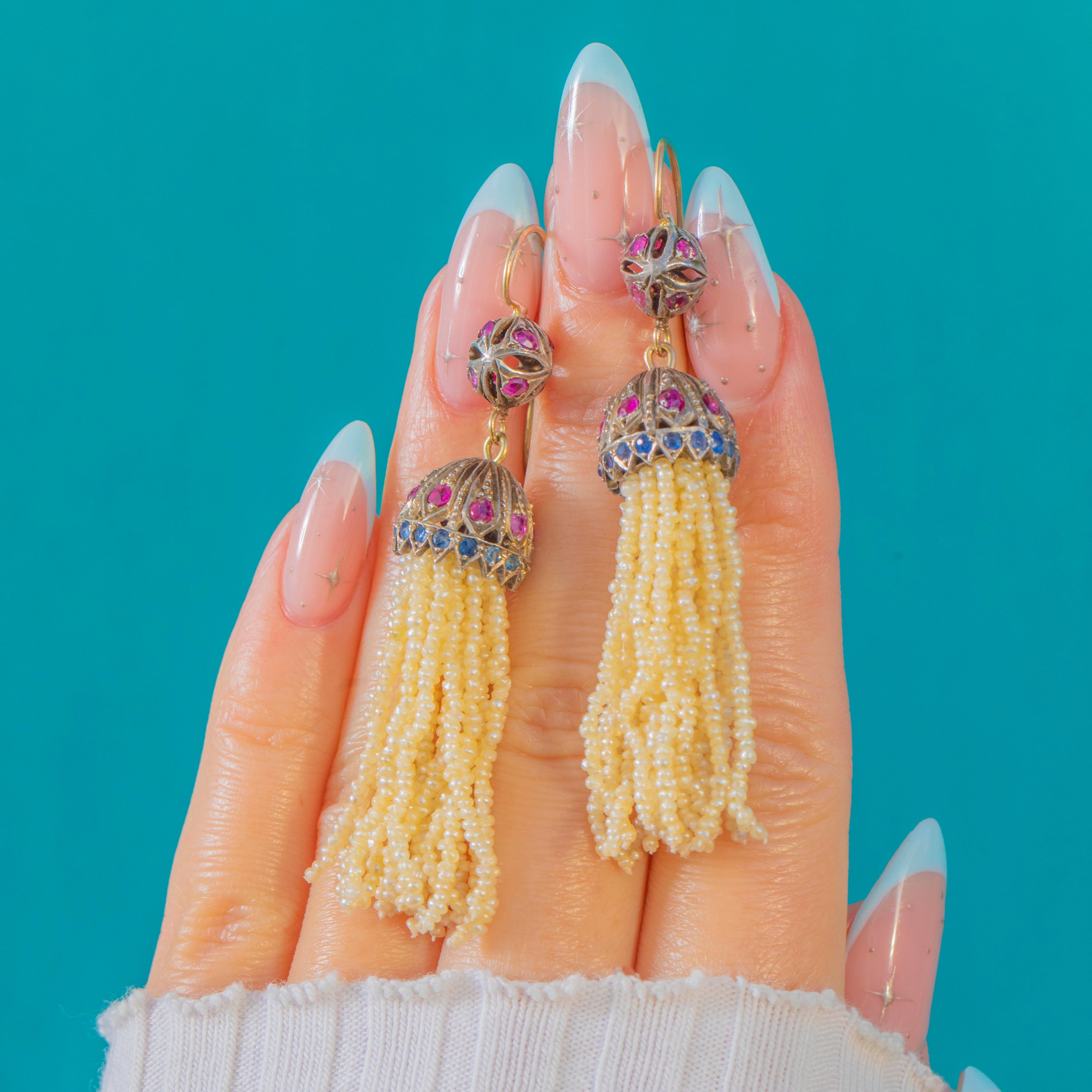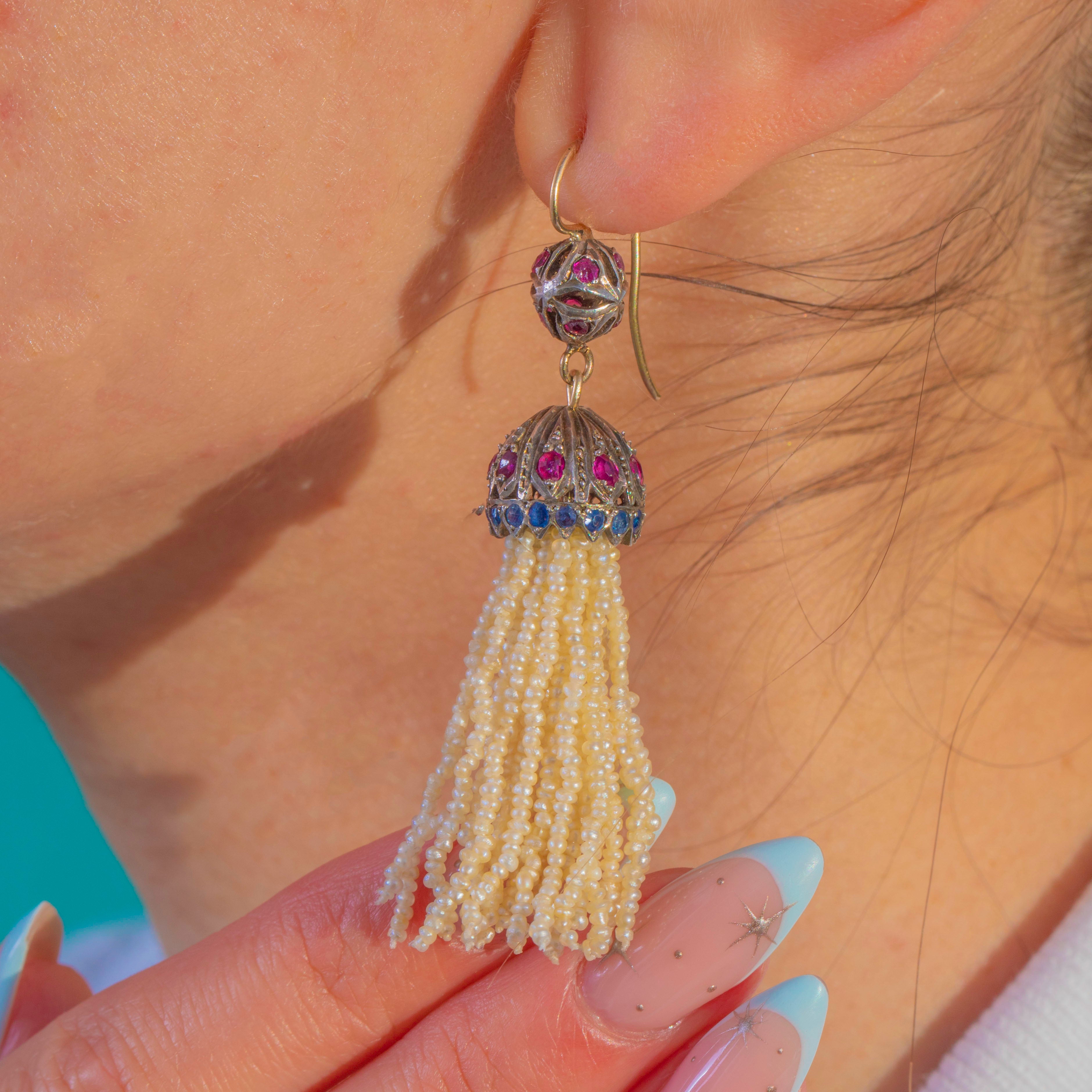 Antique Natural Pearl Ruby Sapphire Tassel Earrings - 9ct Gold Hooks