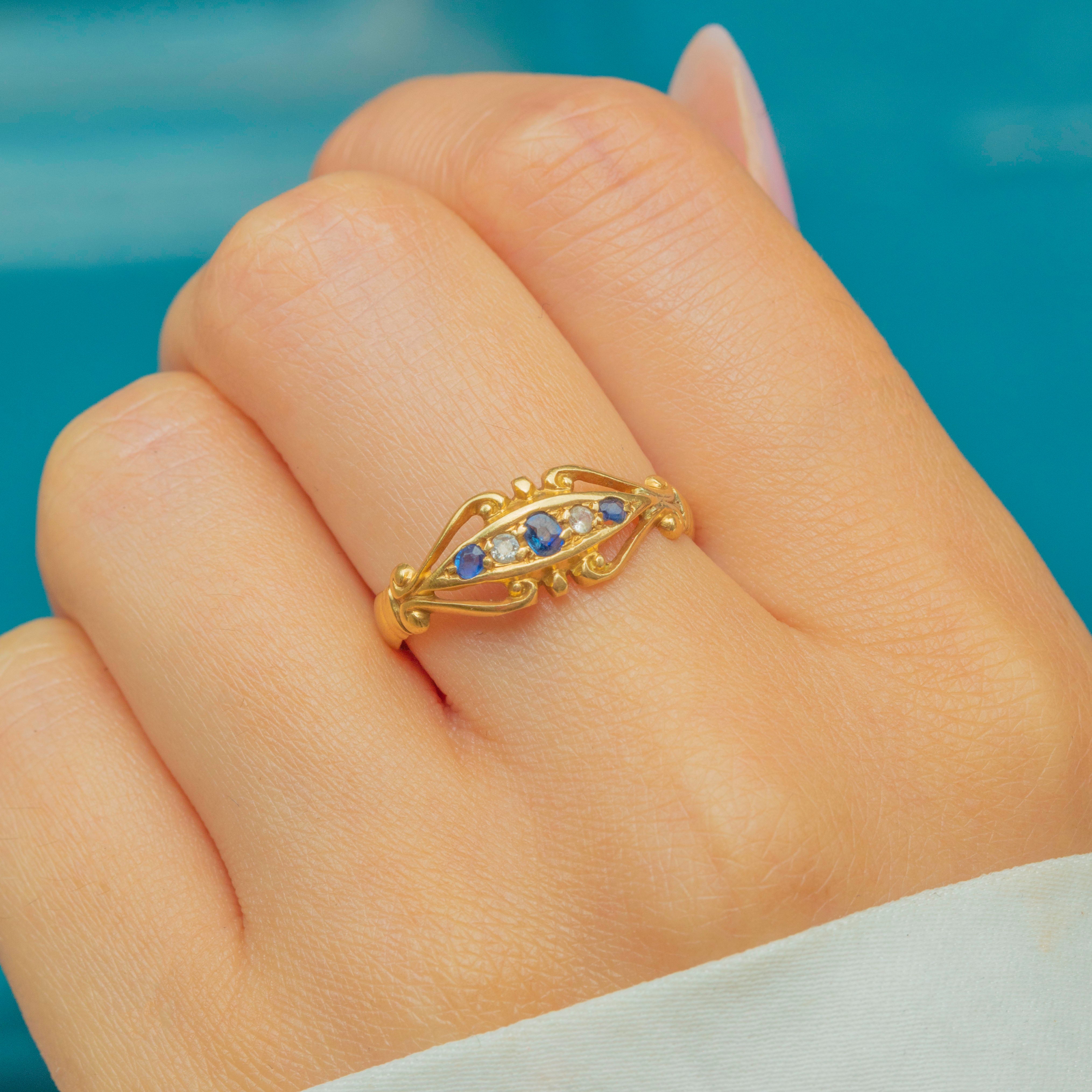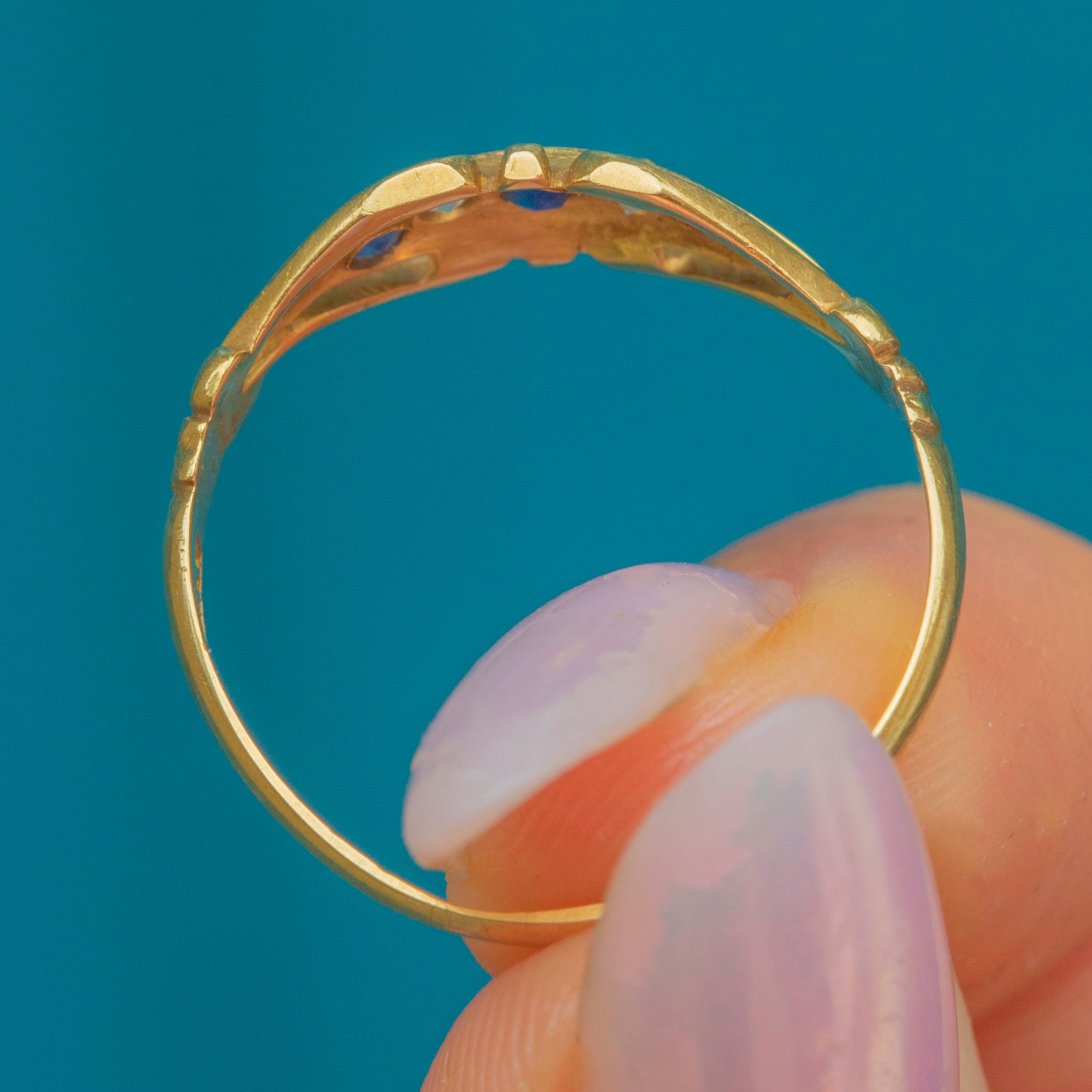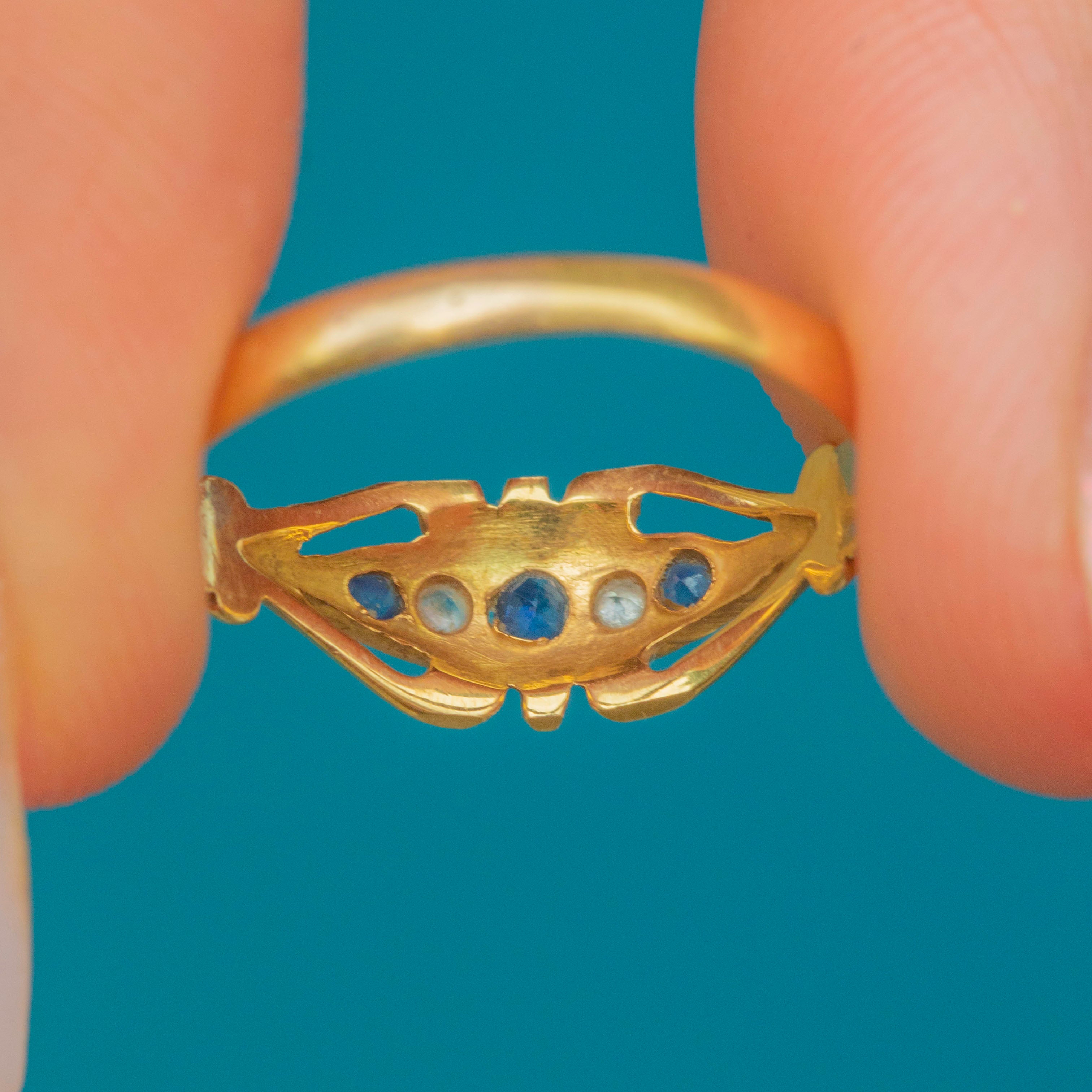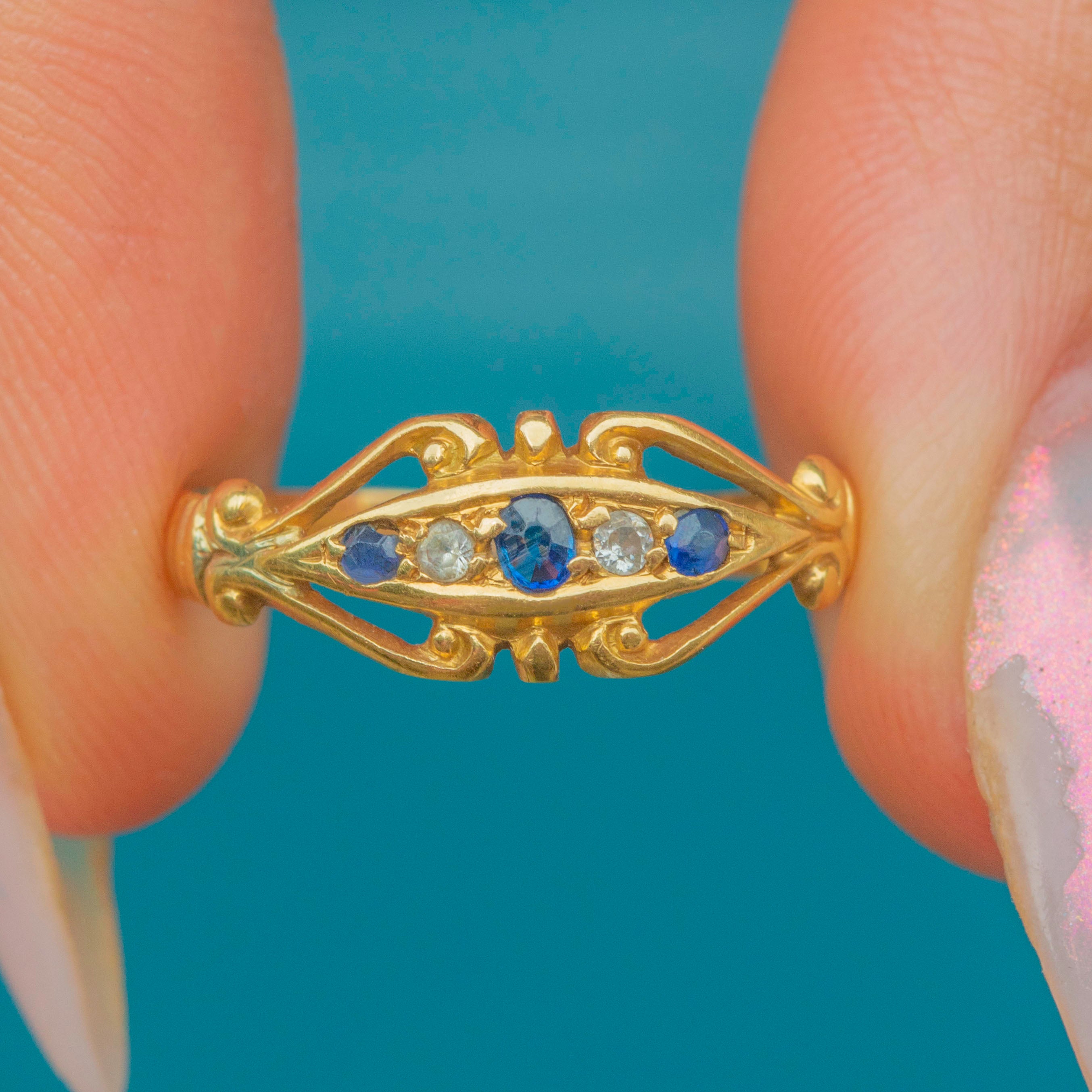 A quintessentially Edwardian five stone ring, featuring three saturated blue Sapphires, each flanked by twinkling rose-cut Diamonds, akin to a starry night sky.