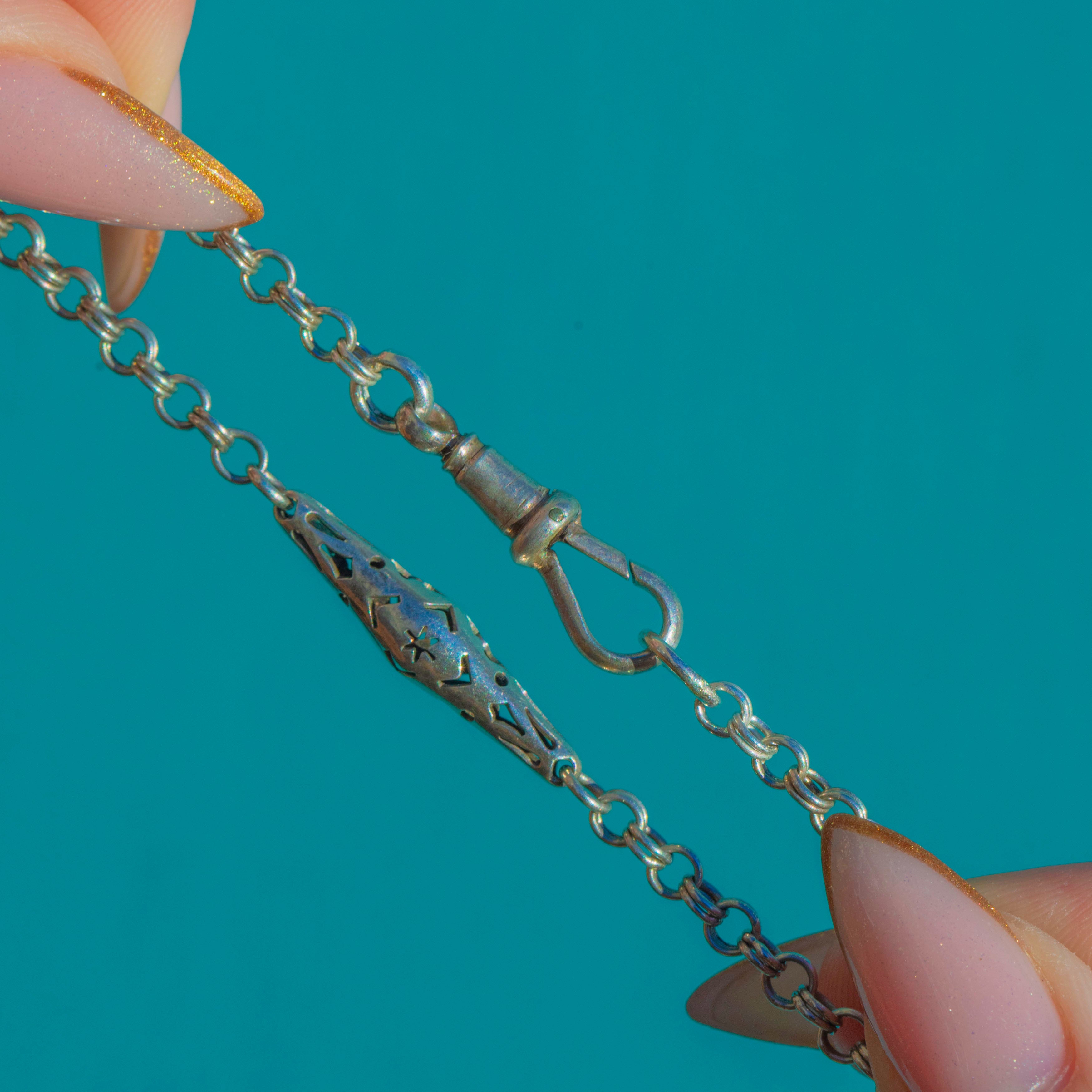 VERY GOOD: Light, even antique wear with the pierced star details remaining crisp and well-defined. The dog-clip clasp is secure and functions smoothly. No notable dents or damage; a beautiful and fully wearable Victorian chain.