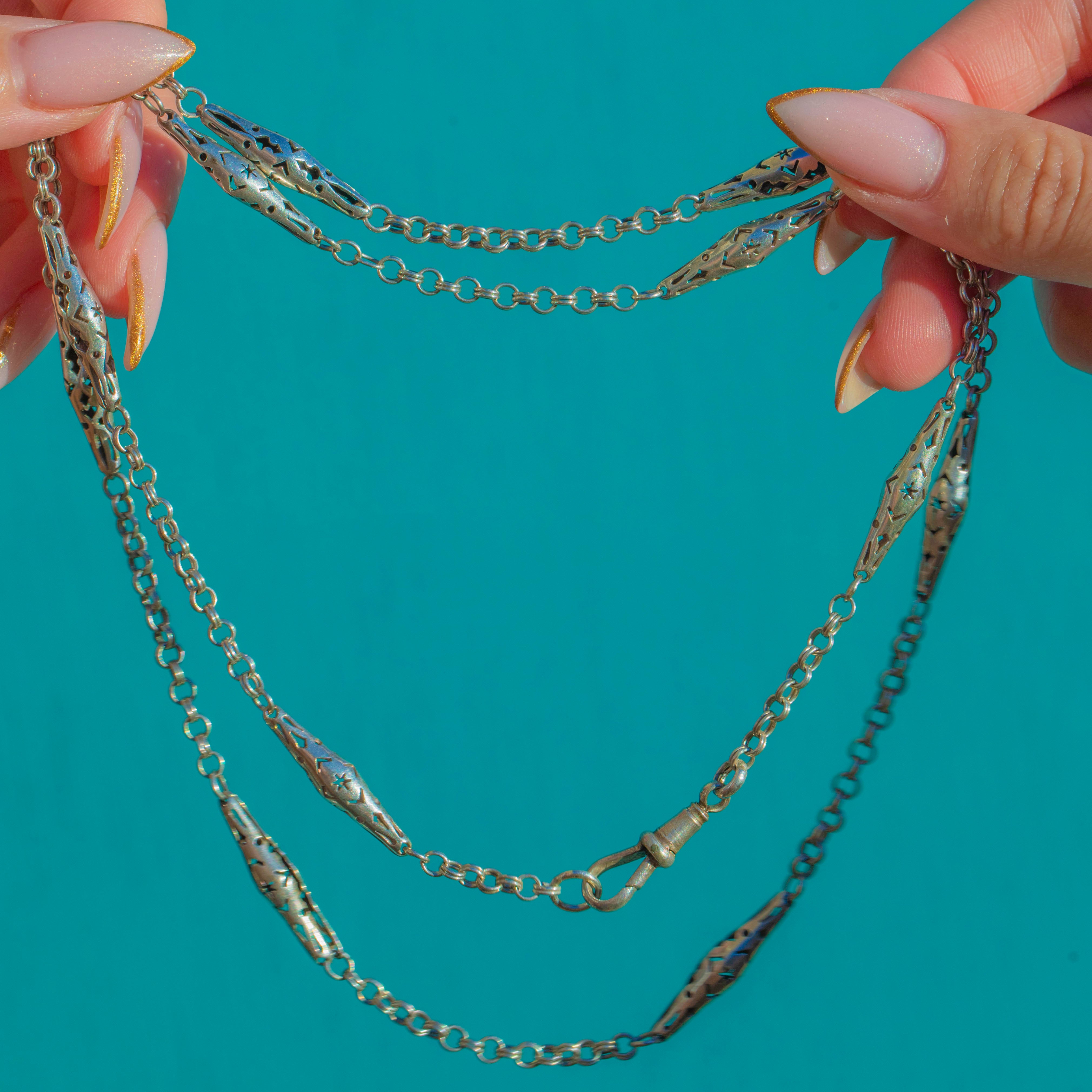This Victorian Silver chain necklace is full of character, showcasing beautifully formed lozenge links with striking pierced star motifs. The star-cut panels bring a soft, celestial elegance, while the cool glow of the Silver gives the piece an effortlessly wearable, timeless feel.