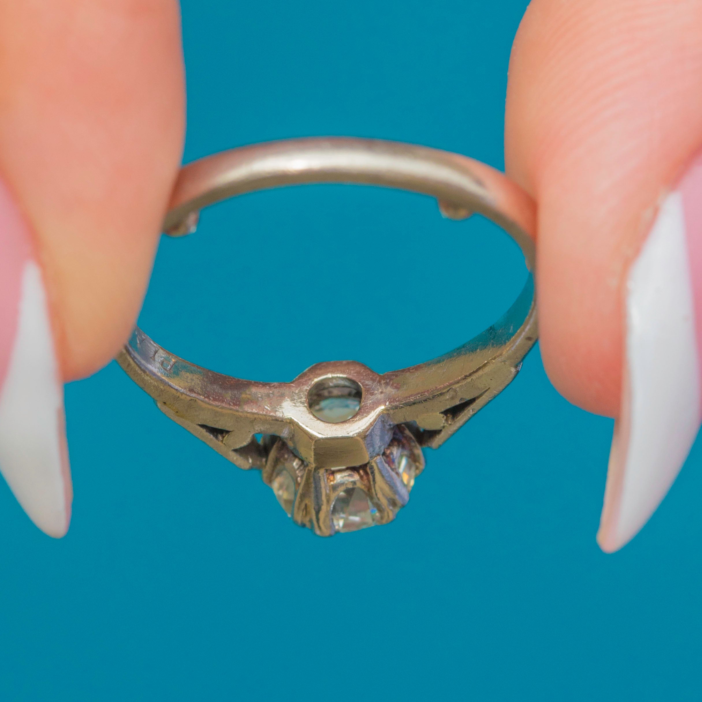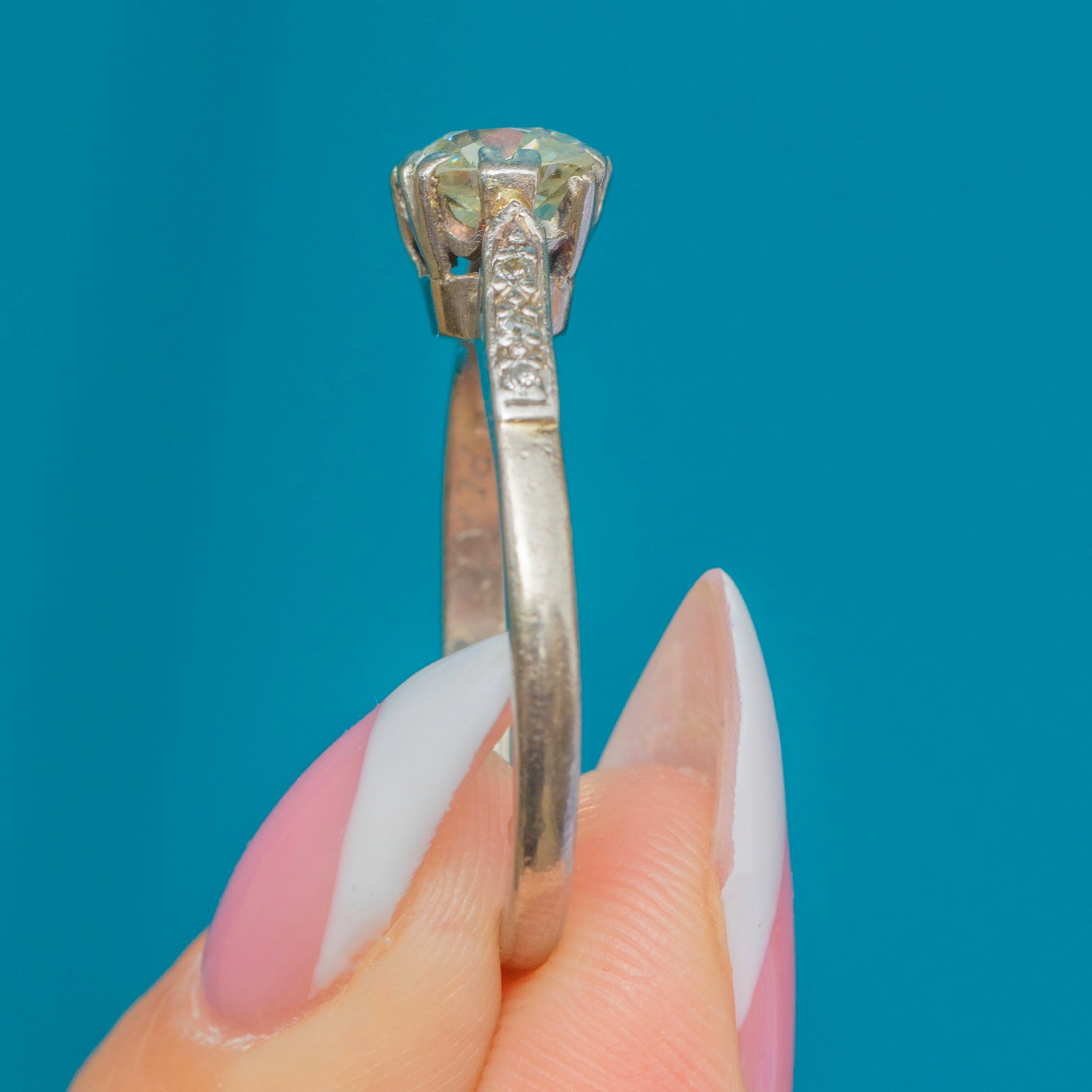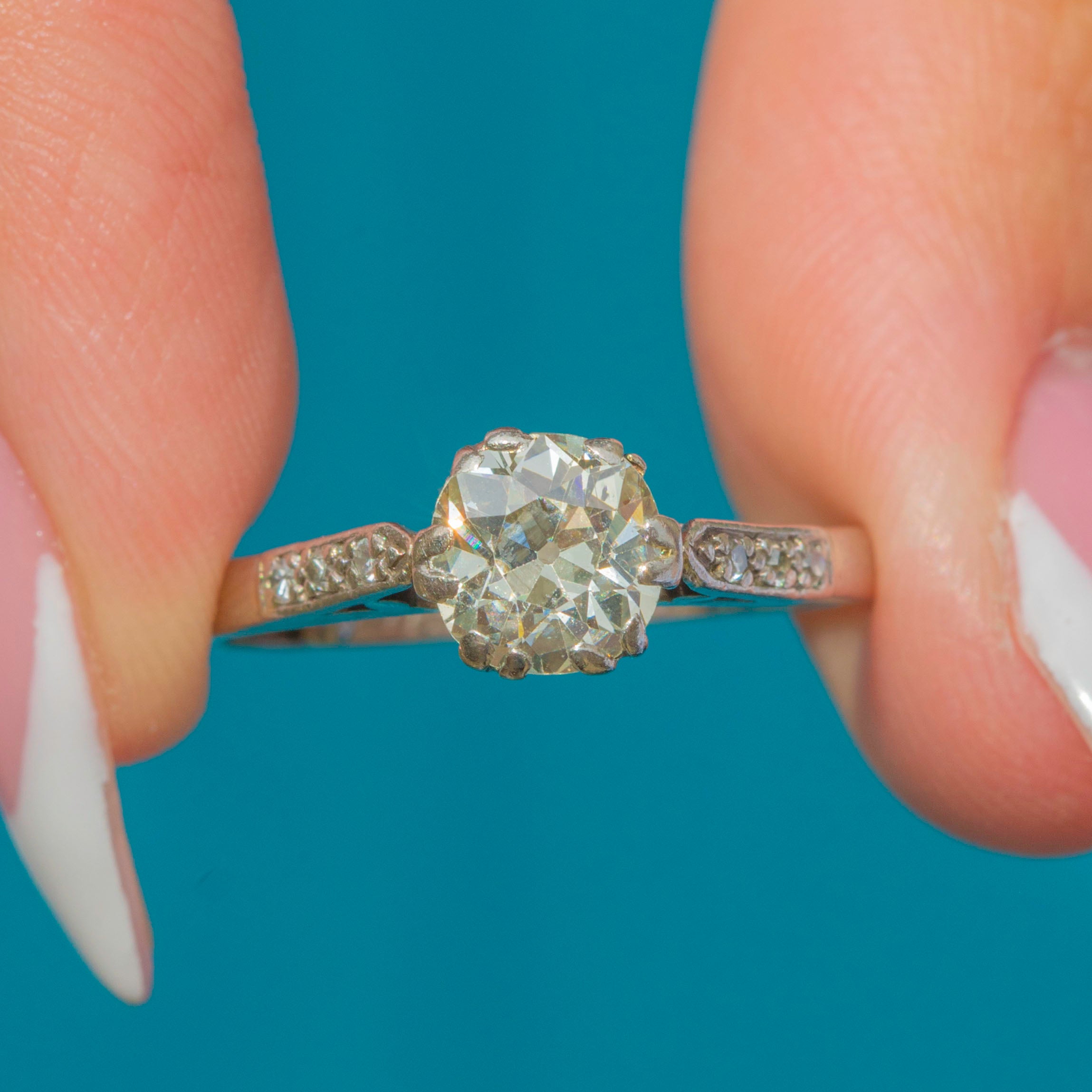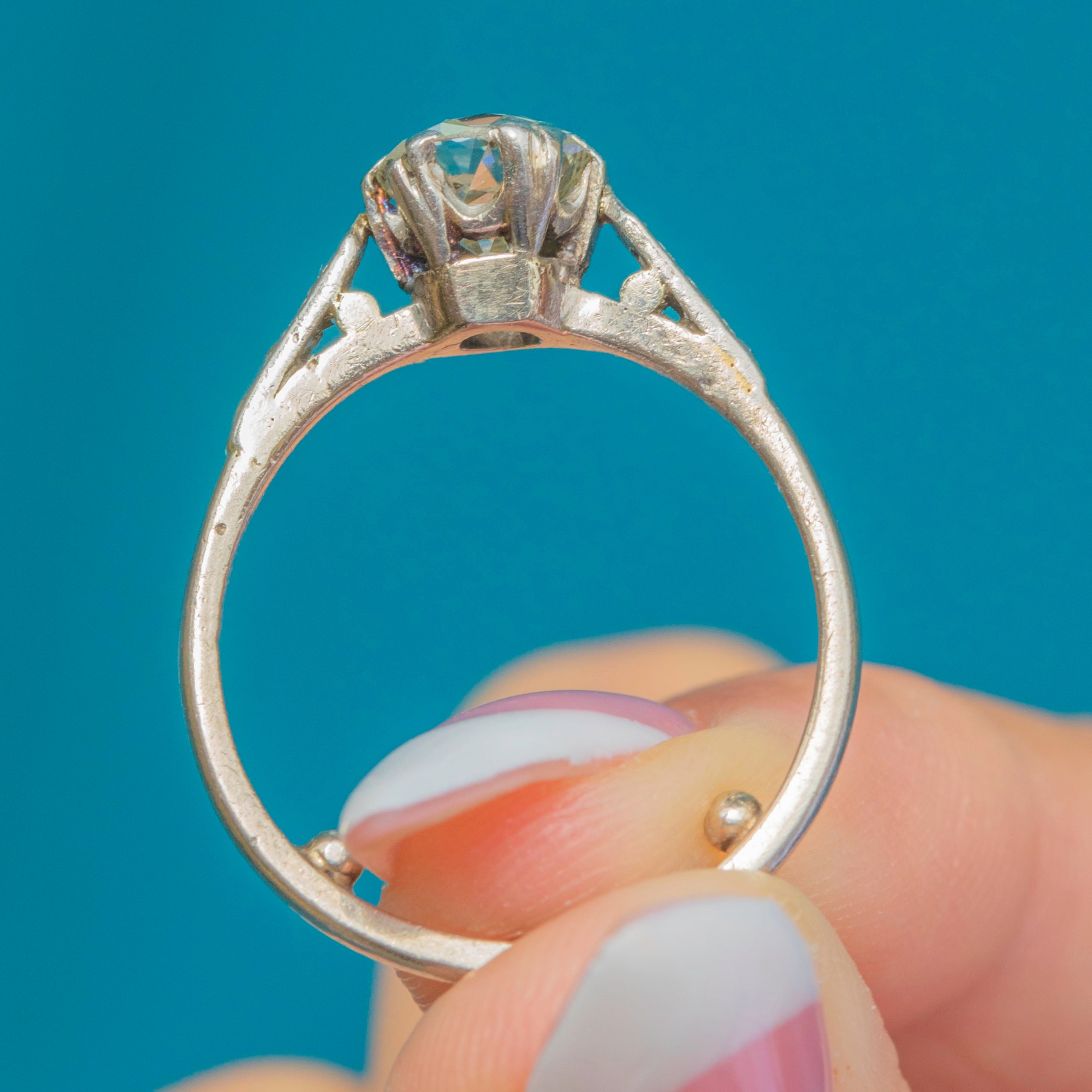 The central antique Diamond is bright and charming-  secured by double typical 1929’s era claw details and accented on each side by petite Diamond accents to the shoulders, lending a delicate sparkle while keeping the focus on the beautifully faceted old-cut centre.