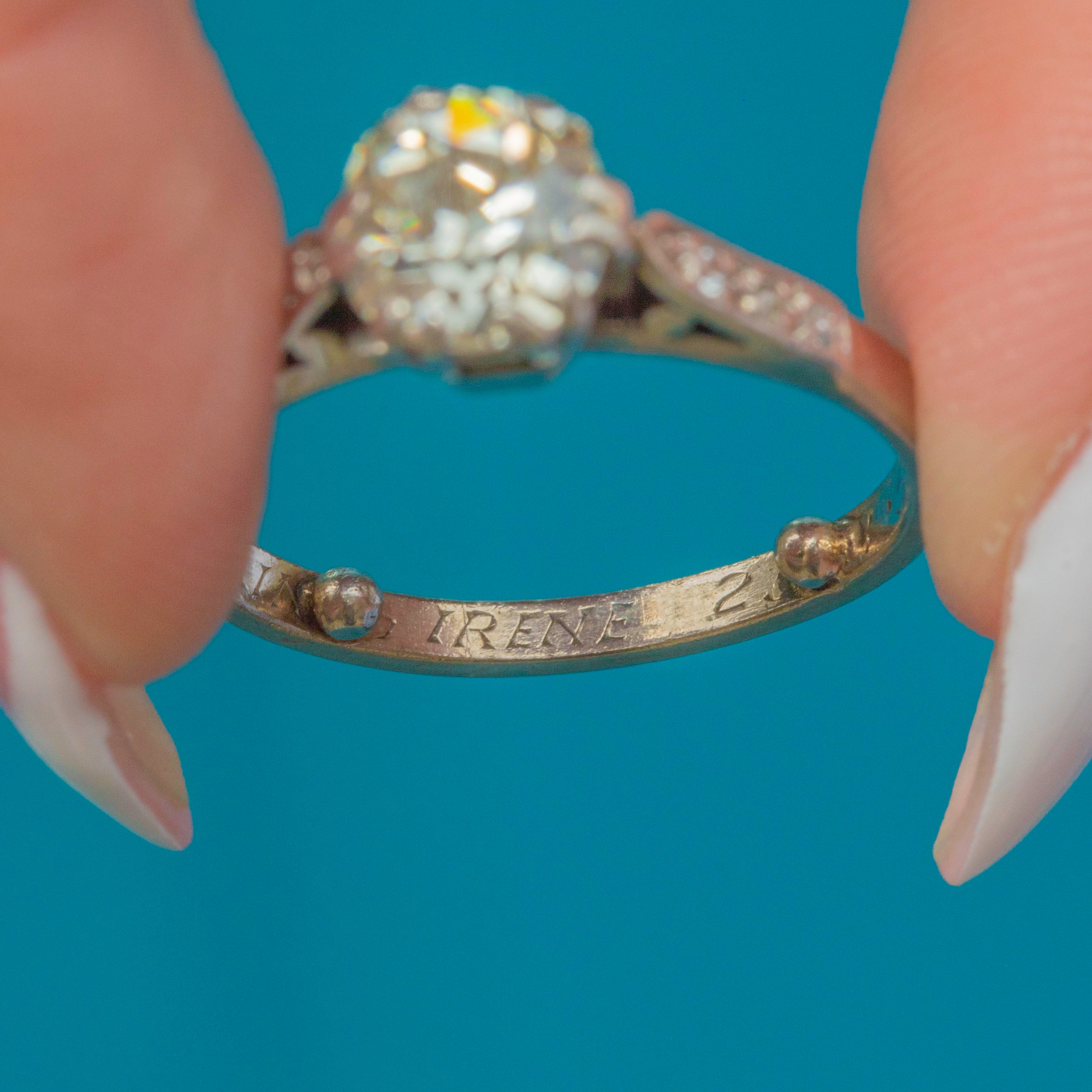 VERY GOOD: Overall very good condition. One claw on a double claw setting is missing, which may slightly affect the security of the centre Diamond long term, but currently the Diamond is perfectly secure. The Old European Cut Diamond and shoulder Diamonds remain bright and beautifully presented. The Platinum mount shows only light wear consistent with careful use. Engraving detail on the inside of the band is slightly worn but reads "Iain and Irene, "2. *.  53"