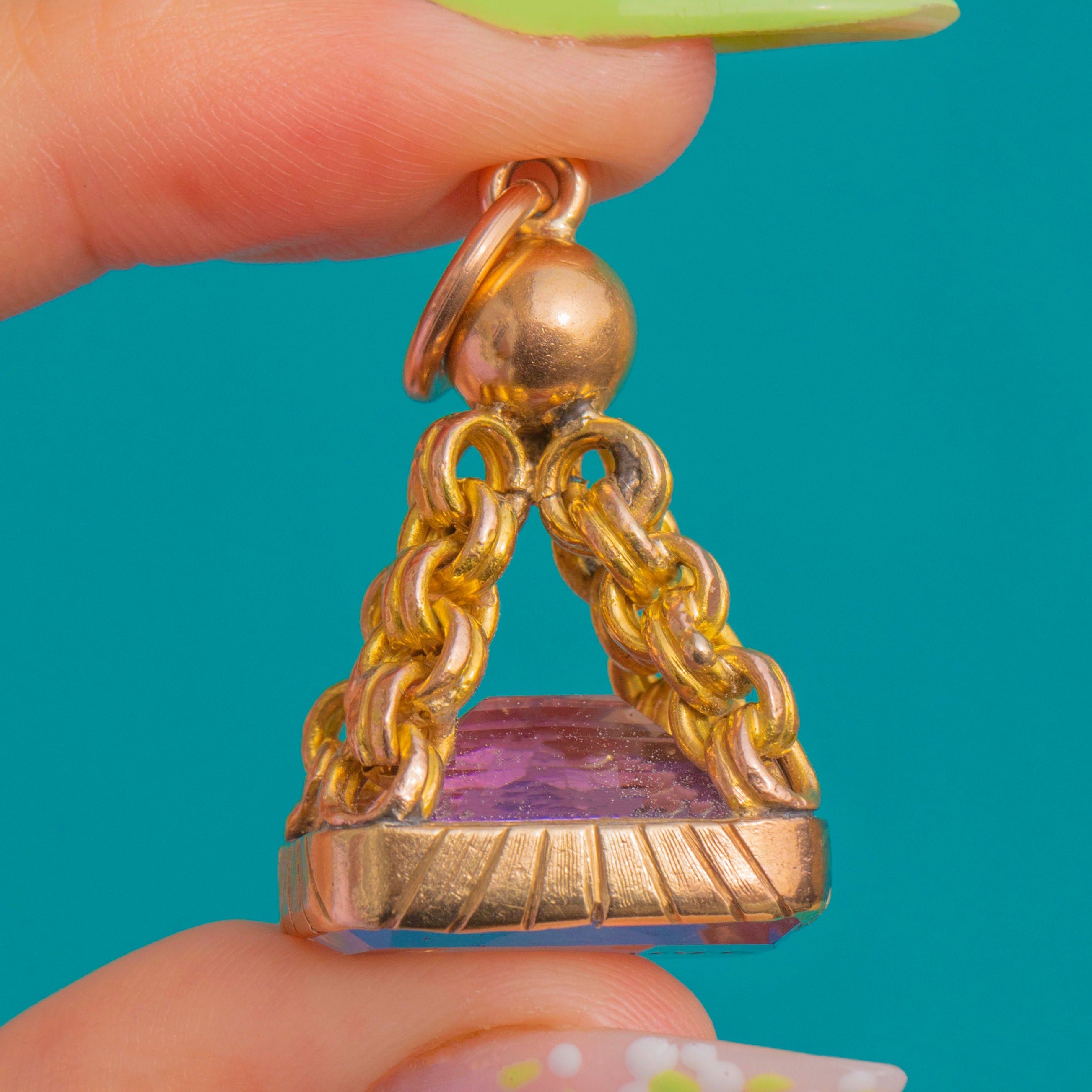Sculptural and soulful, this antique Portuguese fob seal pendant pairs rich Gold with a beautifully Amethyst intaglio that reads “Emanar” — “to live with feeling”. The design is wonderfully architectural: a polished orb finial leads to three petite chain drops that gather at a low, engraved bezel, framing the vibrant purple gem with elegant detail.