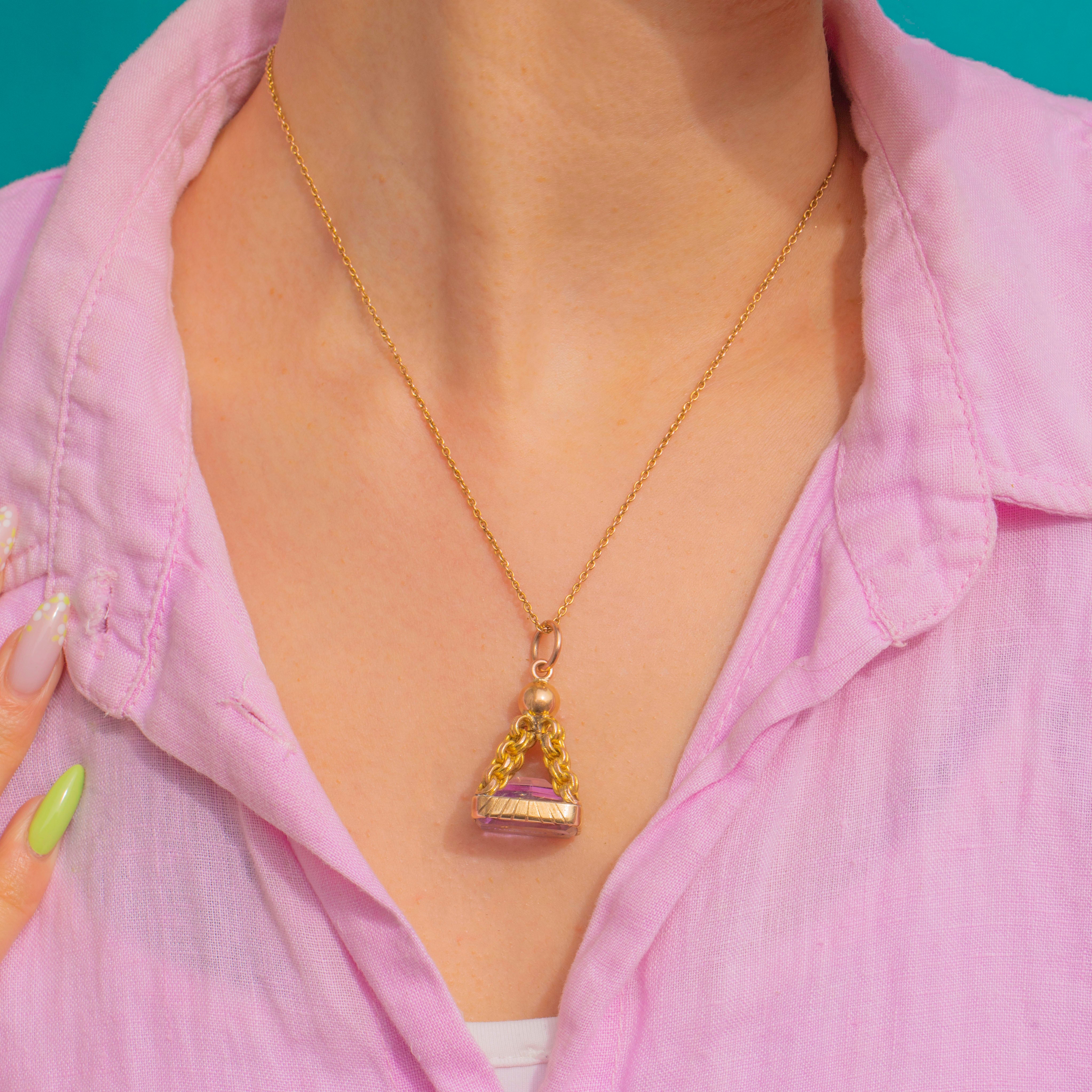 VERY GOOD: The Amethyst presents beautifully and is securely set, with no damage observed; only light natural surface marks visible under close inspection. The Gold setting and chain bail segments show gentle surface wear and high-point rubbing commensurate with age, with minor soldering irregularities at the joins from original manufacture. Overall, the piece has been well cared for and wears wonderfully.