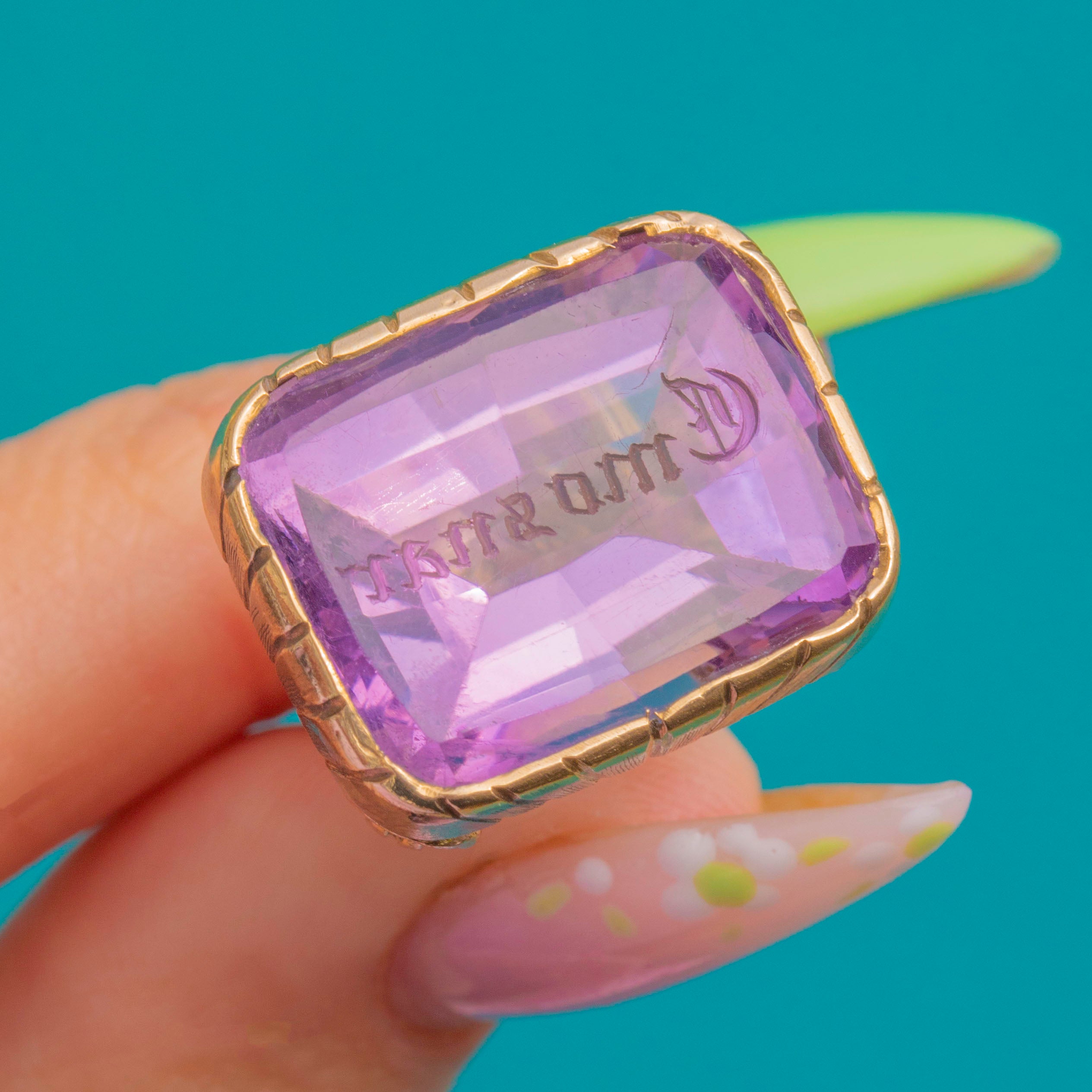 Antique Portugese 9ct Gold Engraved Amethyst Fob Seal “Emanar” (To Live With Feeling)