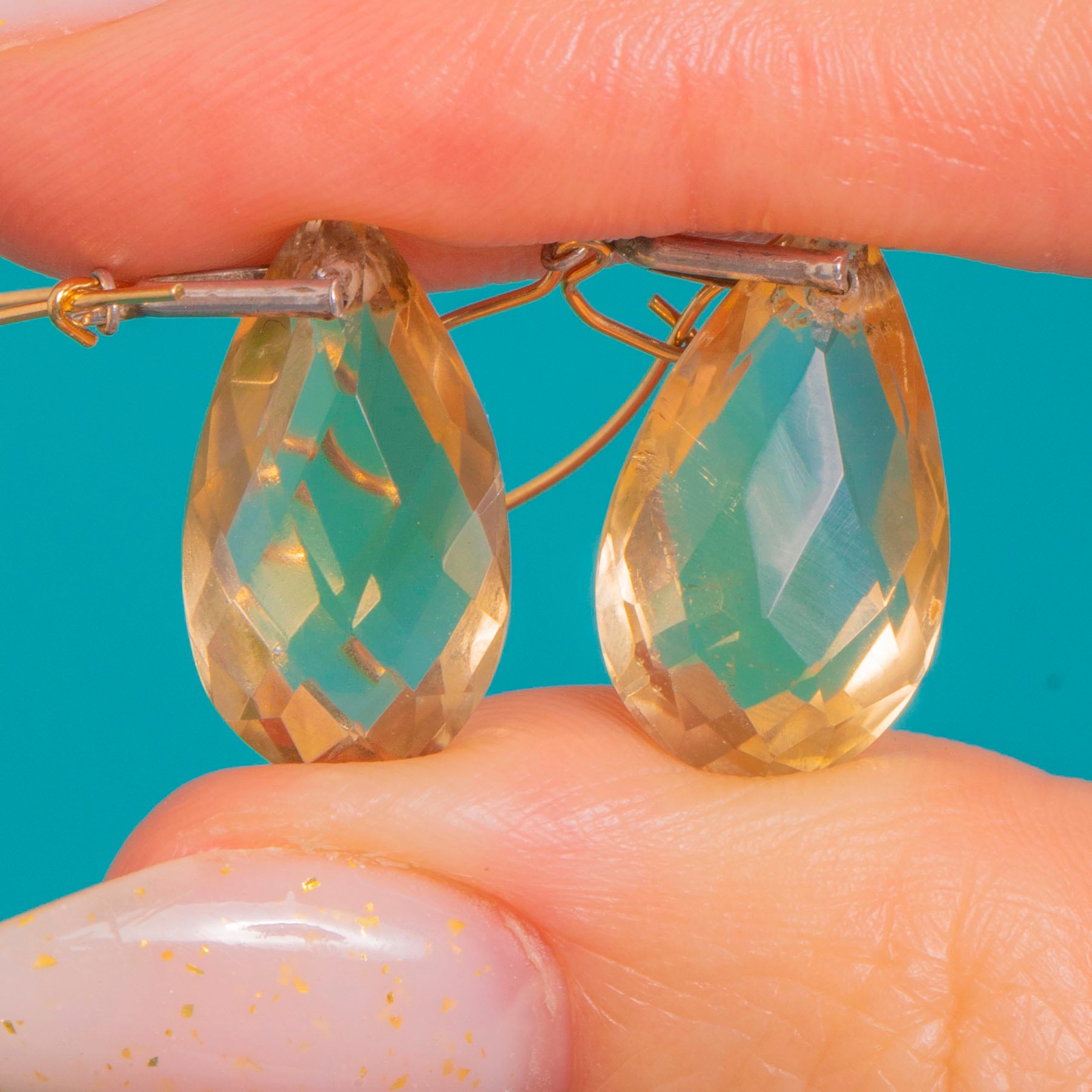 EXCELLENT: Citrines are bright and crisp with well-defined facets; only very light surface wear and minor nibbles near the drilled tops visible under close magnification. Metalwork shows faint, commensurate scuffs and a touch of tarnish. Some adhesive is visible at the stone-to-cap joins, secure and consistent with the construction; overall beautifully preserved and well cared for.
