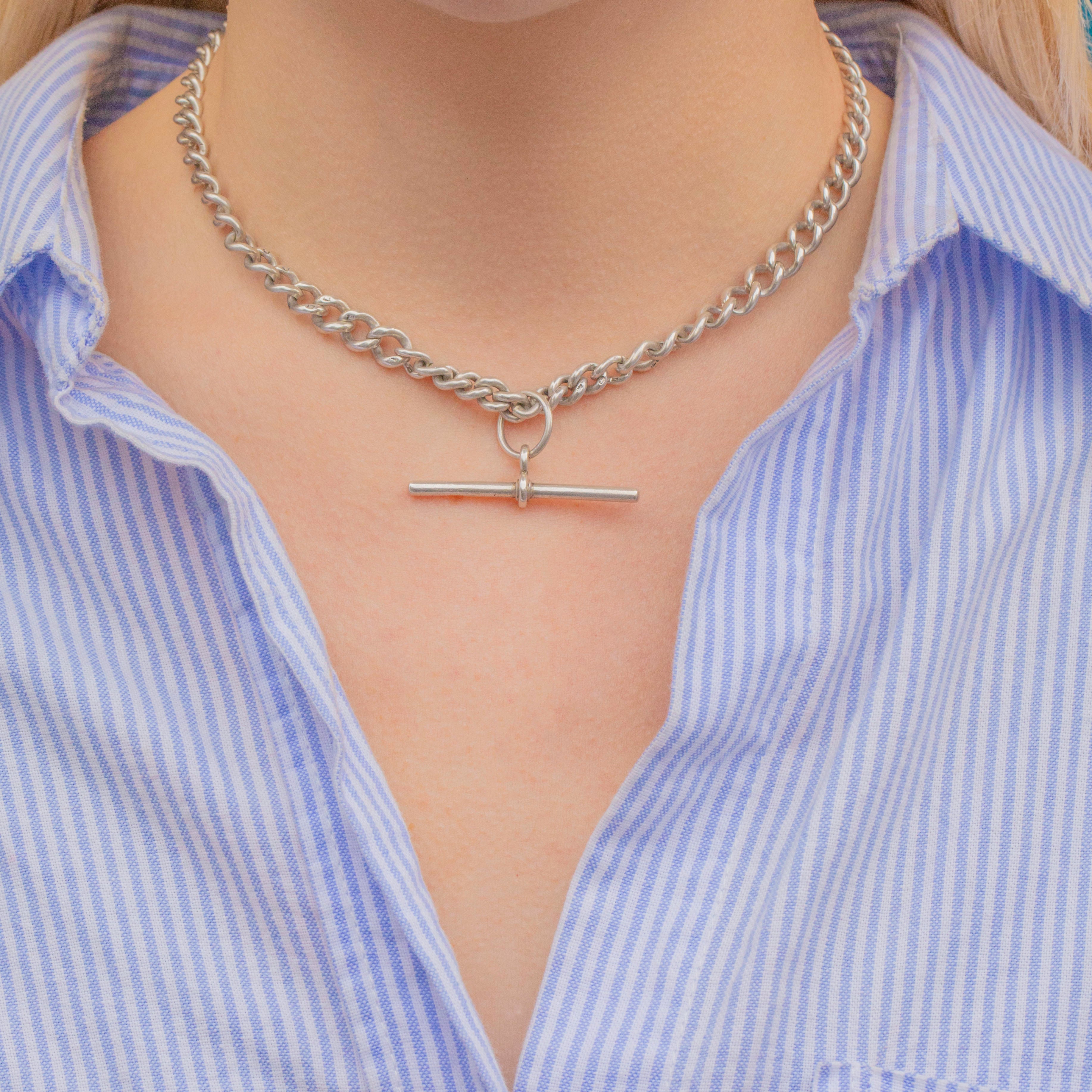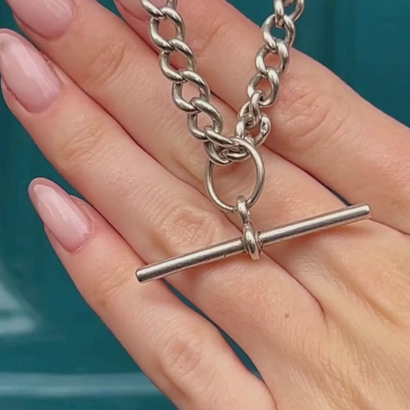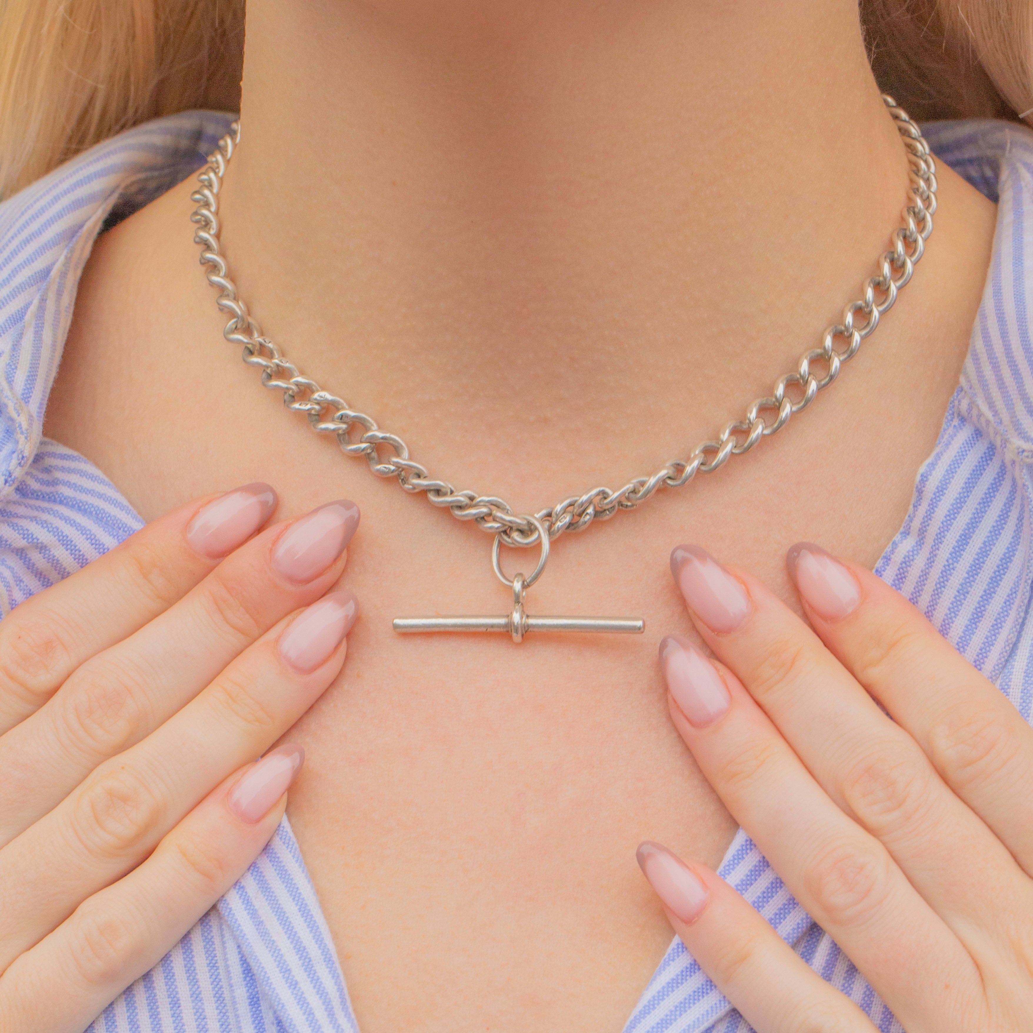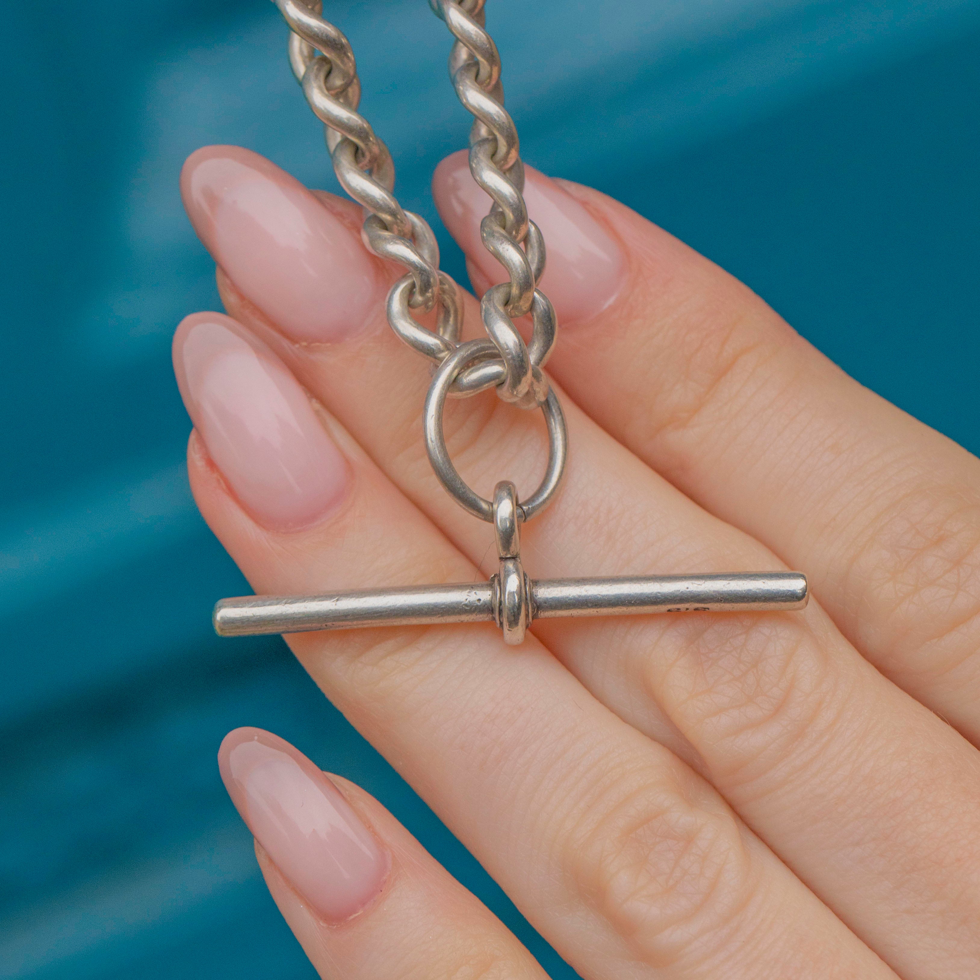 Crafted from solid Silver, this Victorian chain features a distinctive graduation of links that elegantly accentuate your neckline. The chain is accented by a sturdy T-bar, positioned midway, offering a classic focal point, and has a highly sought-after Dog-clip too!
