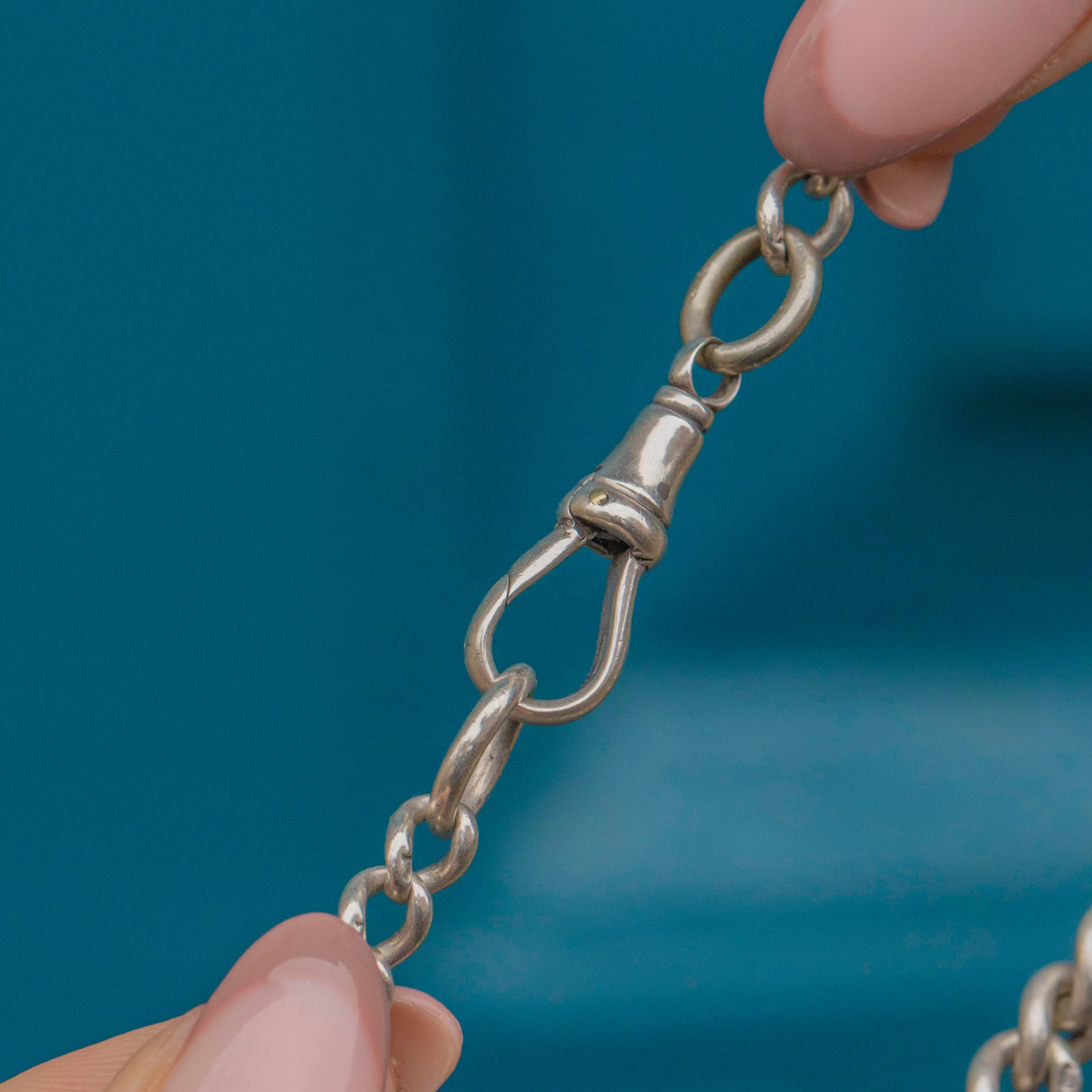 EXCELLENT. We are pleased to present this antique Silver graduating Albert chain in excellent condition. Her links are uniform and secure, with a lovely chunky feel and her Dog-clip is in great working order. With a full set of hallmarks dating to 1885, this Victorian chain will make a coveted addition to your collection!