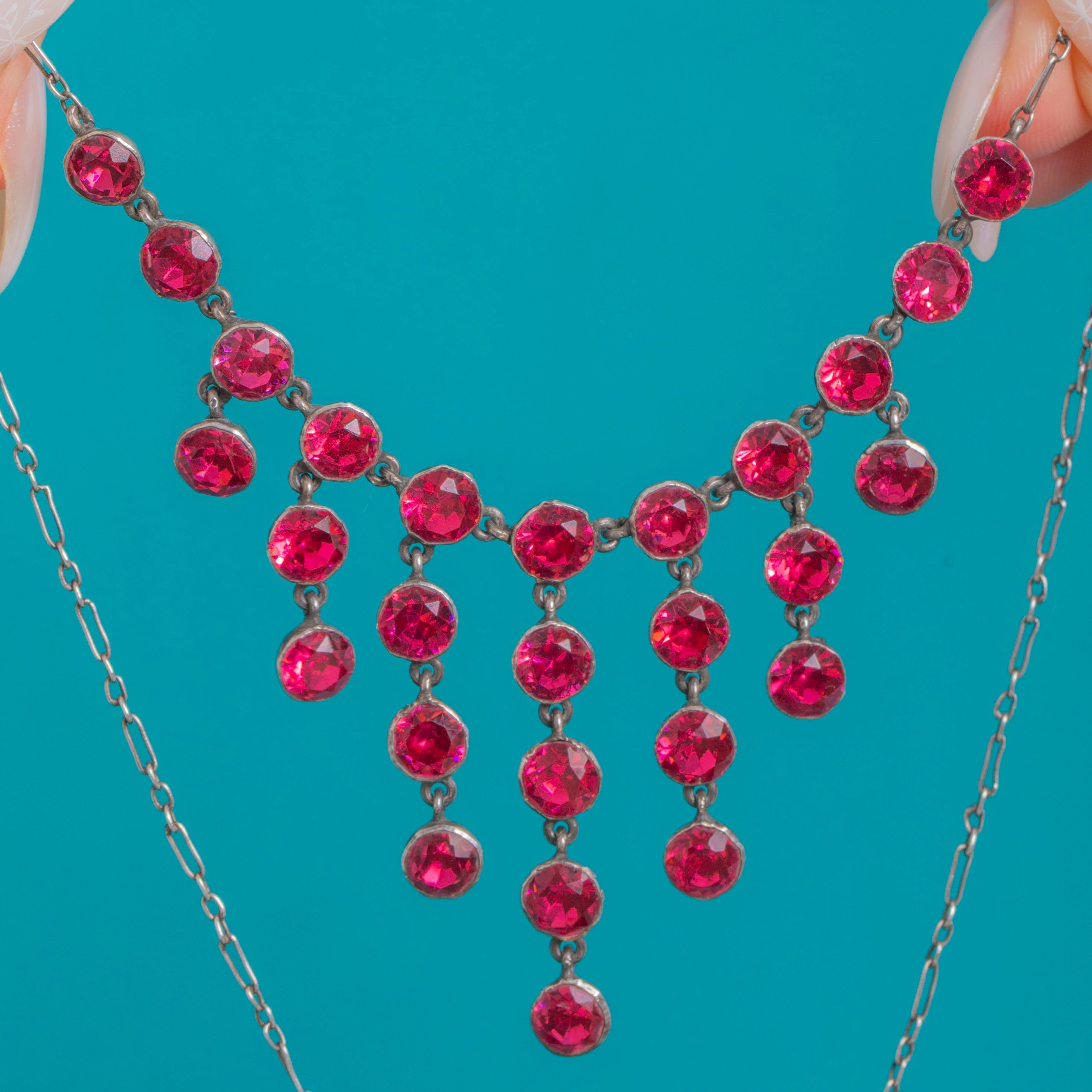 Antique Silver Hot Pink Paste Cascade Necklace - Orange Foil 1920's