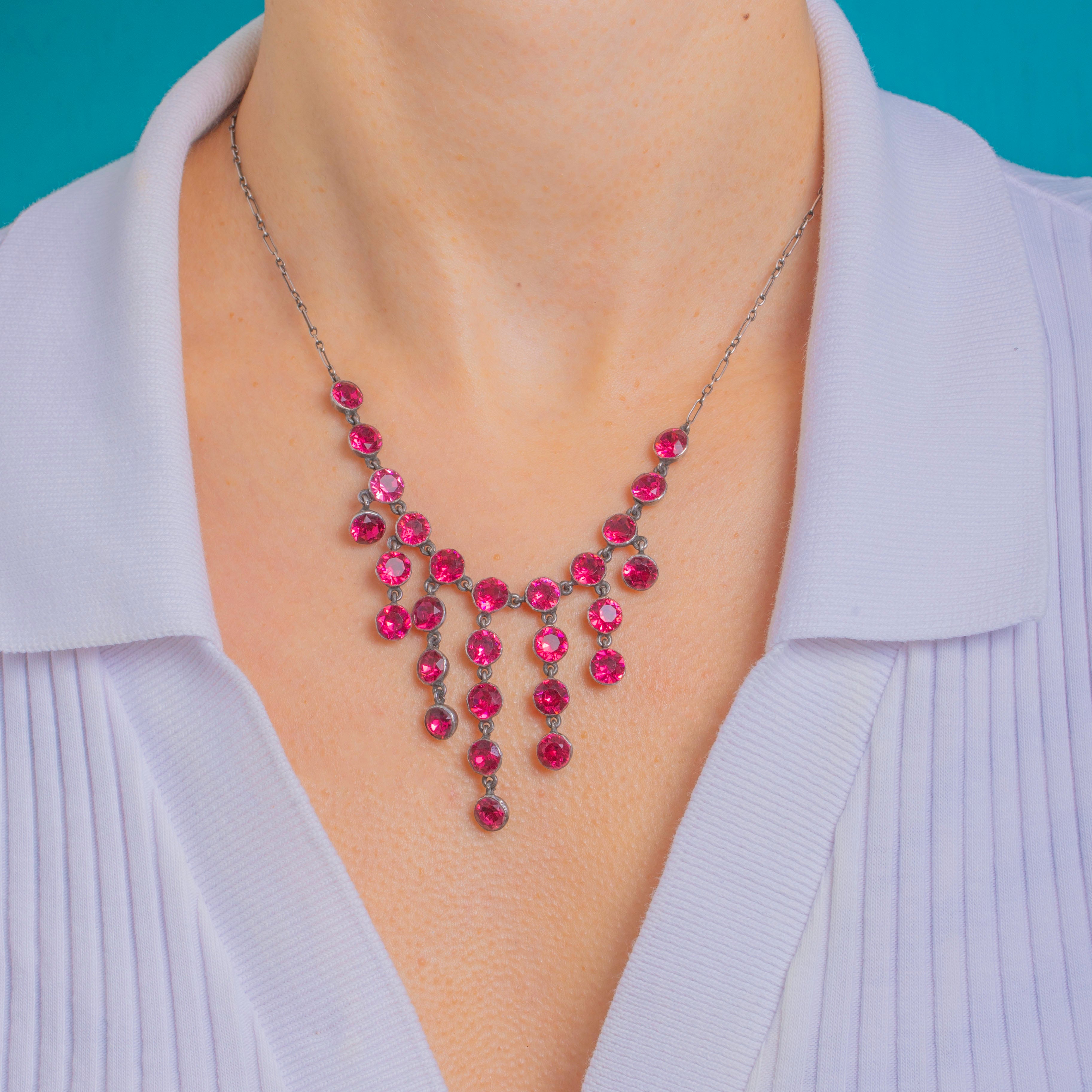 Vivid and vivacious, this Art Deco cascade necklace dazzles with a rivière of hot pink Paste stones culminating in five graduated fringe drops. Each round, faceted jewel is cradled in Silver bezel settings and linked for beautiful fluidity and movement. Orange foils beneath the stones lend a warm, sunset glow, amplifying the fuchsia hue for an undeniably glamorous finish.