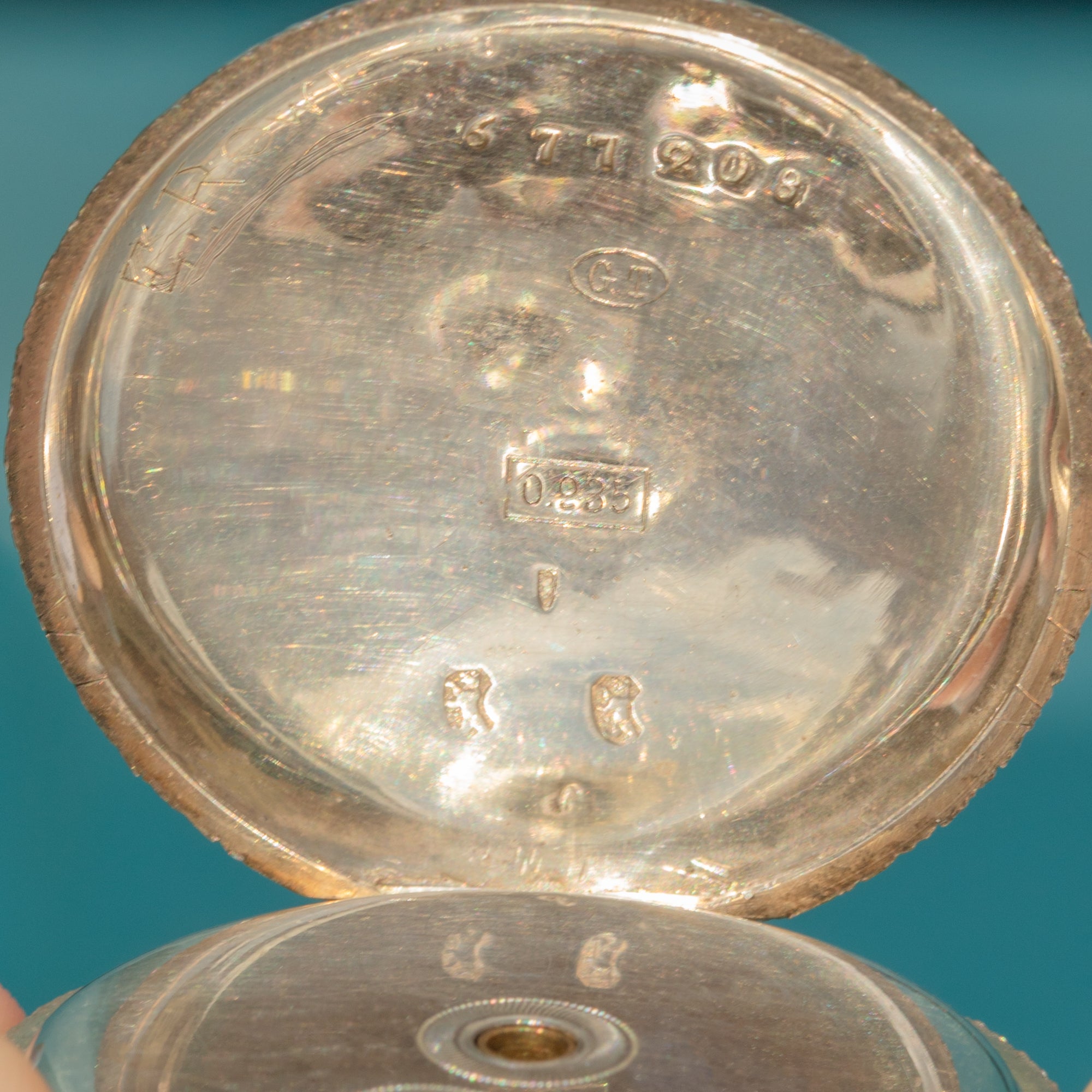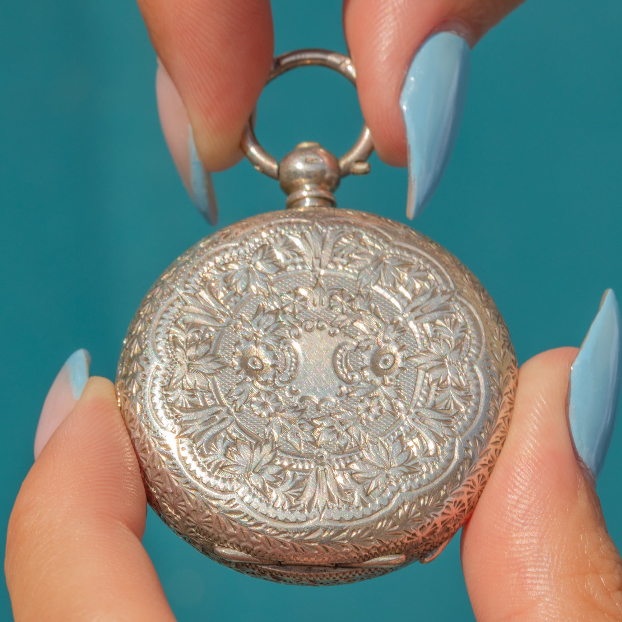 A historic late Victorian find, this immaculately engraved antique Swiss Silver pocket watch features the Swiss Three Bears hallmark and is crafted from 935 Silver, dating this finely crafted piece to post 1887.