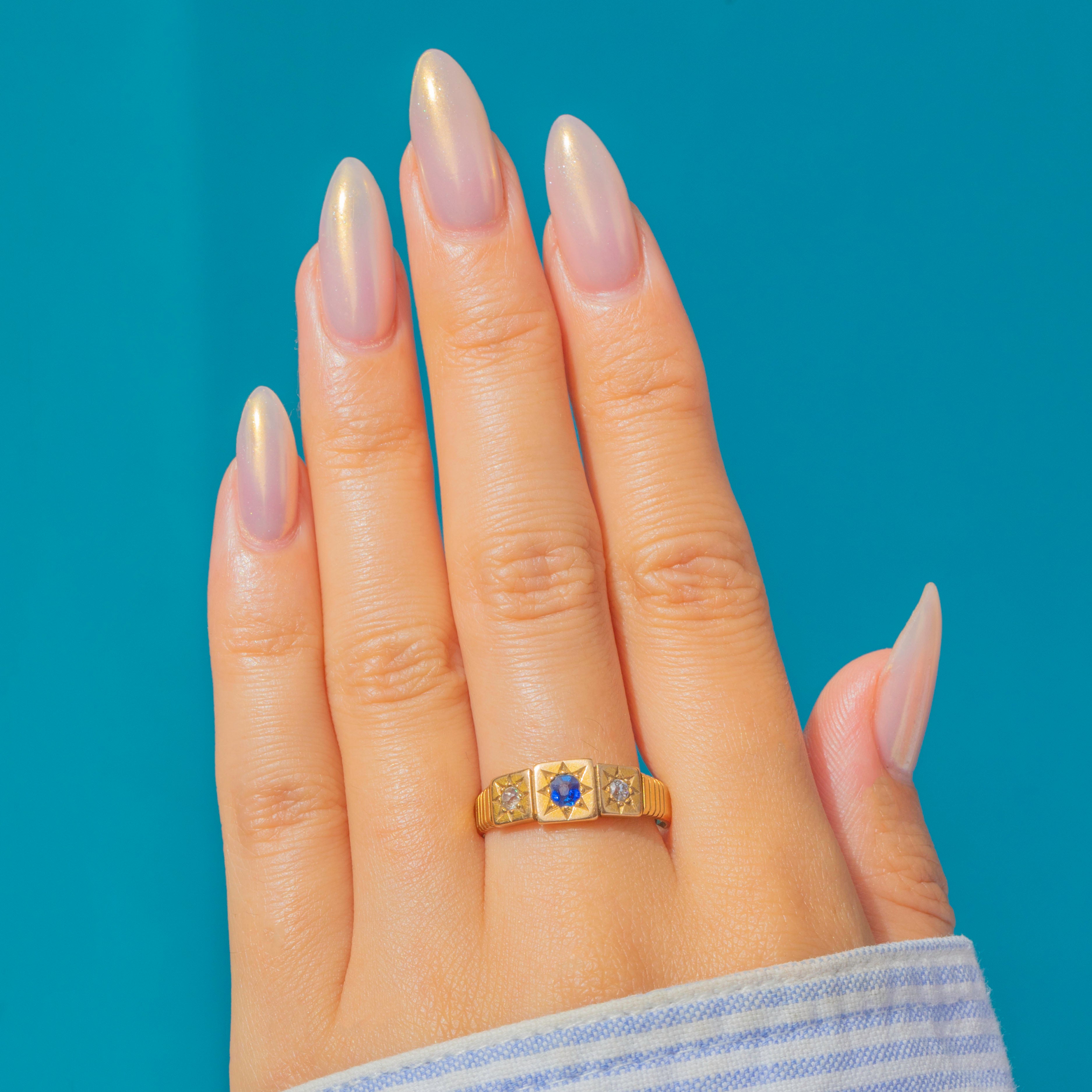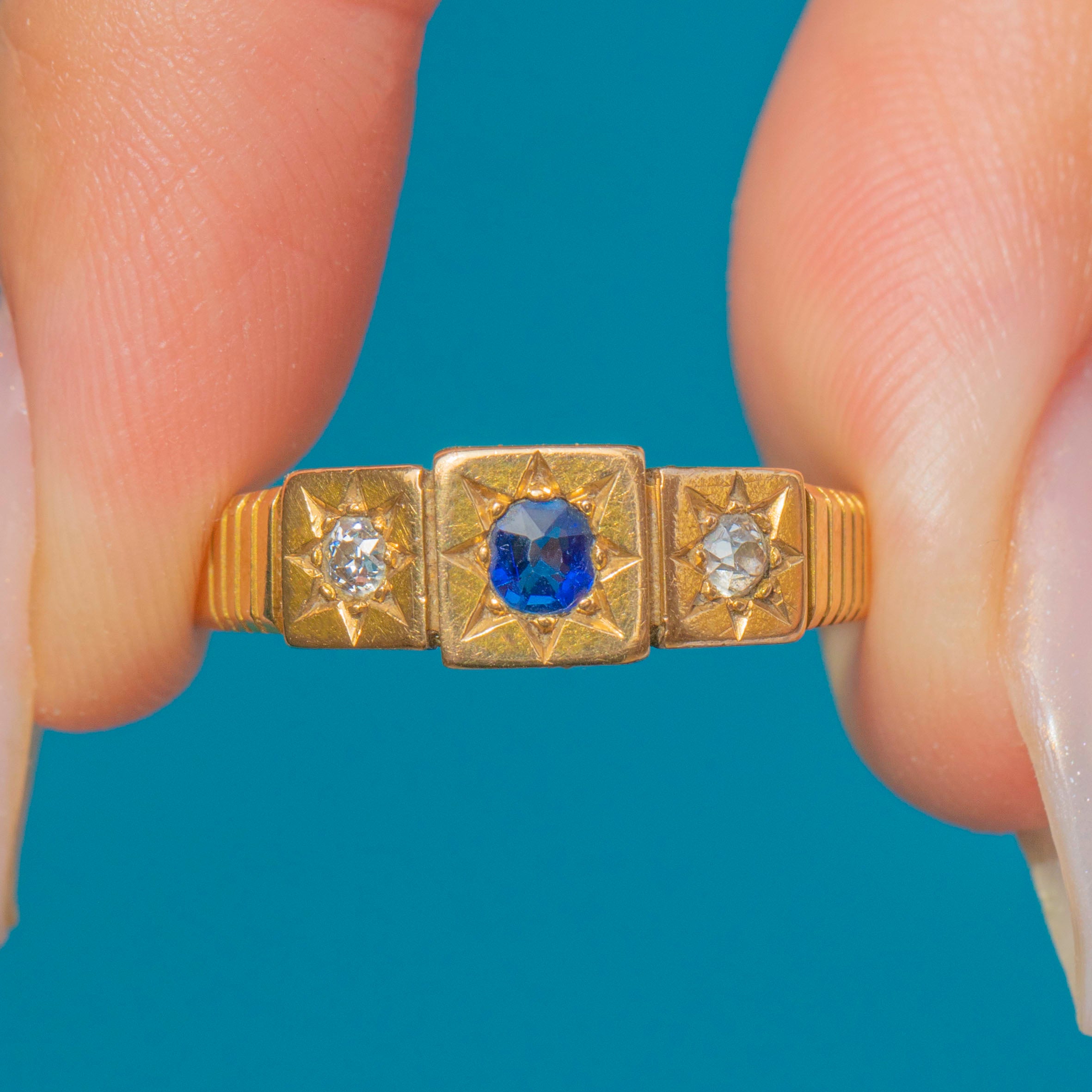 A superb antique Victorian gypsy ring in solid 18ct Gold, star-set with a vivid blue Sapphire and two sparkling Diamonds. Each stone is set within a crisp hand-engraved 8-pointed star, catching the light beautifully.