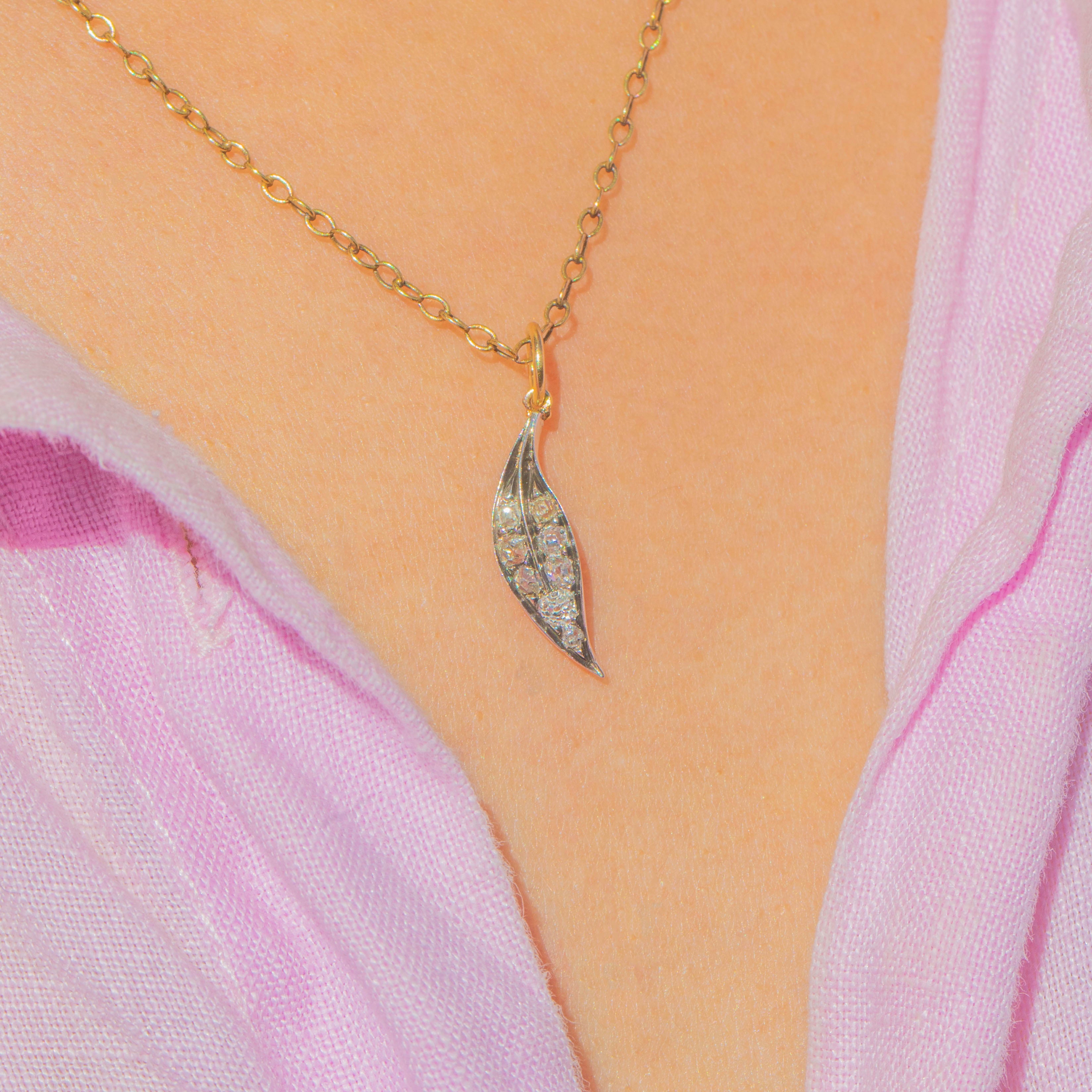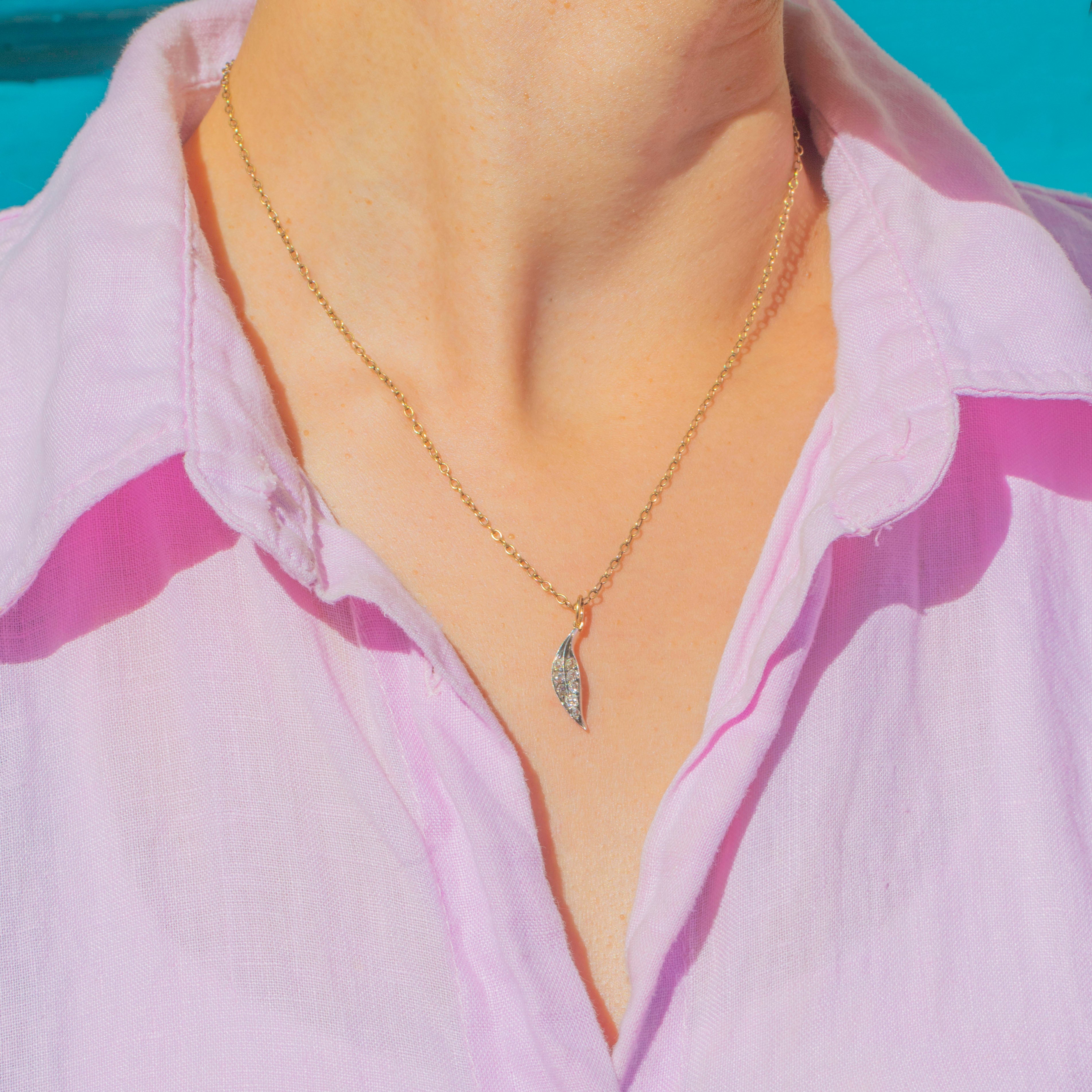 This elegant Victorian Diamond leaf charm is a fine example of antique naturalism in jewellery. The graceful leaf form is delicately set with two rows of glittering old mine-cut Diamonds, eight in total, giving the piece a sparkling yet subtle appeal.