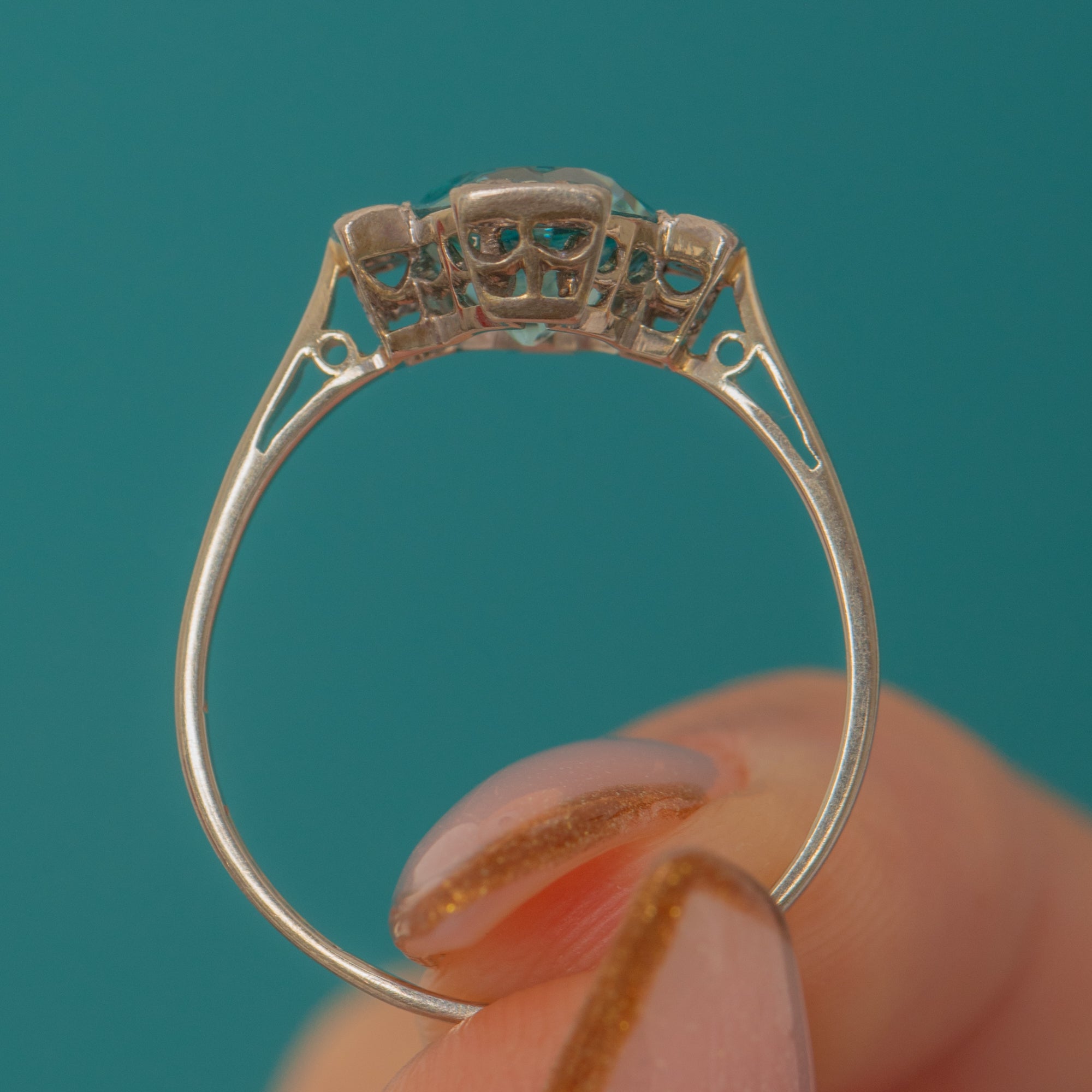 A breathtaking Art Deco ring combining timeless elegance with vivid sparkle. At its heart lies a bright 2.00ct sky-blue Zircon — prized for its natural brilliance and fire — framed by eight twinkling antique Diamonds in Platinum settings.