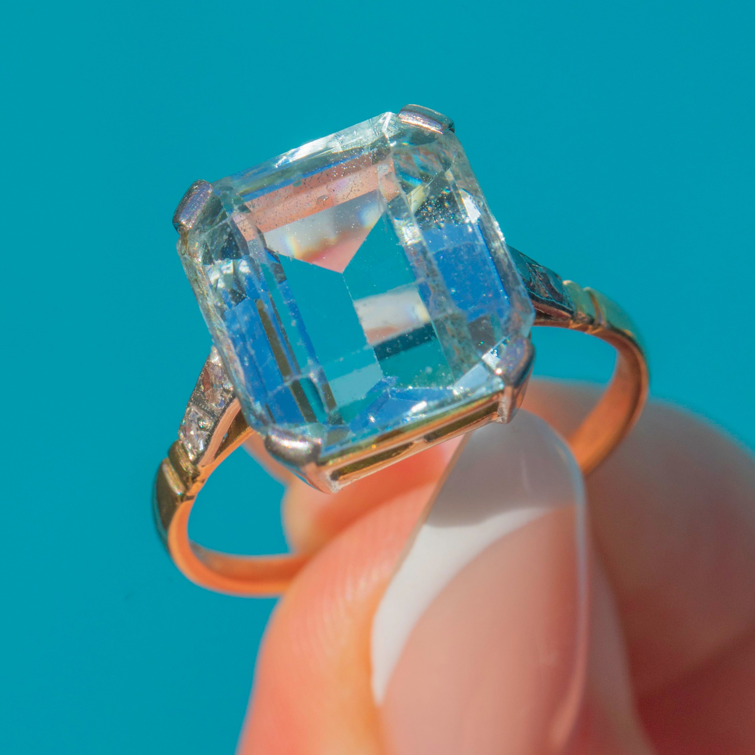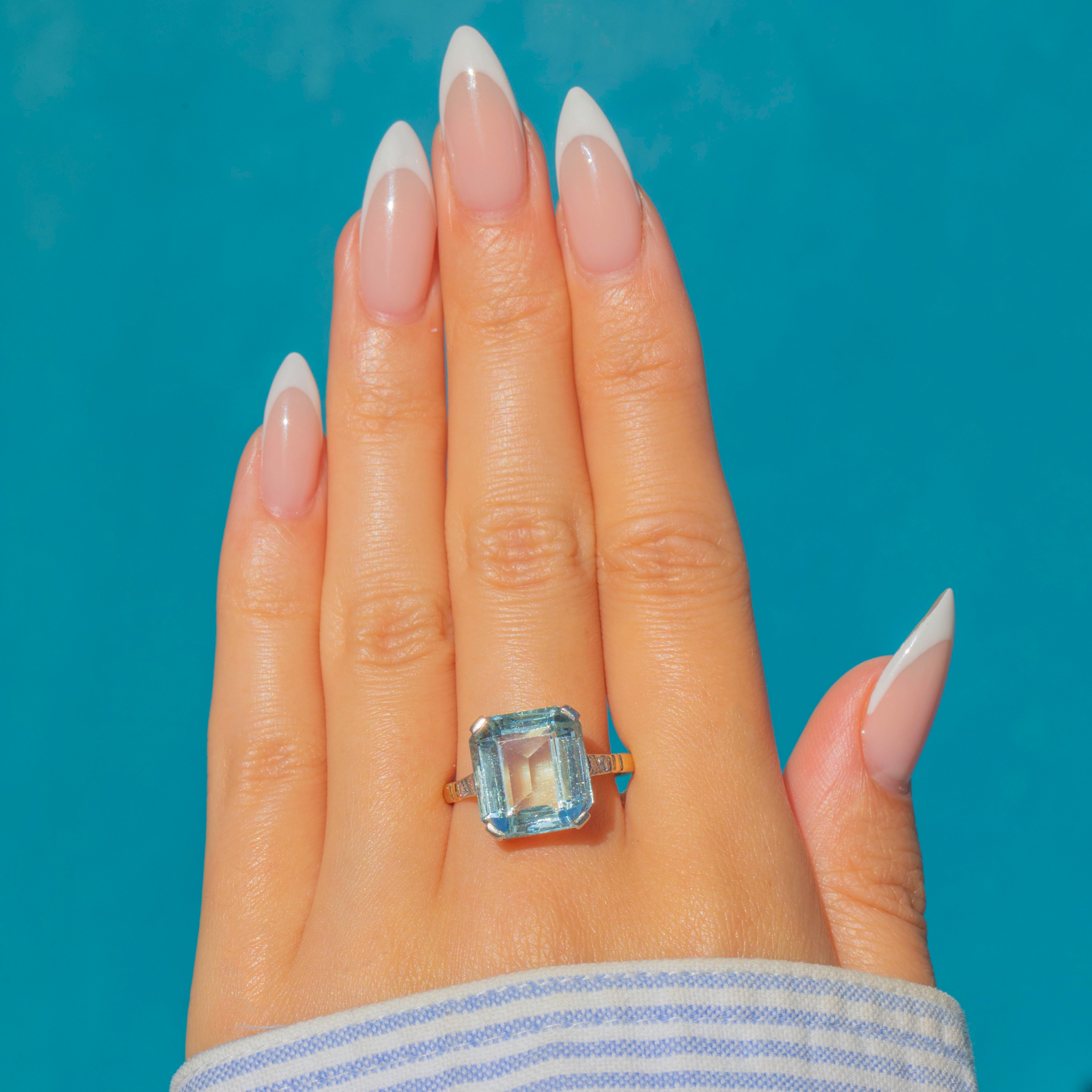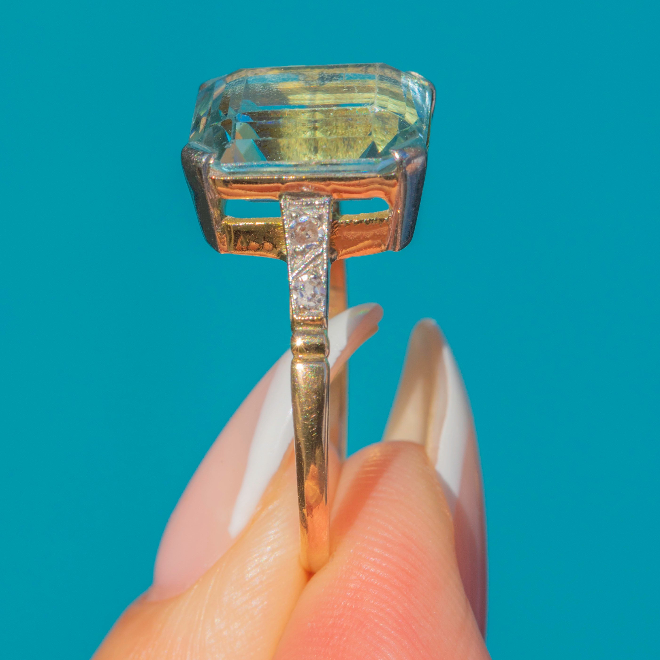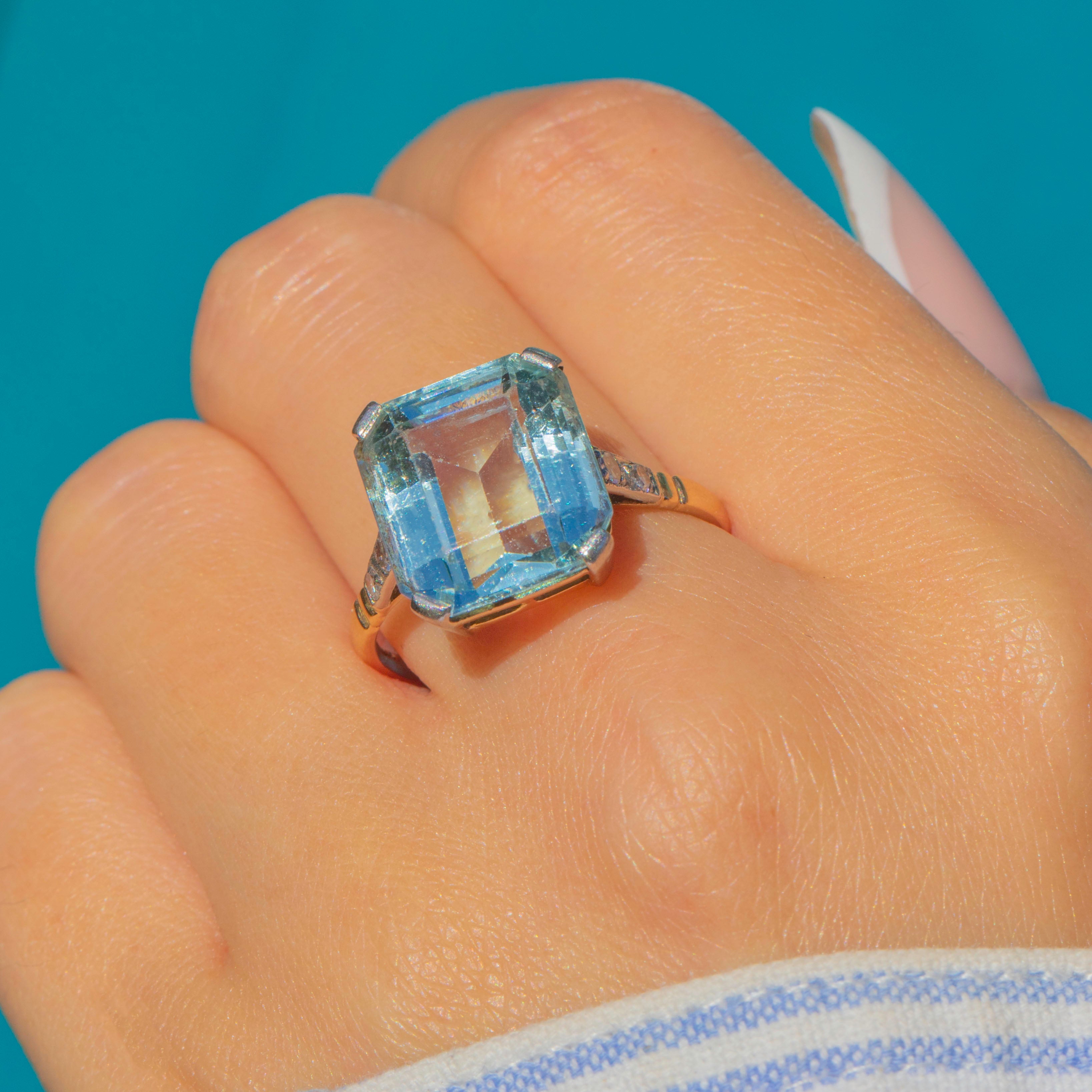 A magnificent Art Deco Aquamarine ring, crafted in 18ct Gold with Platinum settings. At its heart sits a large rectangular cut Aquamarine of exceptional clarity and colour, weighing approximately 5.50ct. Its cool blue hue and striking geometric cut epitomise the glamour and elegance of the Art Deco era.