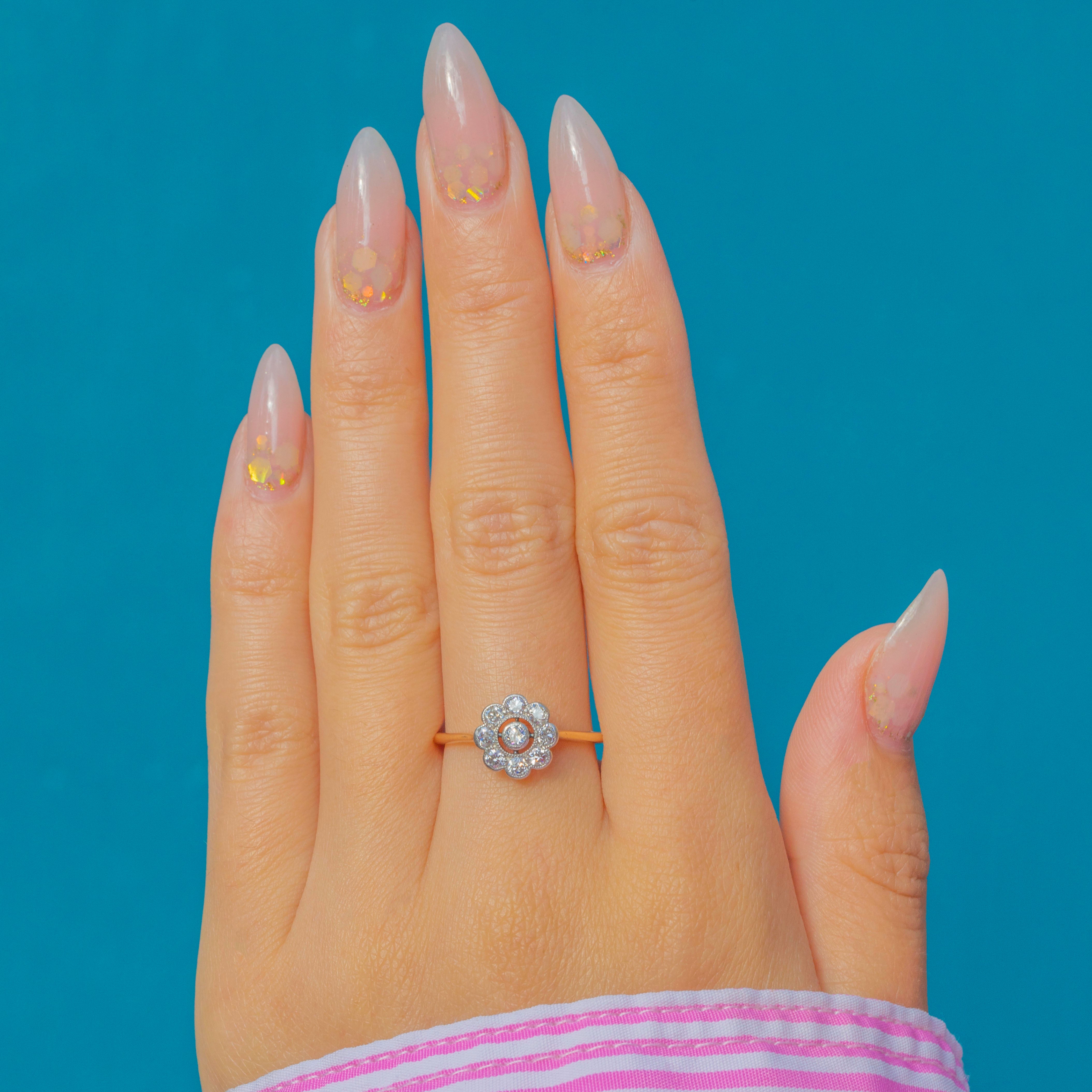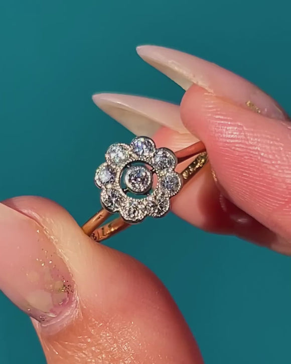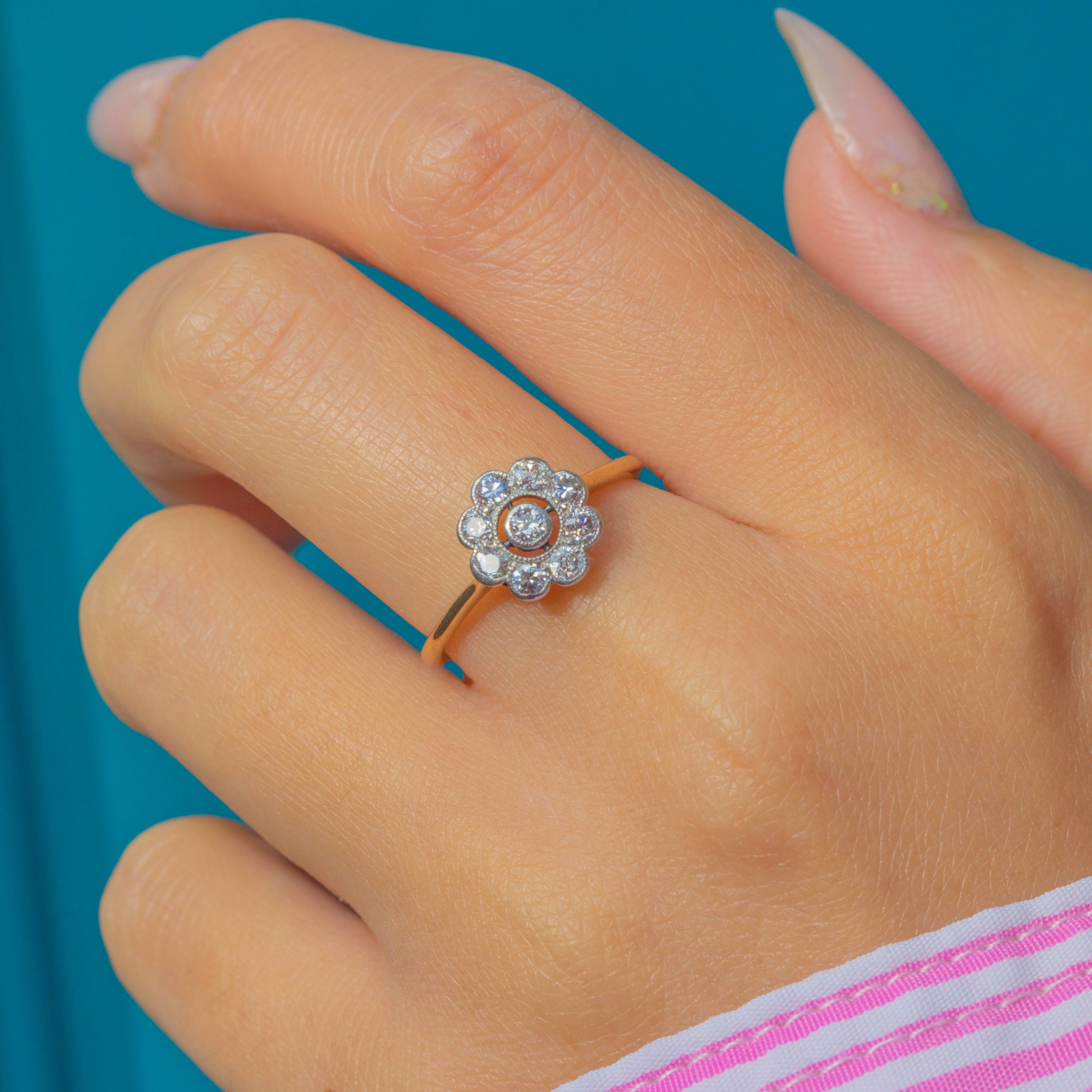 A classic Art Deco engagement ring crafted in 18ct Gold, designed in a charming flower cluster motif. The central old-cut Diamond is haloed by eight smaller stones, creating a bright, glittering display that radiates across the finger. The millegraine edging adds delicate texture and a refined antique touch.