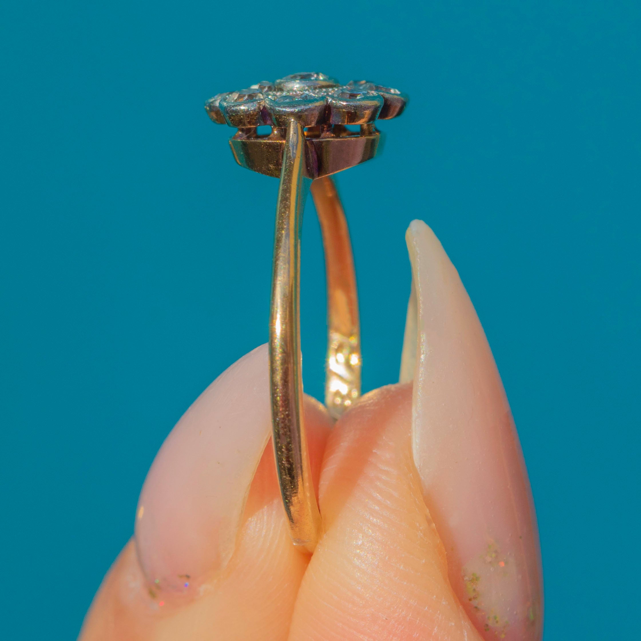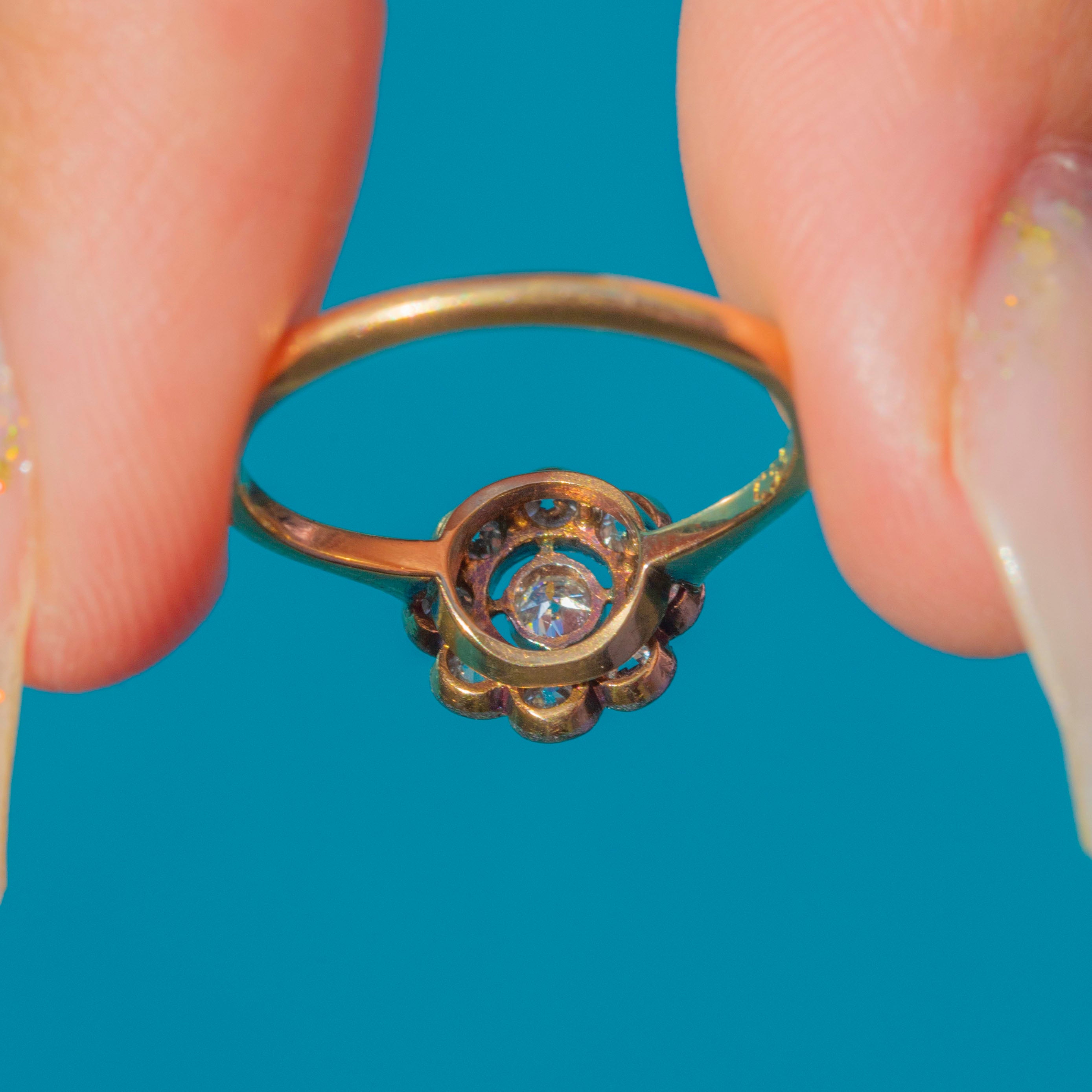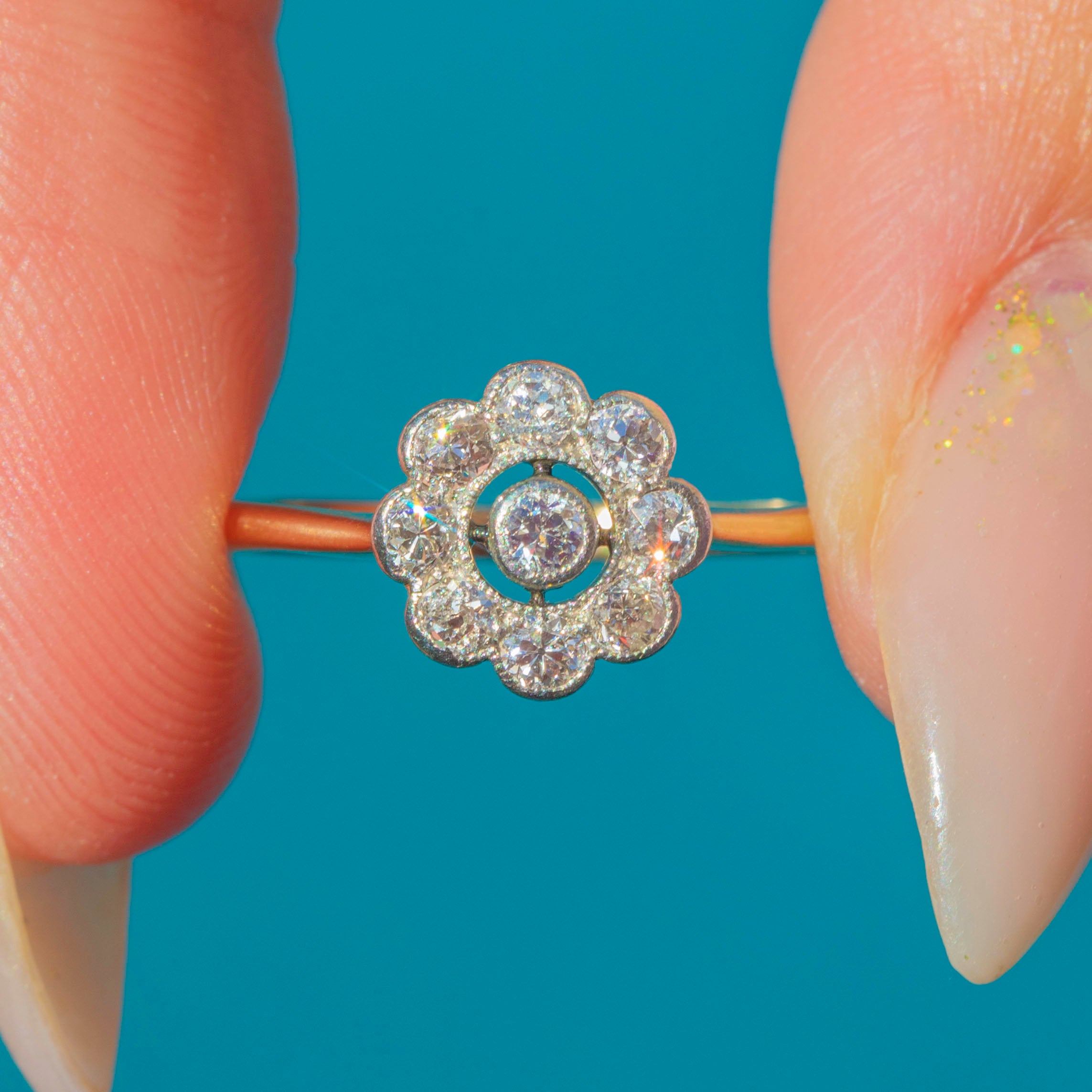 A classic Art Deco engagement ring crafted in 18ct Gold, designed in a charming flower cluster motif. The central old-cut Diamond is haloed by eight smaller stones, creating a bright, glittering display that radiates across the finger. The millegraine edging adds delicate texture and a refined antique touch.