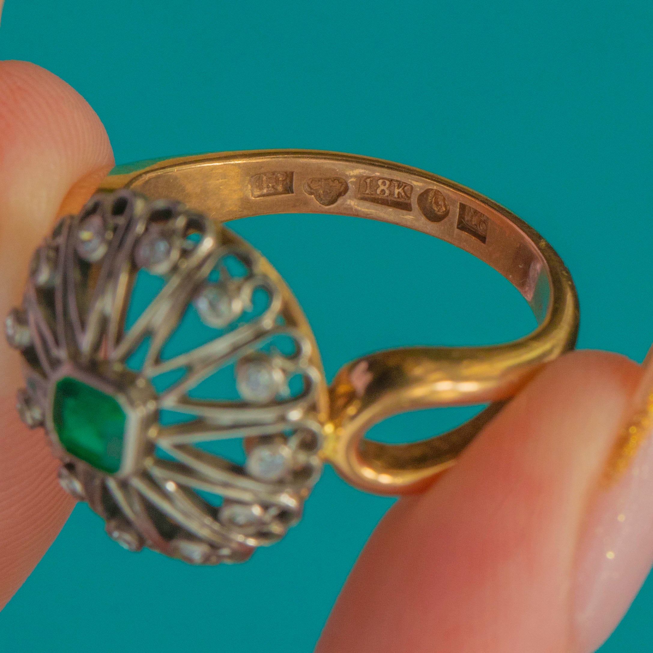 EXCELLENT: The Emerald is bright with good colour, secure in its setting and free from chips to the naked eye. The Diamonds are lively and well-matched, with minimal age-related wear. The 18ct Gold band and starburst setting are smooth, sturdy and well-preserved with only light surface marks from gentle wear; the Swedish stamps remain clear and legible.