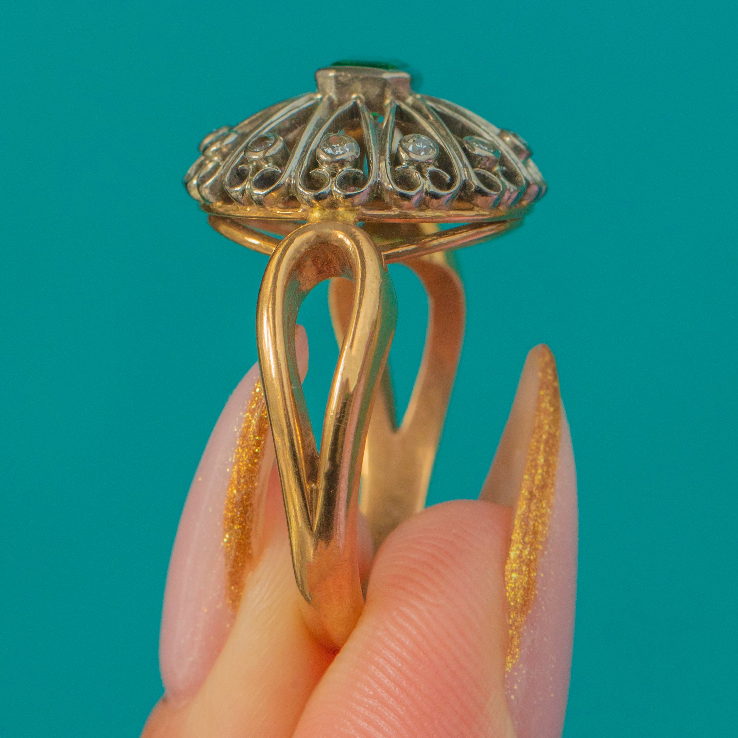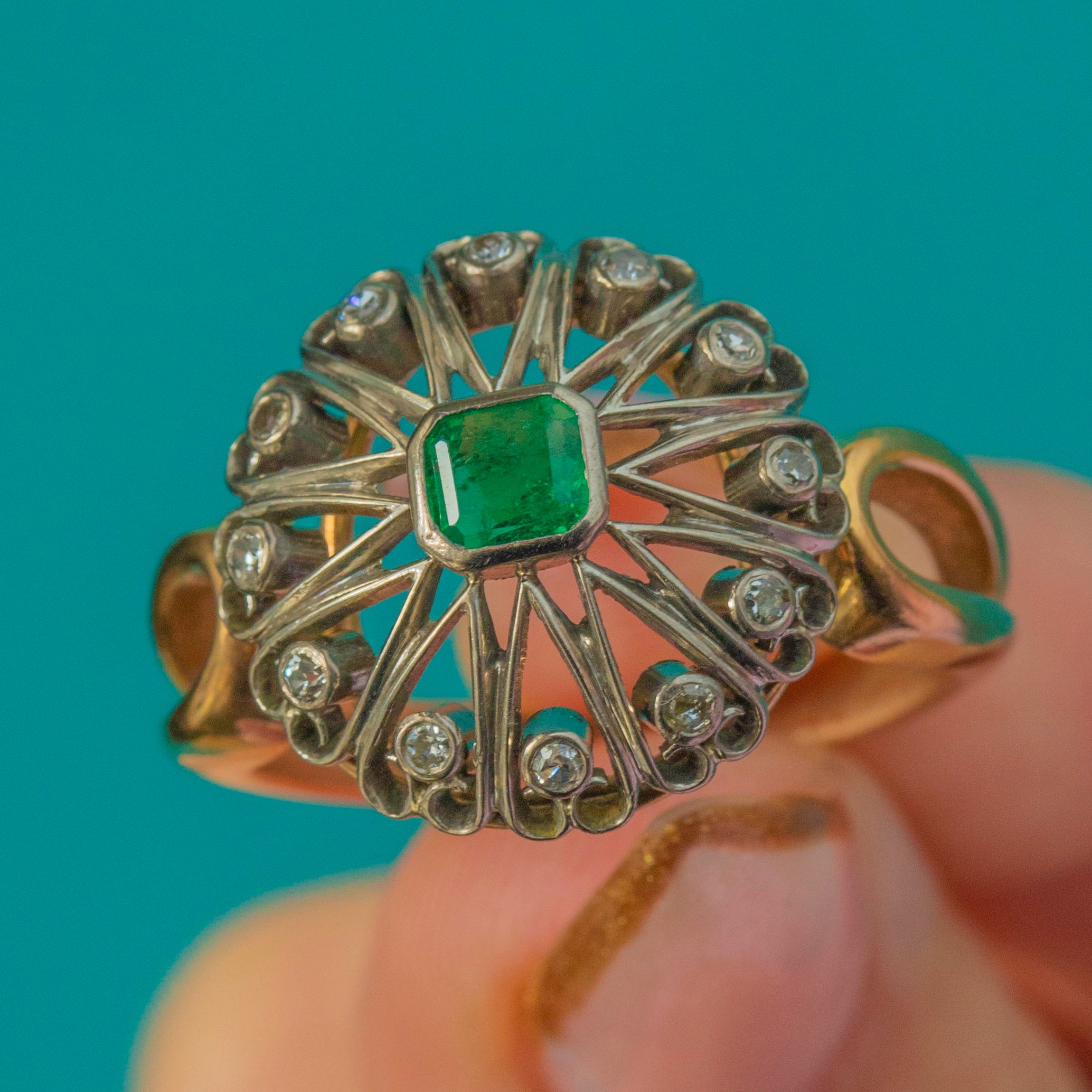 Crafted in Sweden and dated 1949, it has a lovely sense of presence on the hand thanks to its solid 18ct Gold setting and beautifully detailed openwork design. The Emerald’s saturated colour and the bright Diamonds make this ring the perfect statement piece.