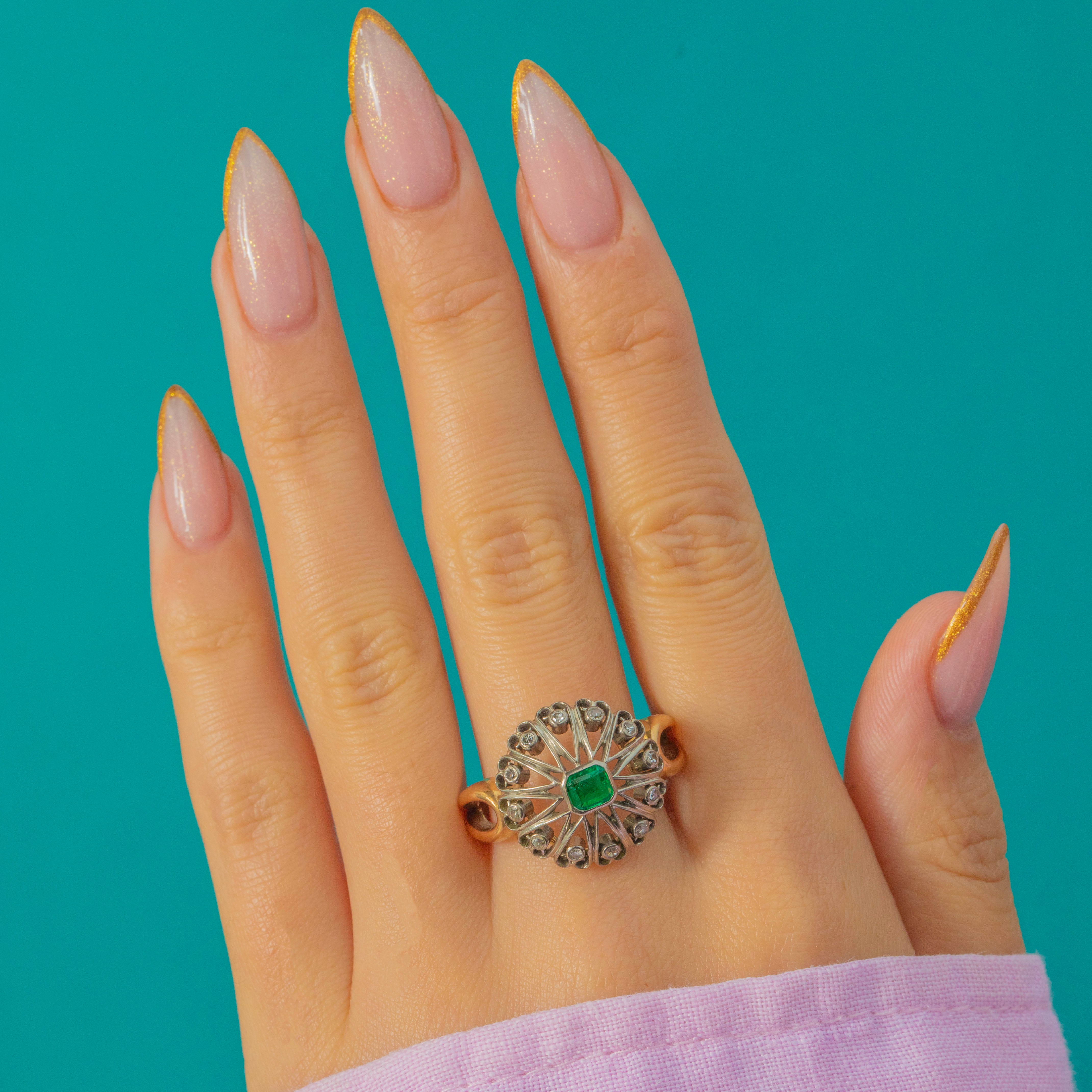 This fabulous Art Deco 18ct Gold Emerald and Diamond ring is a real show-stopper. The bold starburst cluster radiates from a vivid green Emerald centre, framed by sparkling antique-cut Diamonds that catch the light from every angle. It has that glamorous, architectural Deco look that feels both dramatic and wearable.