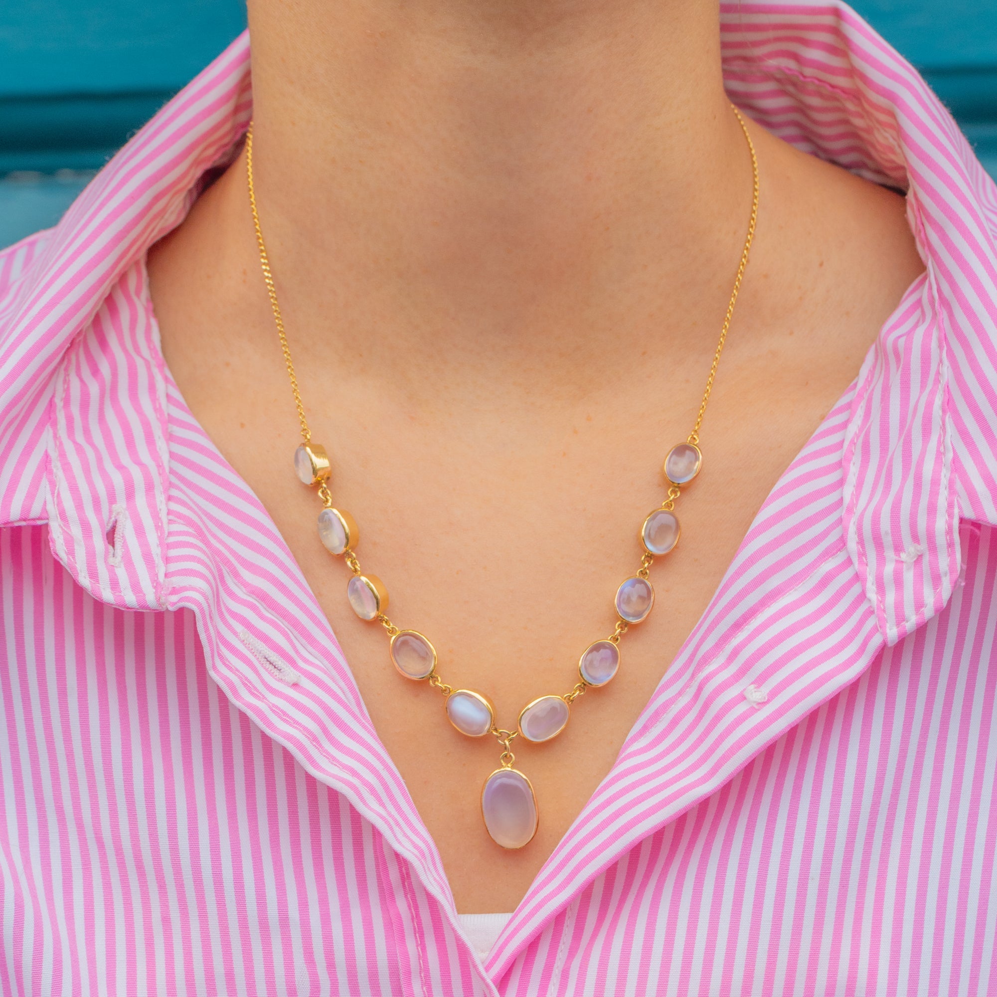 This spectacular Art Deco necklace glows with a luminous array of natural Moonstones, each shimmering with the ethereal blue adularescence that makes this gem so enchanting. The graduating cabochons are bezel-set in rich 18ct Gold, their soft tones and smooth curves forming a wonderfully elegant drape around the neckline.