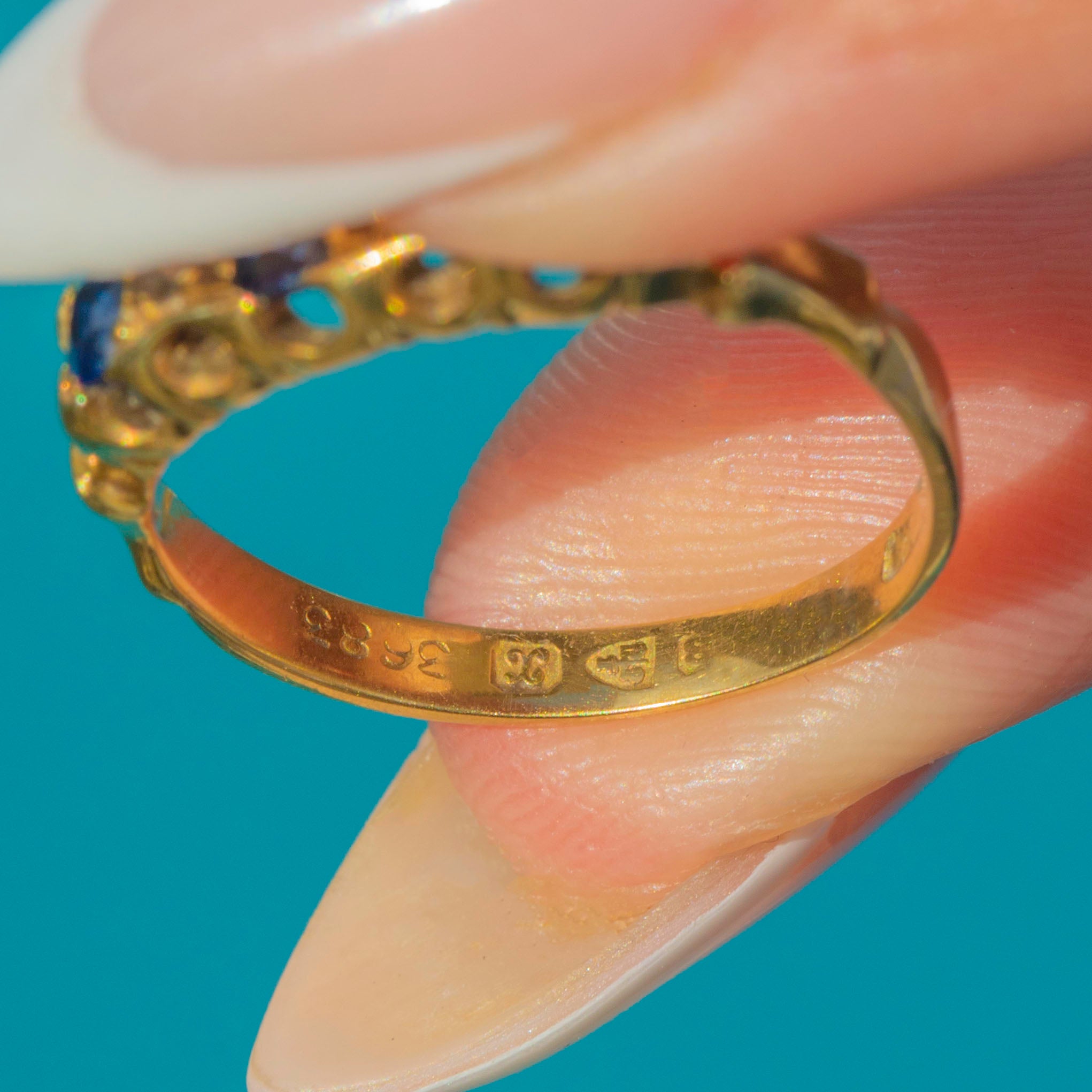 VERY GOOD: Stones are bright and securely set with no chips visible under magnification. The 18ct Gold band shows a neat historical resize at the reverse and only light surface wear from age. Well cared-for and ready to wear.