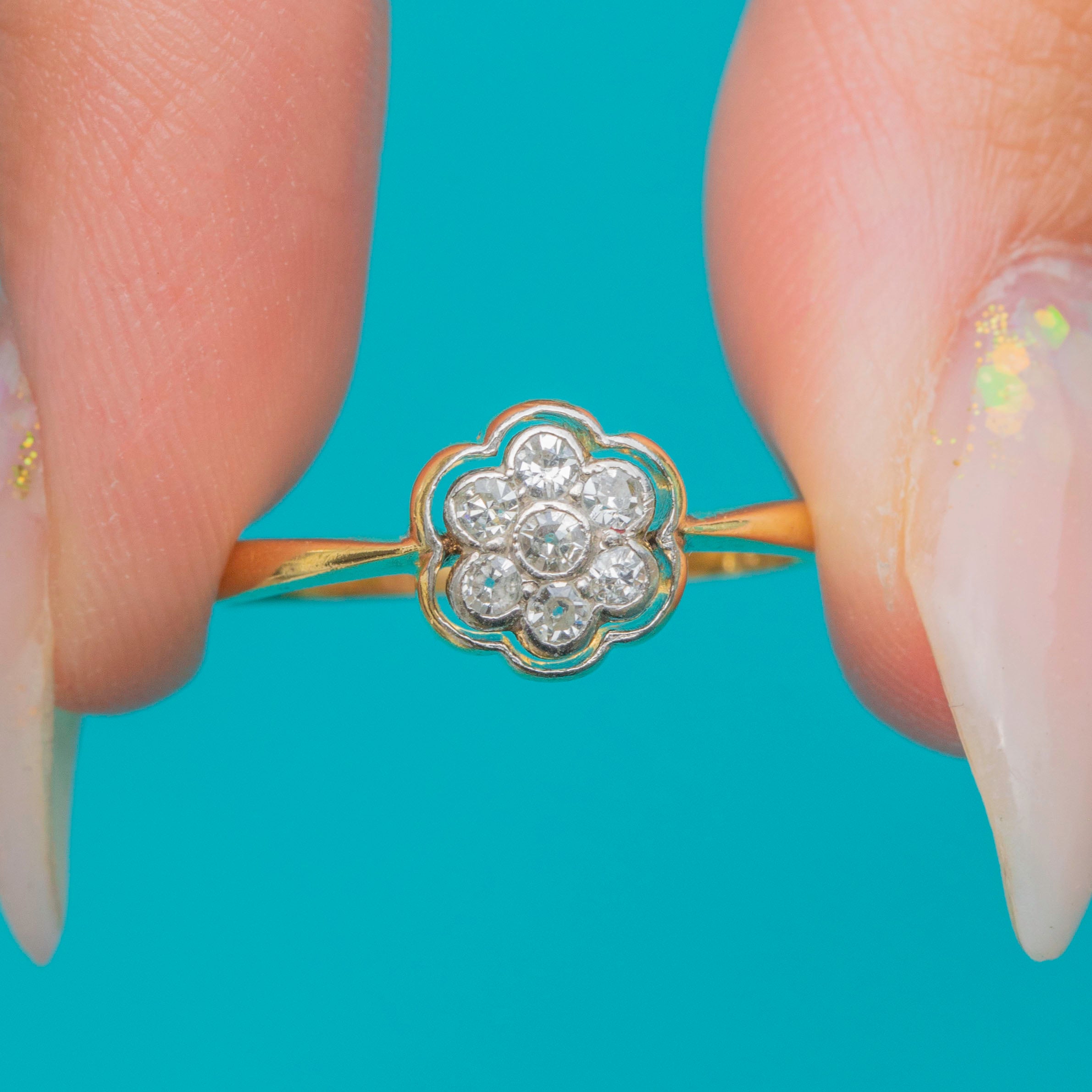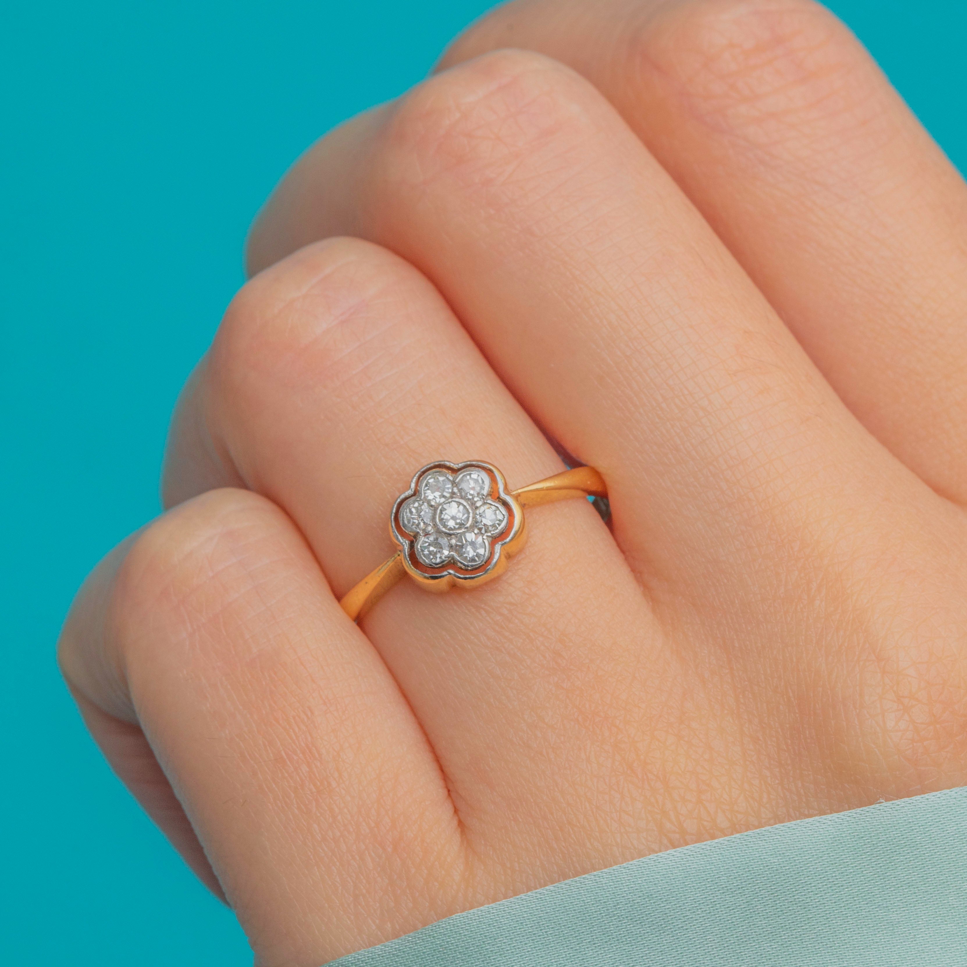 Beautifully proportioned and light on the hand, this antique cluster ring sparkles with timeless charm, making it a perfect choice for an engagement ring or an heirloom-worthy addition to a collection.