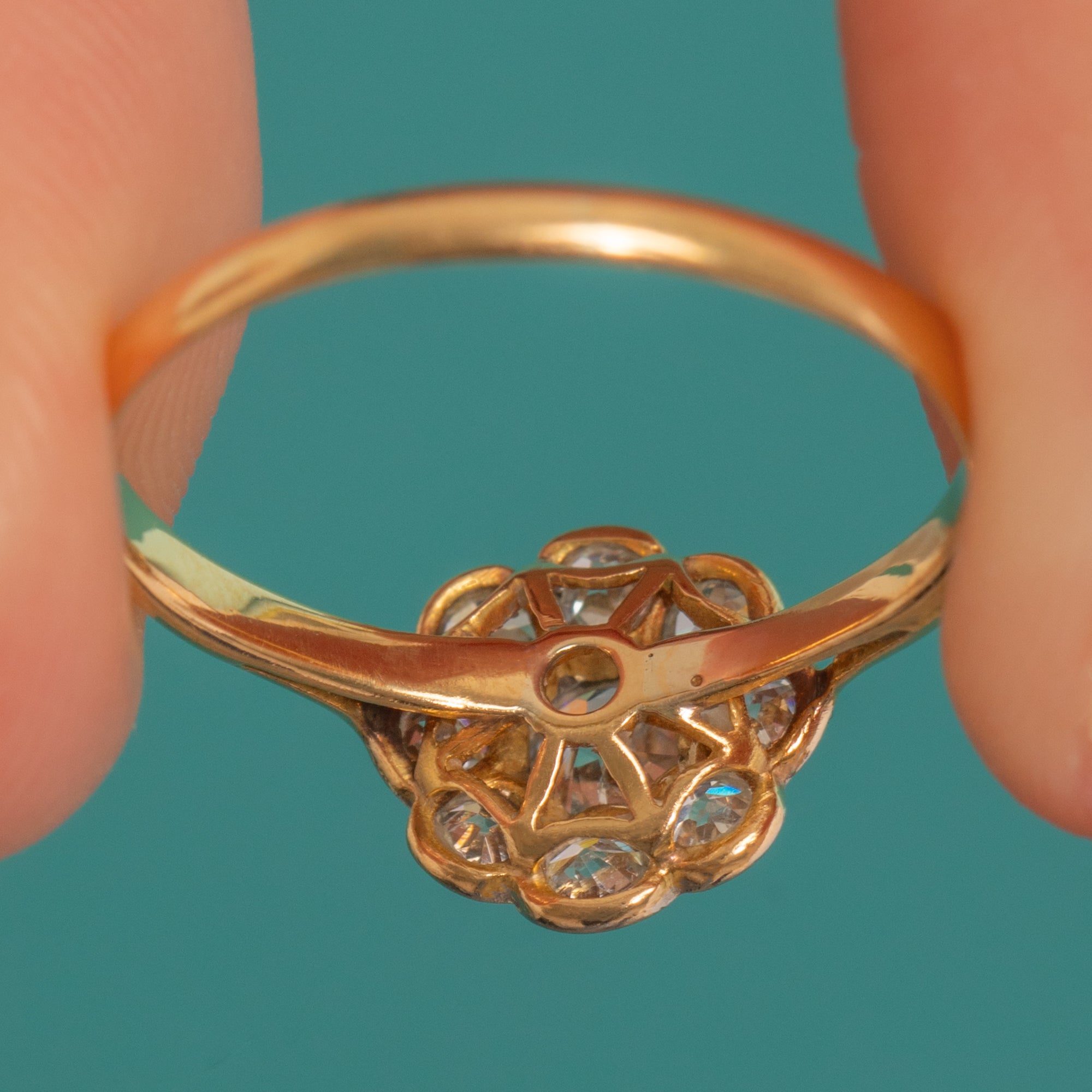 A refined Art Deco daisy cluster ring crafted in 18ct Gold with a Platinum scalloped head, set throughout with sparkling Old Mine Cut Diamonds. The central stone is hugged by a halo of eight matching Diamonds, each set in smooth bezels.