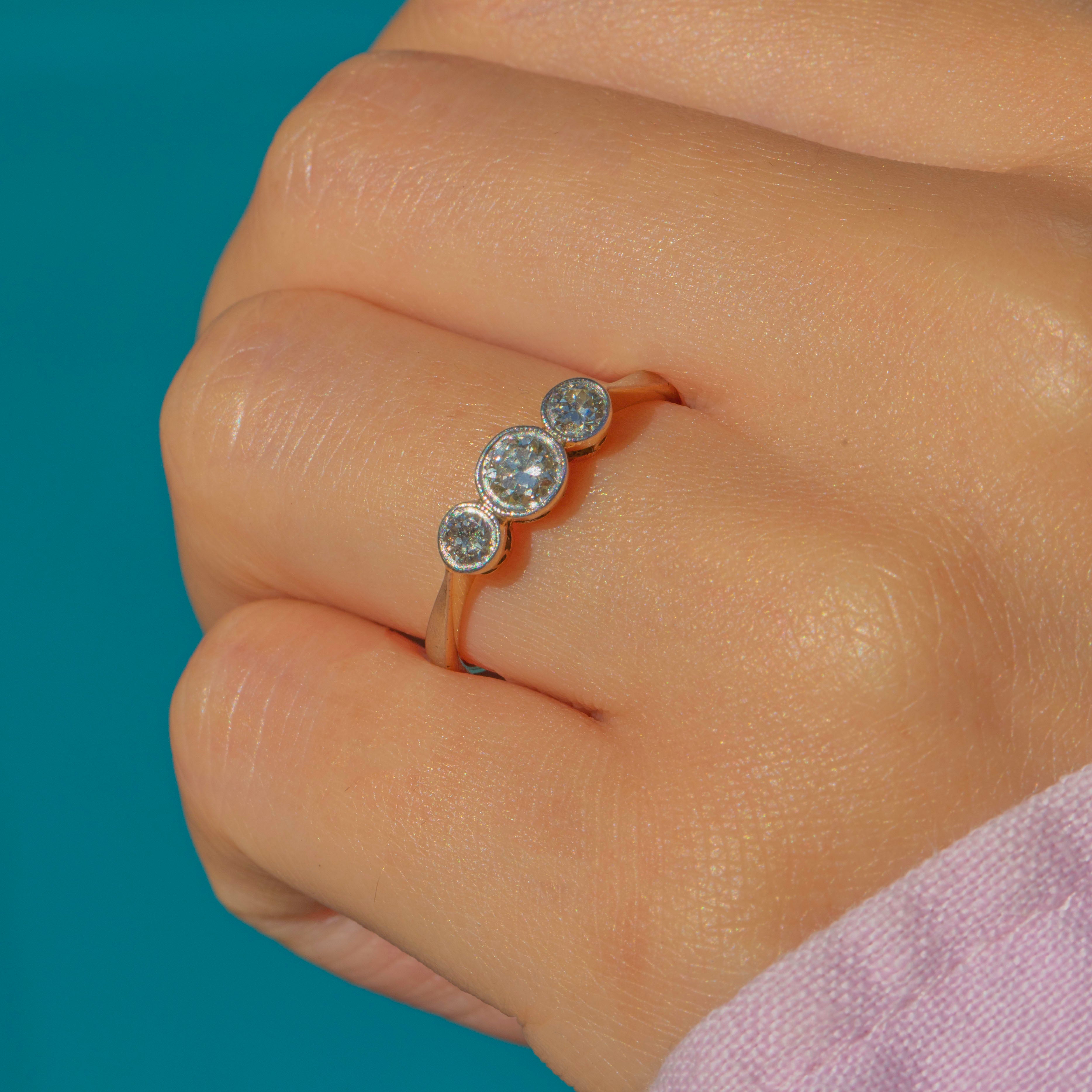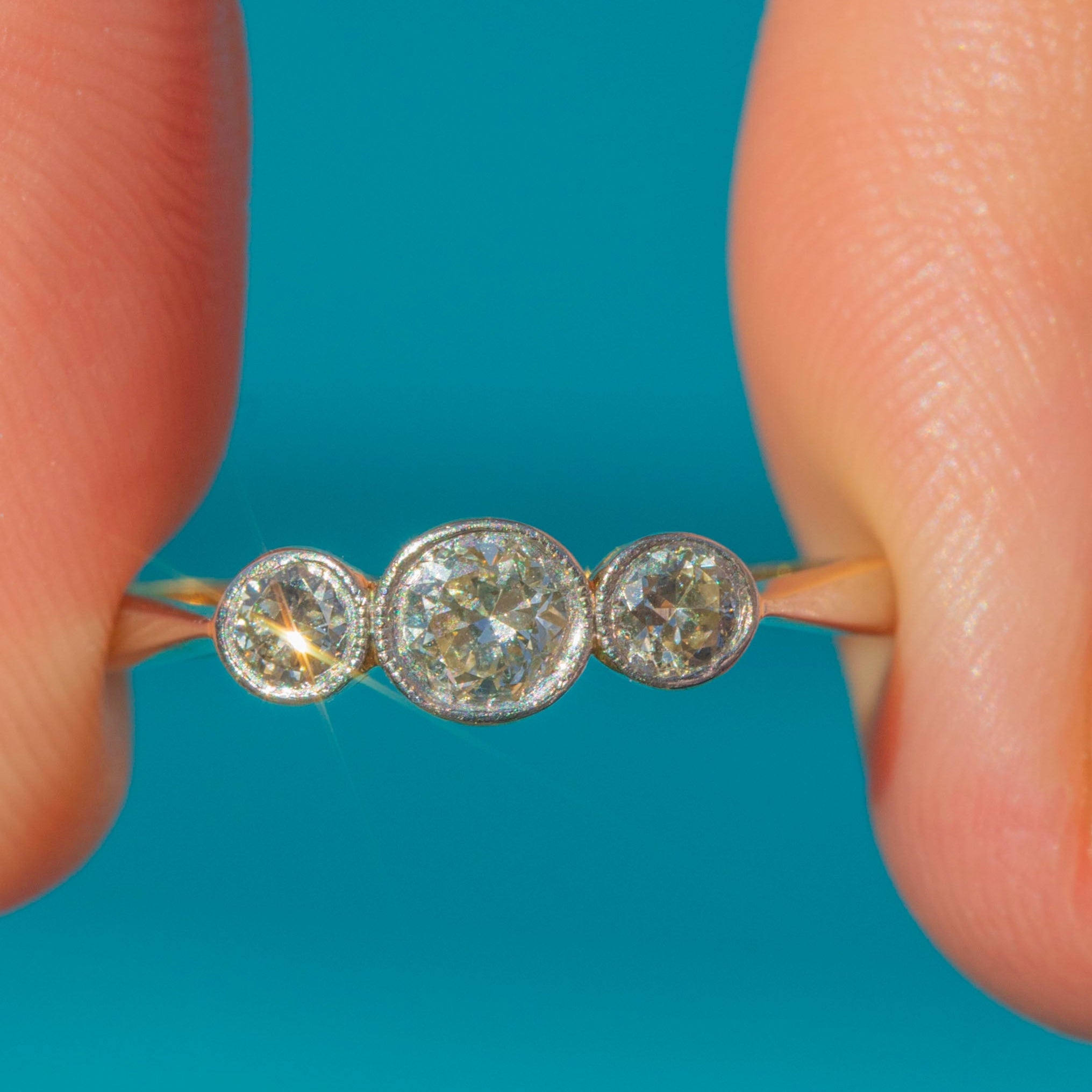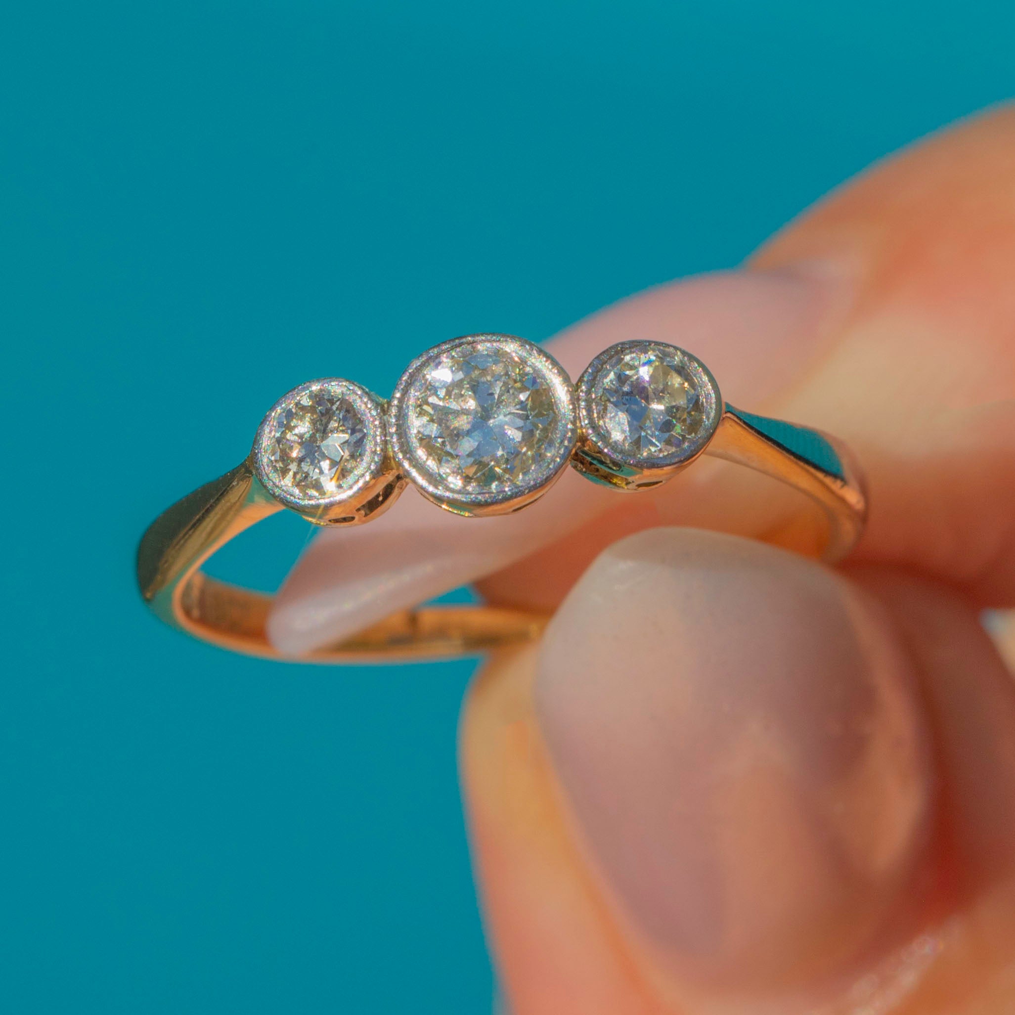 Symbolising the past, present, and future, the trilogy design has long been cherished as a romantic engagement ring style. This Art Deco trilogy ring, crafted c.1920, is set in 18ct Yellow Gold with Platinum settings and features three sparkling antique transitional cut Diamonds.