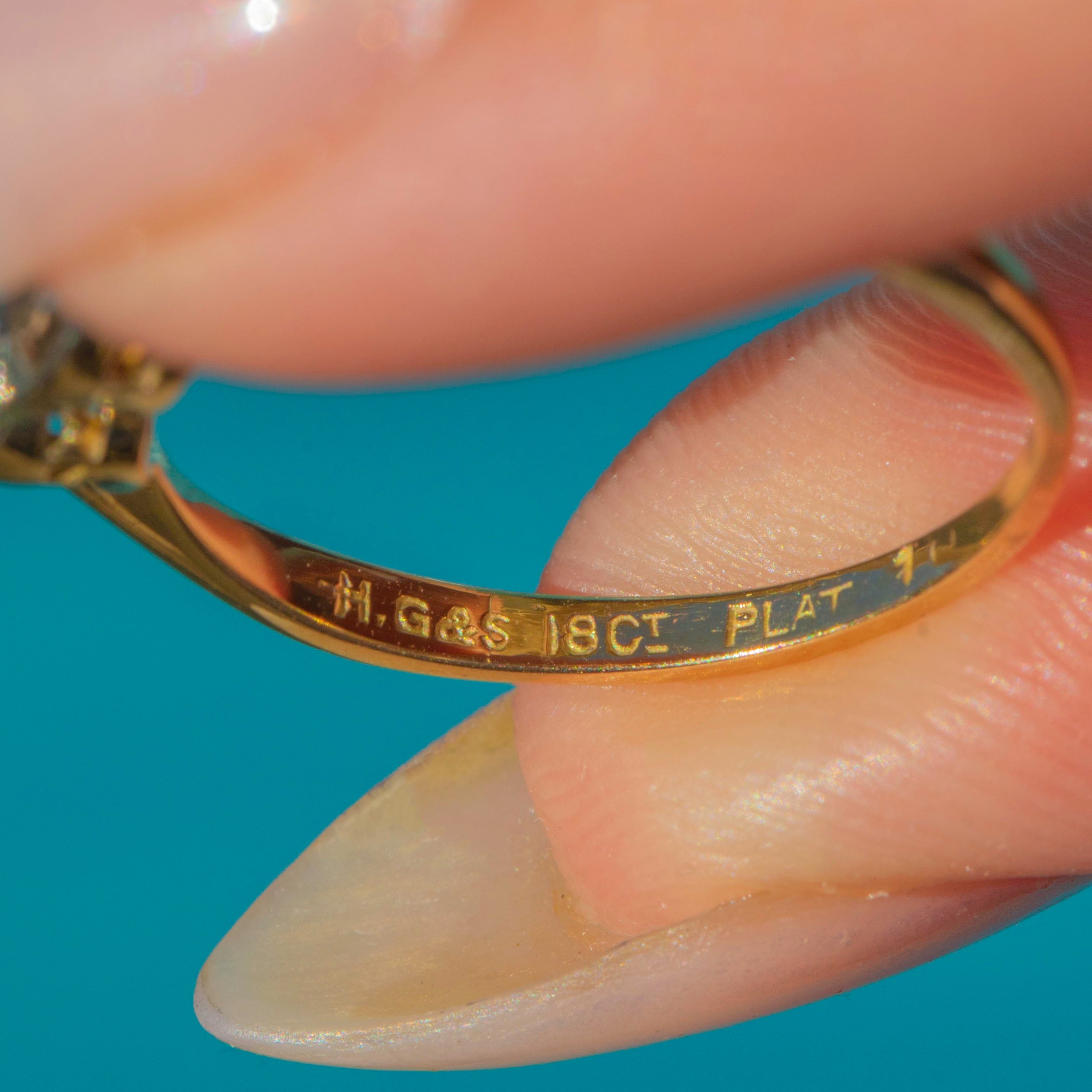 EXCELLENT: The Diamonds are bright with no chips, scuffs or abrasions. Bezel settings are smooth and secure. Band shows no resizing marks and is suitable for future resizing if required. Clear antique hallmarks for “H.G. & S”, “18CT” and “PLAT” remain inside the shank.
