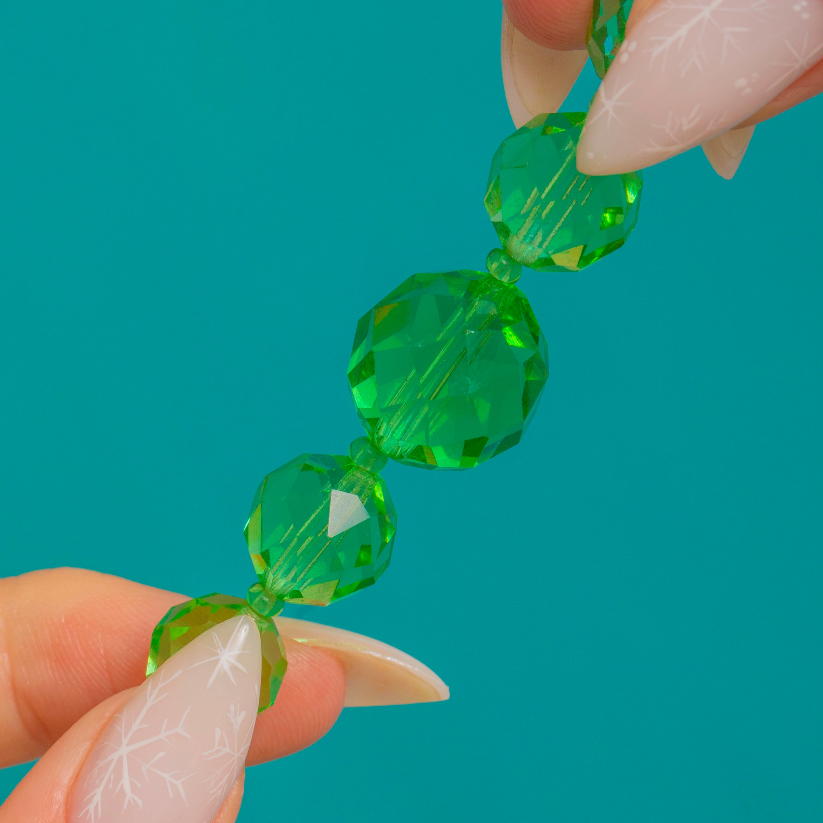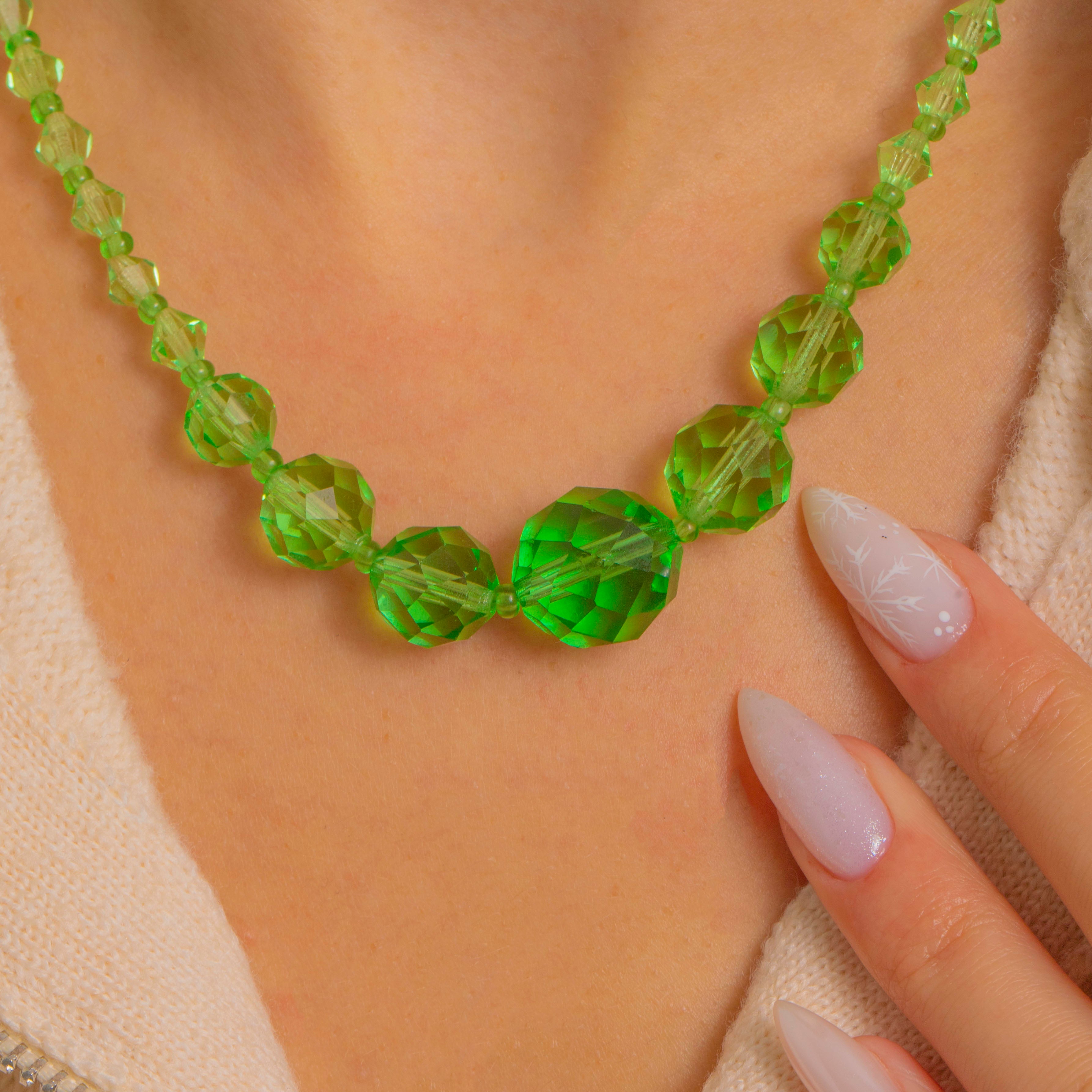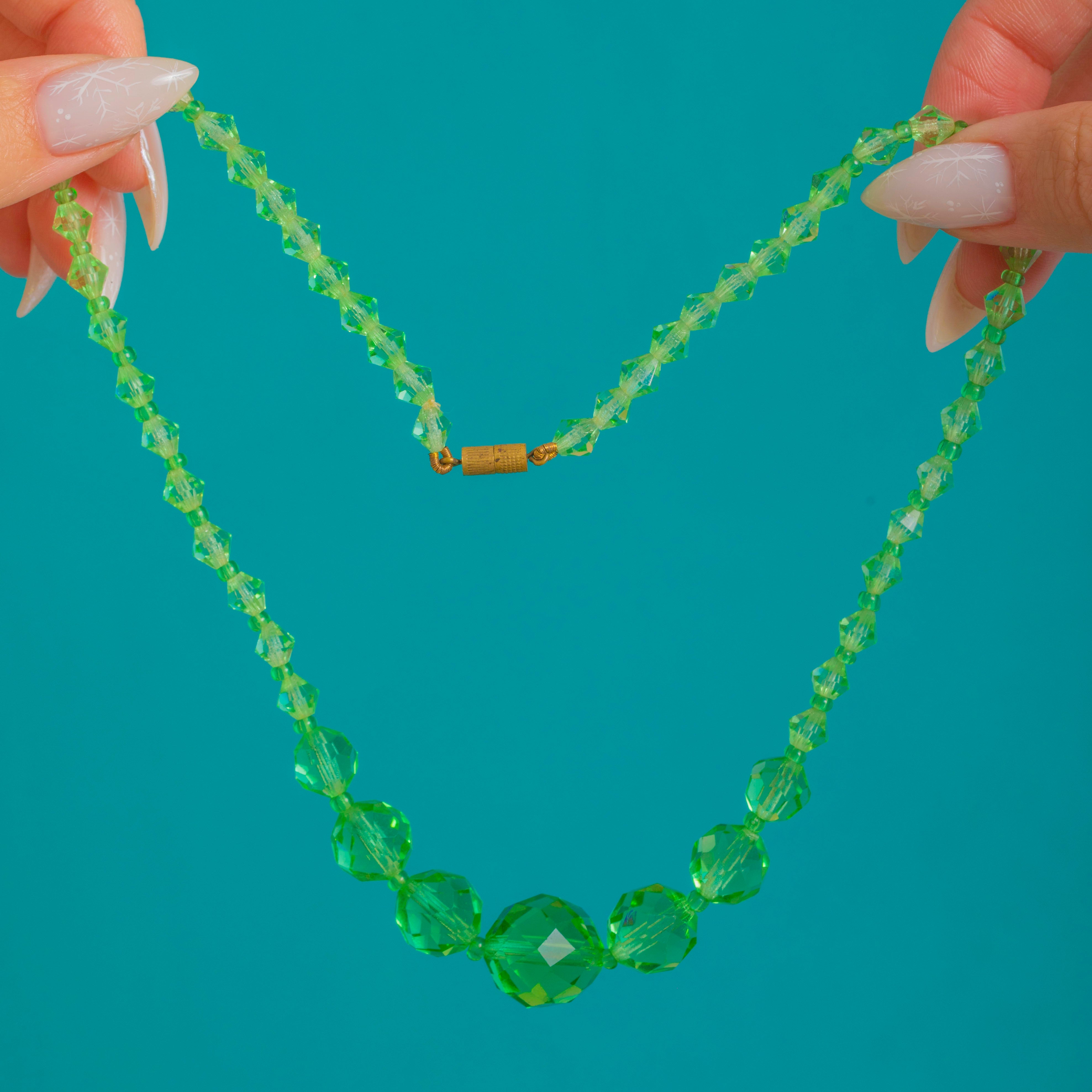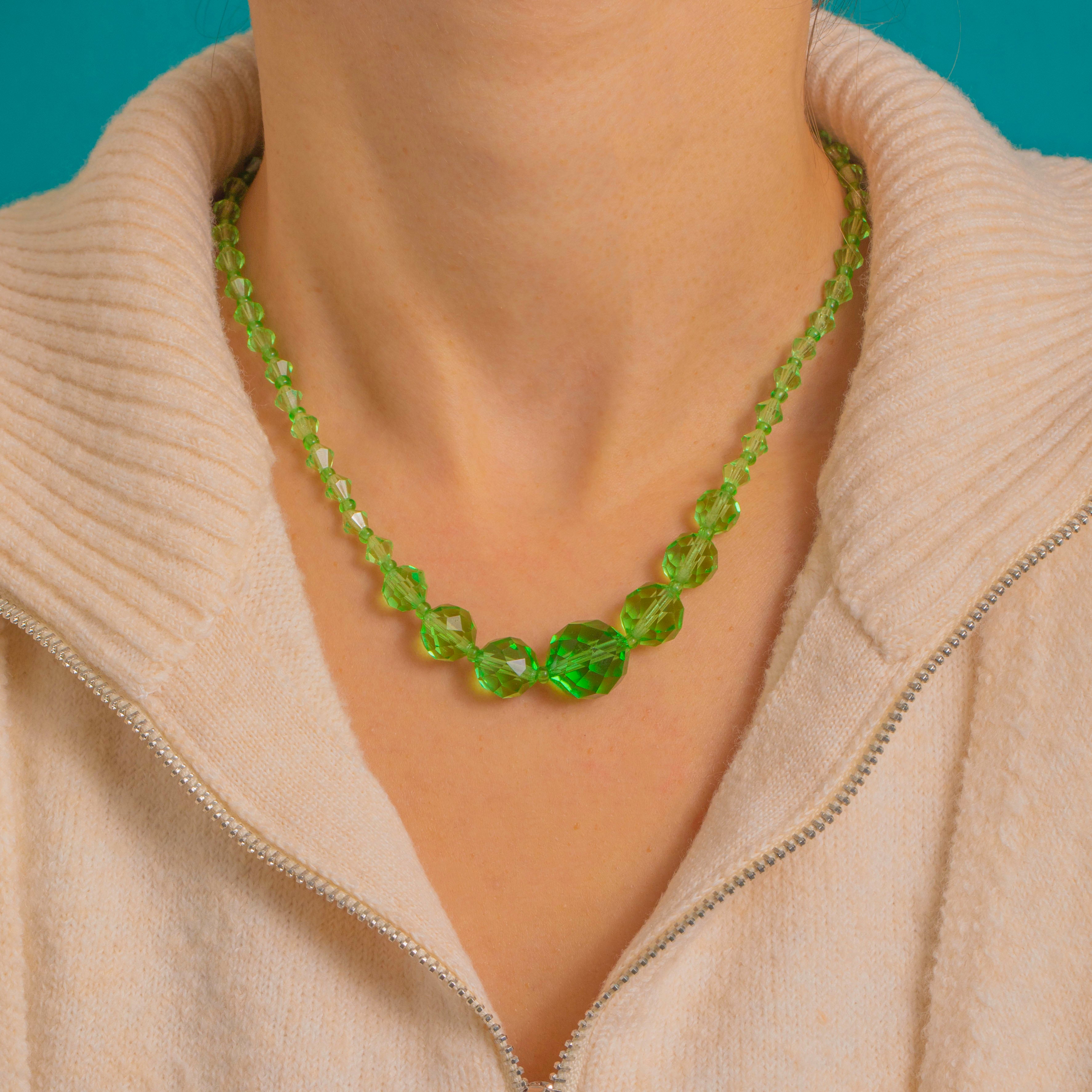 A joyous burst of Art Deco colour, this 1930s necklace is strung with vivid translucent Uranium Glass beads that glow under UV light. The strand graduates to a simple geometric focal, its alternating rhythm of faceted bicone and rounded beads punctuated by tiny matching spacers for a refined, streamlined finish.