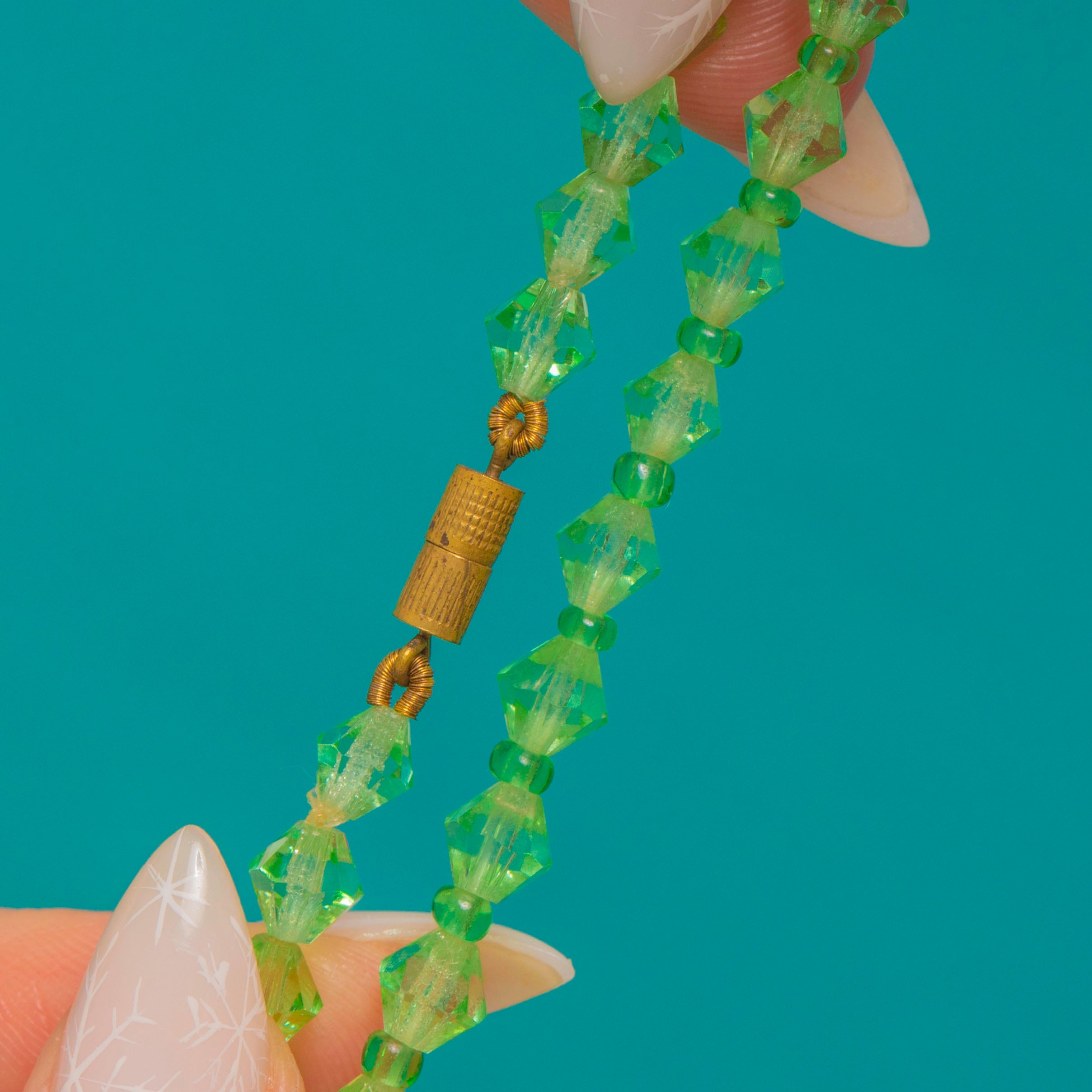 VERY GOOD: The Uranium Glass beads are glossy with crisp facets and only light edge abrasions; no obvious chips or cracks observed. The stringing is intact with slight fuzzing near the clasp, and the ridged screw clasp shows light patina and surface wear commensurate with age.