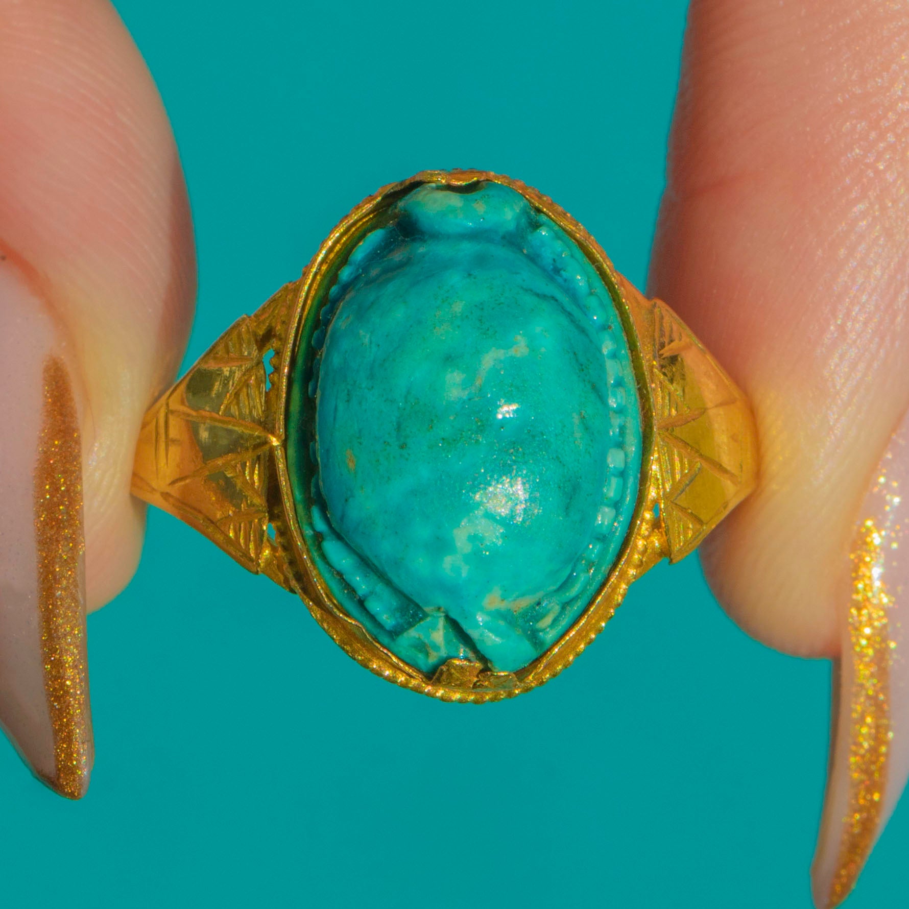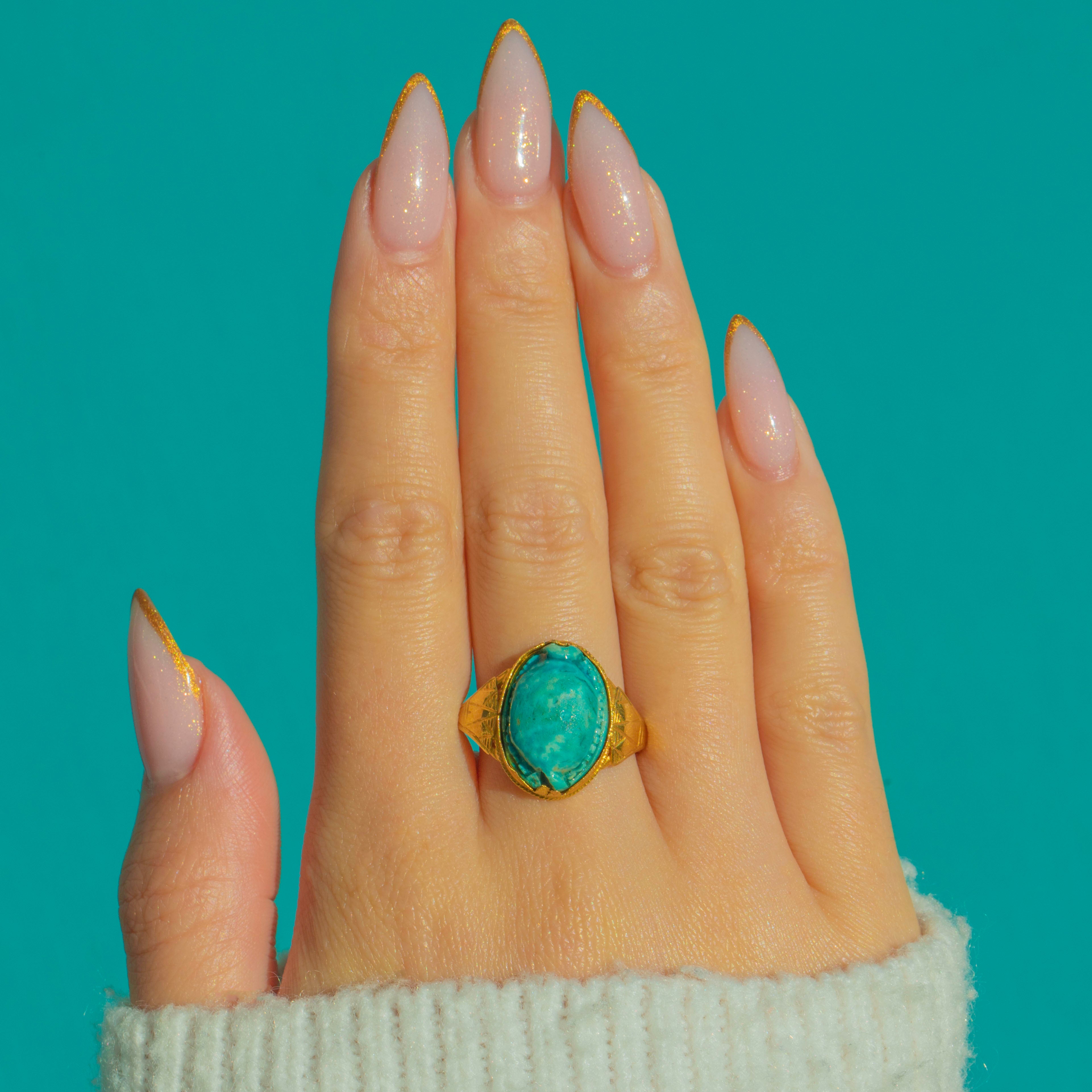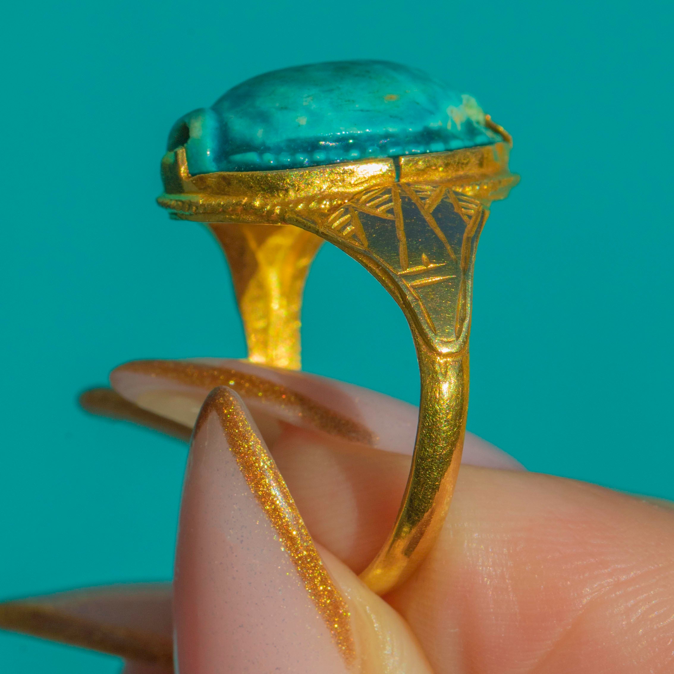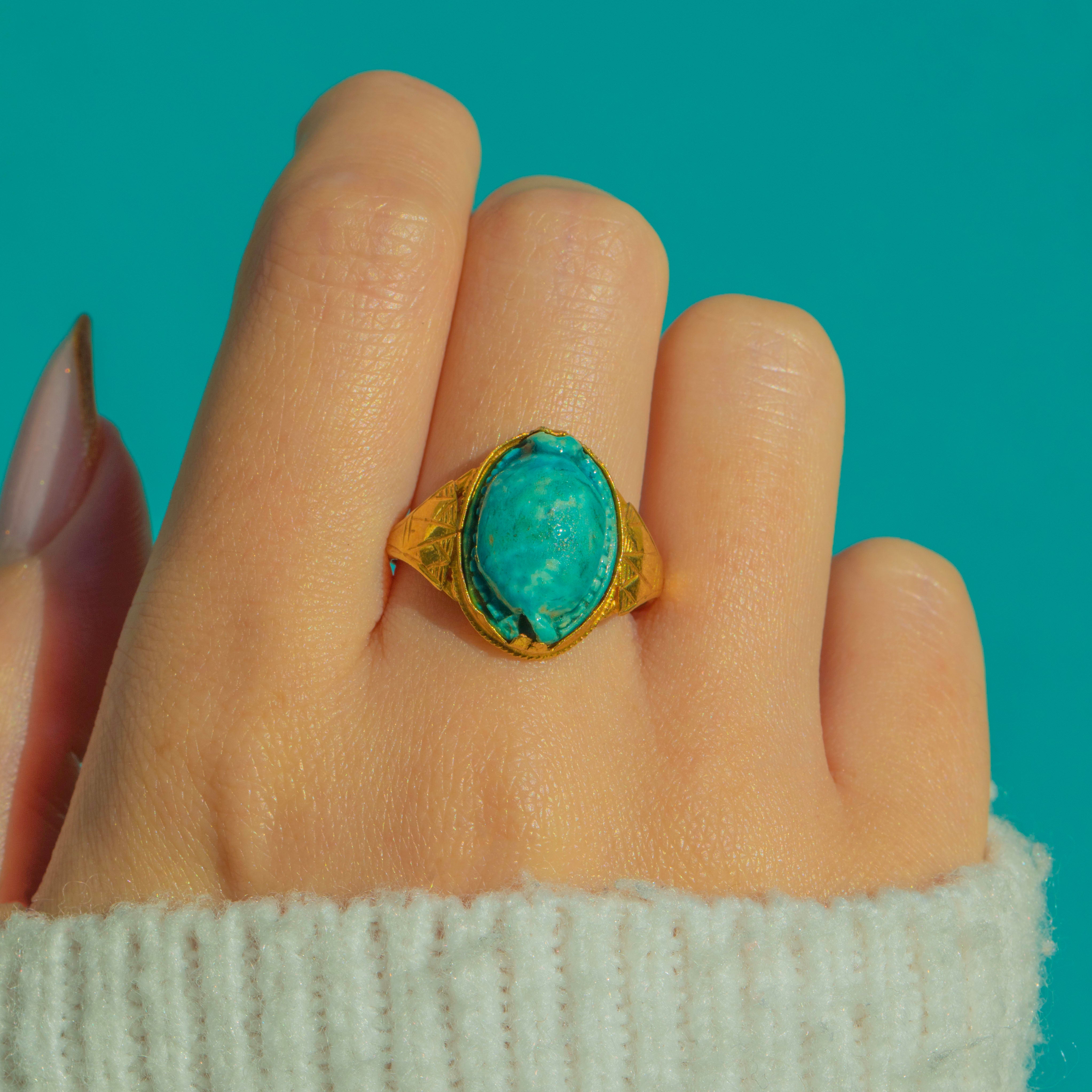 The warm glow of 22ct Gold contrasts beautifully with the cool turquoise tones of the scarab, creating a piece that looks wonderfully sculptural on the hand. An evocative jewel for lovers of history, symbolism, and unapologetically bold design.