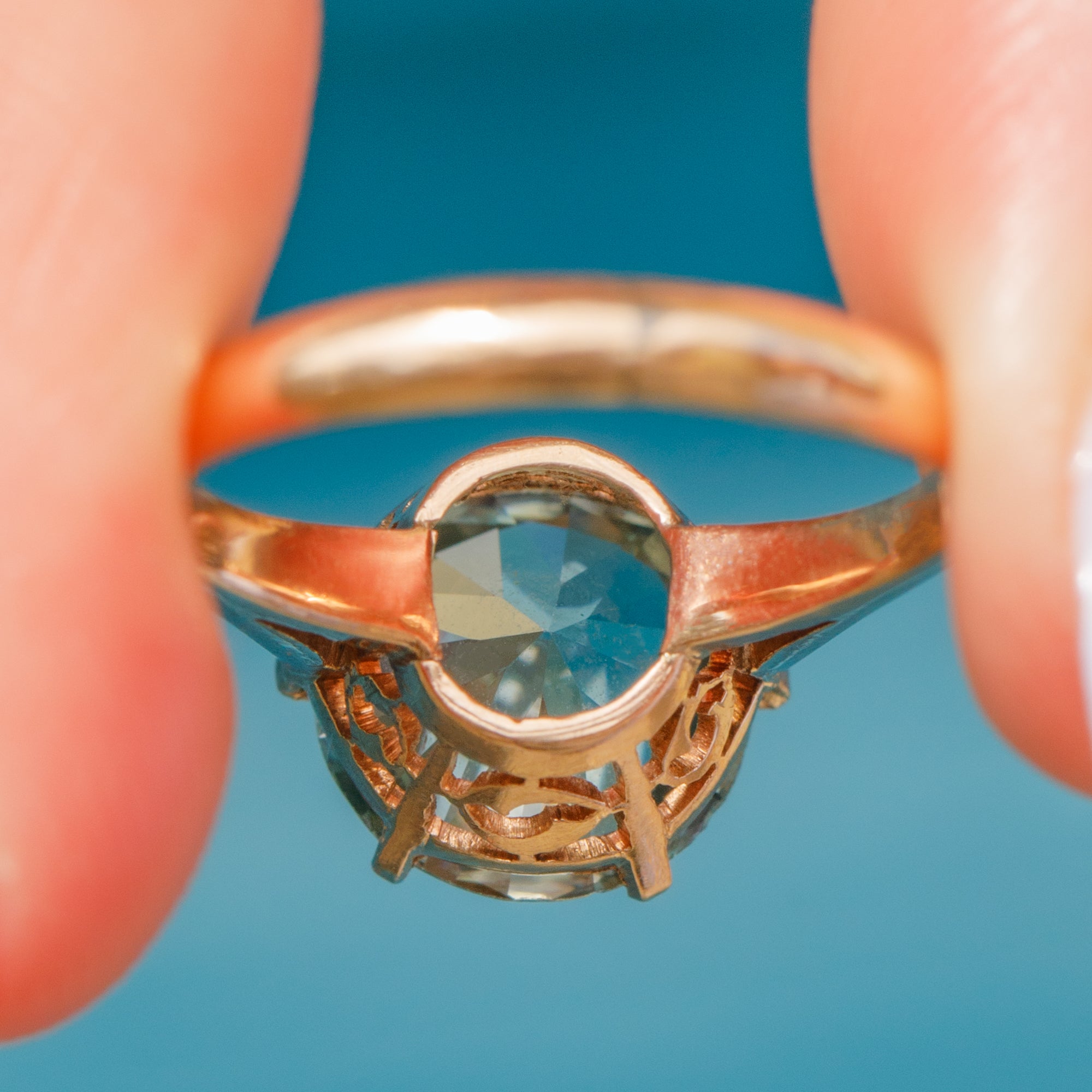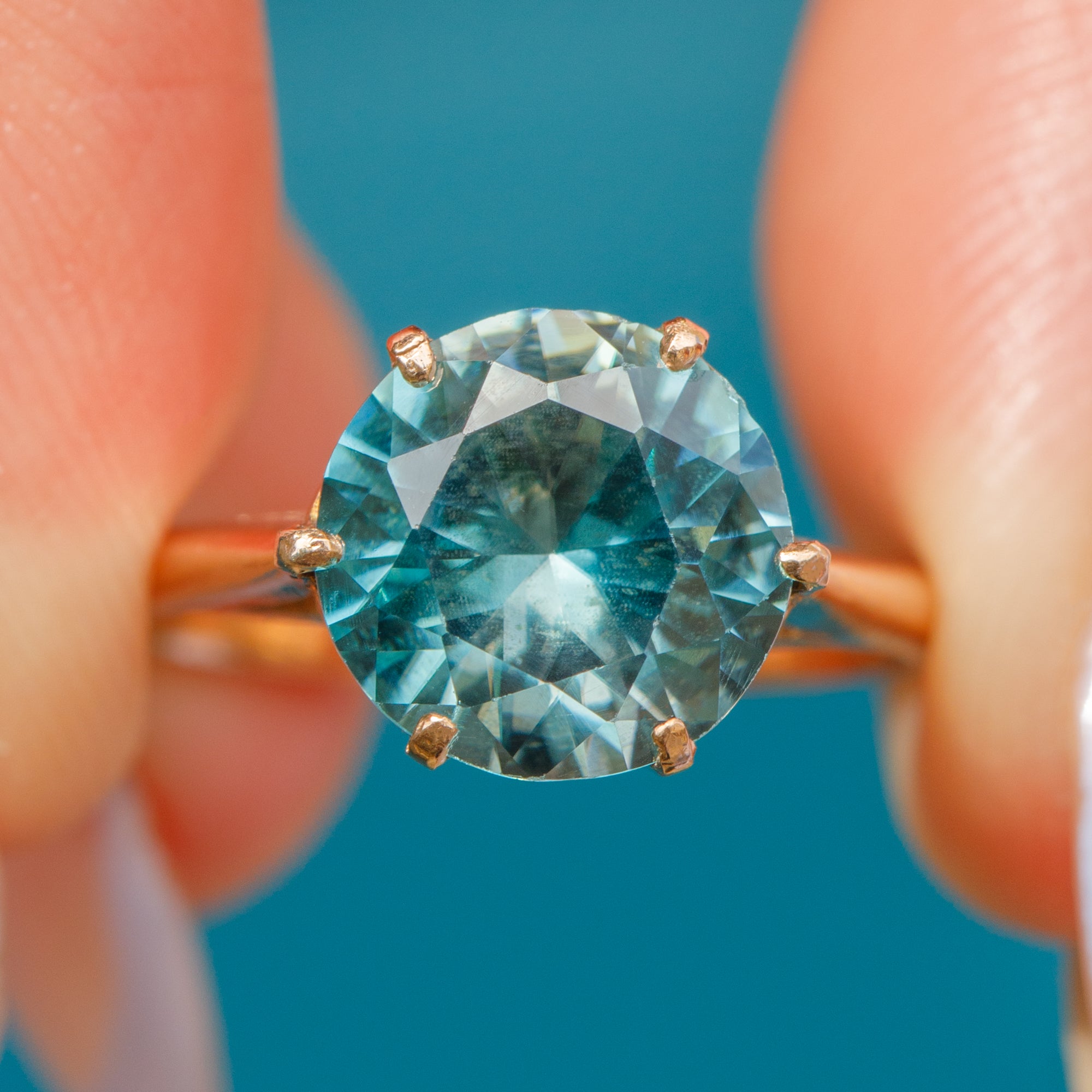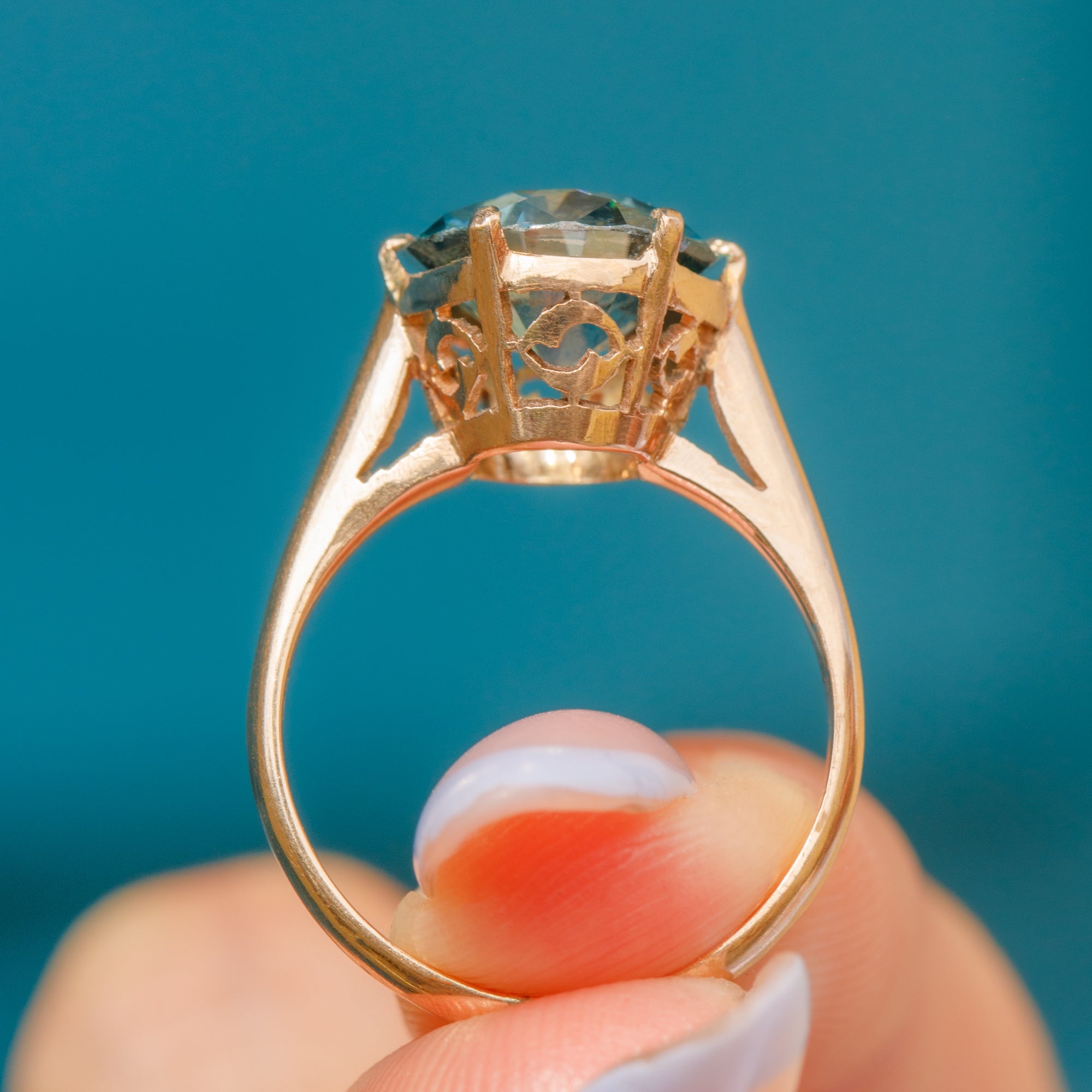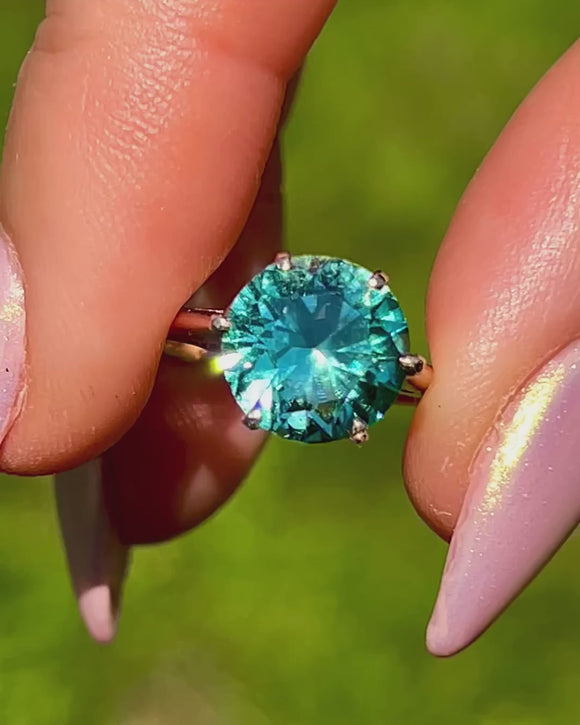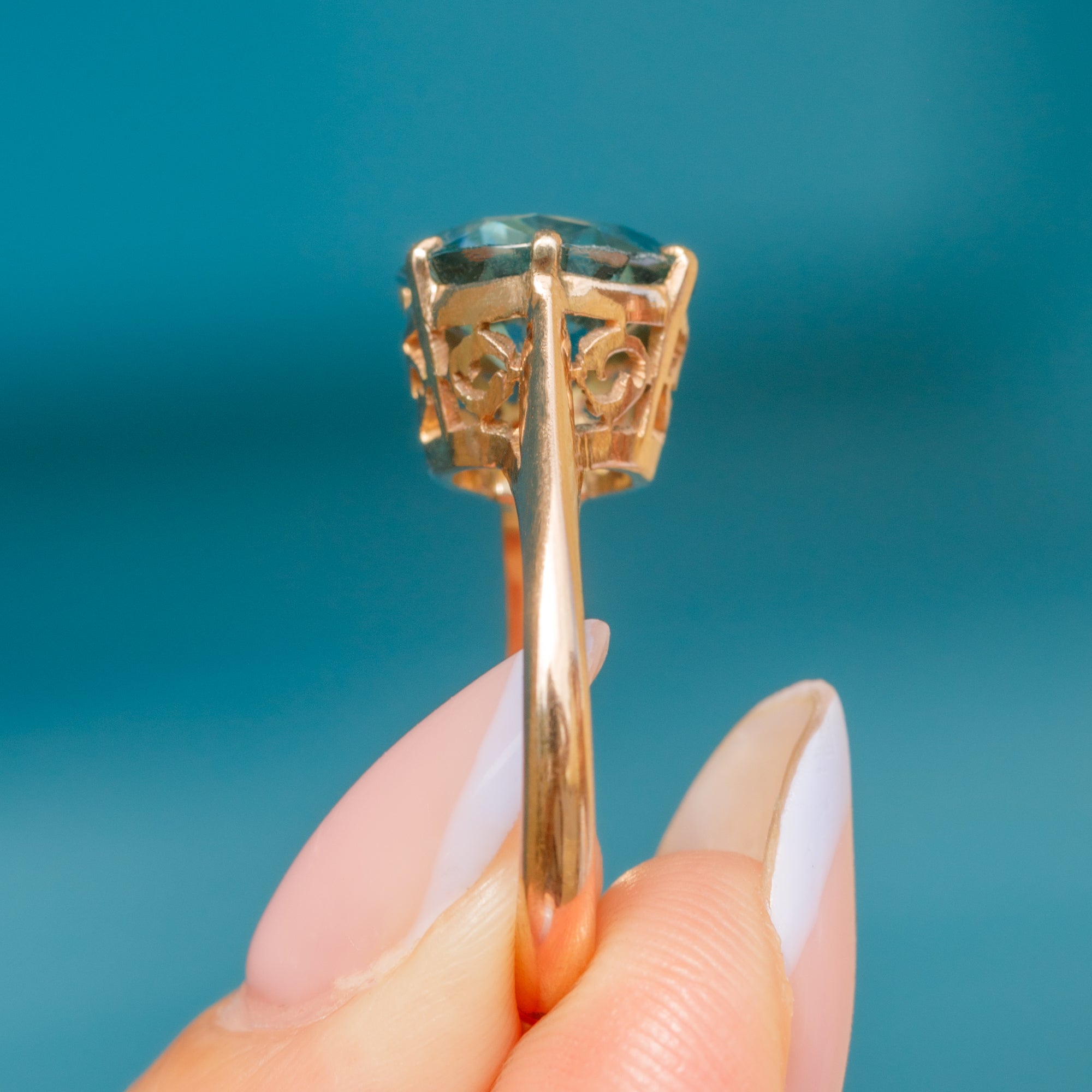 In her centre sits a radiant azure 2.85ct Zircon, faceted wonderfully and revealing icy cool hues as she catches the light. The Zircon is set within warm 9ct Gold claws, with a tall profile and ornate gallery in quintessentially Art Deco style.