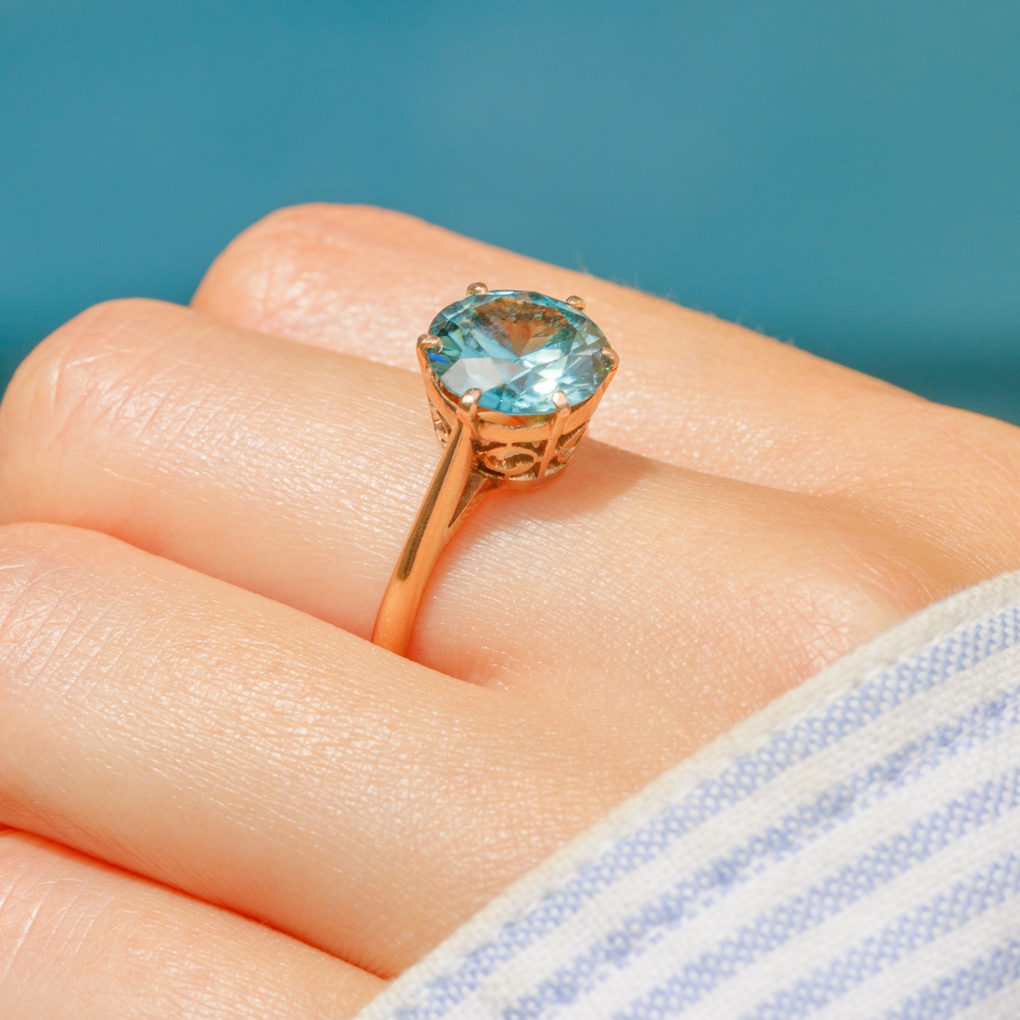Add a pop of colour to your ring stack with this Art Deco 9ct Gold blue Zircon solitaire!