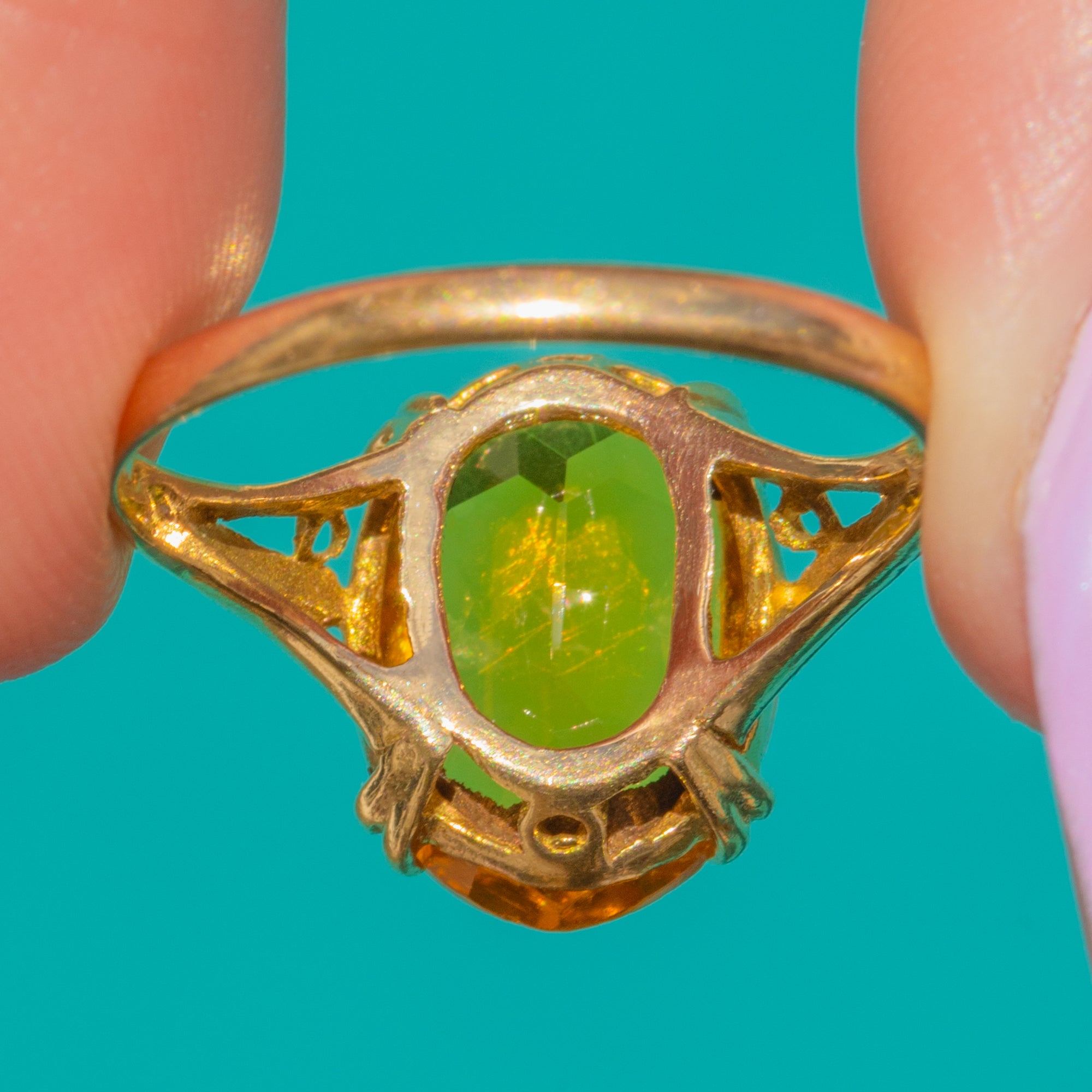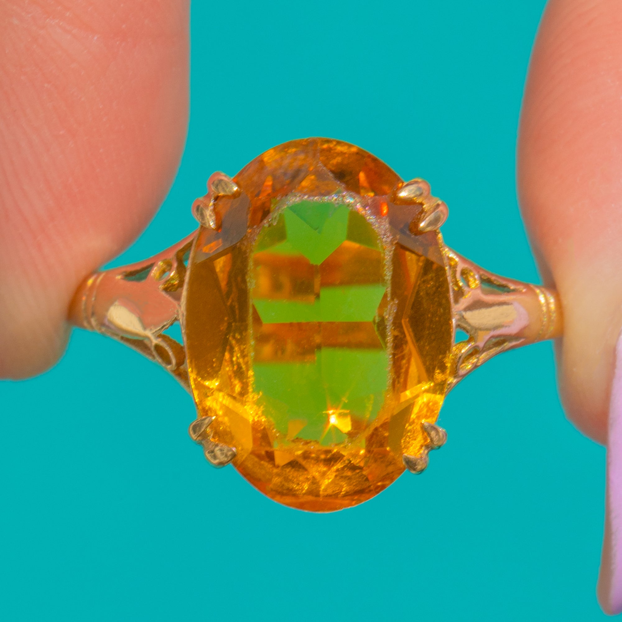 A bold and beautiful Art Deco ring showcasing a luminous Citrine Paste in rich honeyed tones that flash with olive‑gold highlights as the light moves. The oval stone is claw‑set high above the finger, its openwork gallery and foliate, triangular shoulder piercings lending a refined architectural elegance.